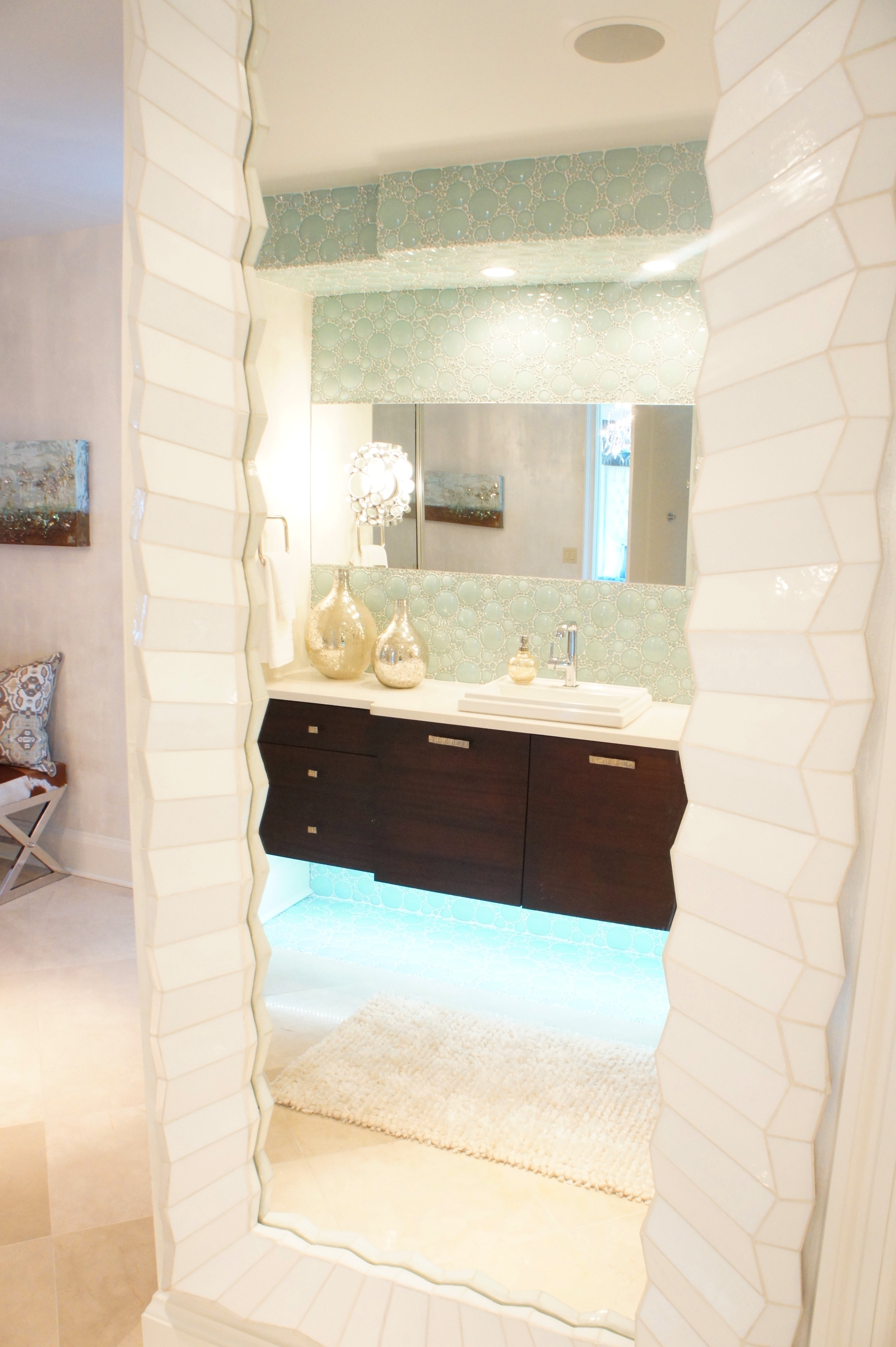 Rather than match the existing travertine underneath the cabinets, where the old cabinets were removed, we ran the green glass tiles down below. This helped reinforce the floating effect we were going for! The three bubble glass sconces were ideal, and looked as if they were meant for exactly this bathroom!