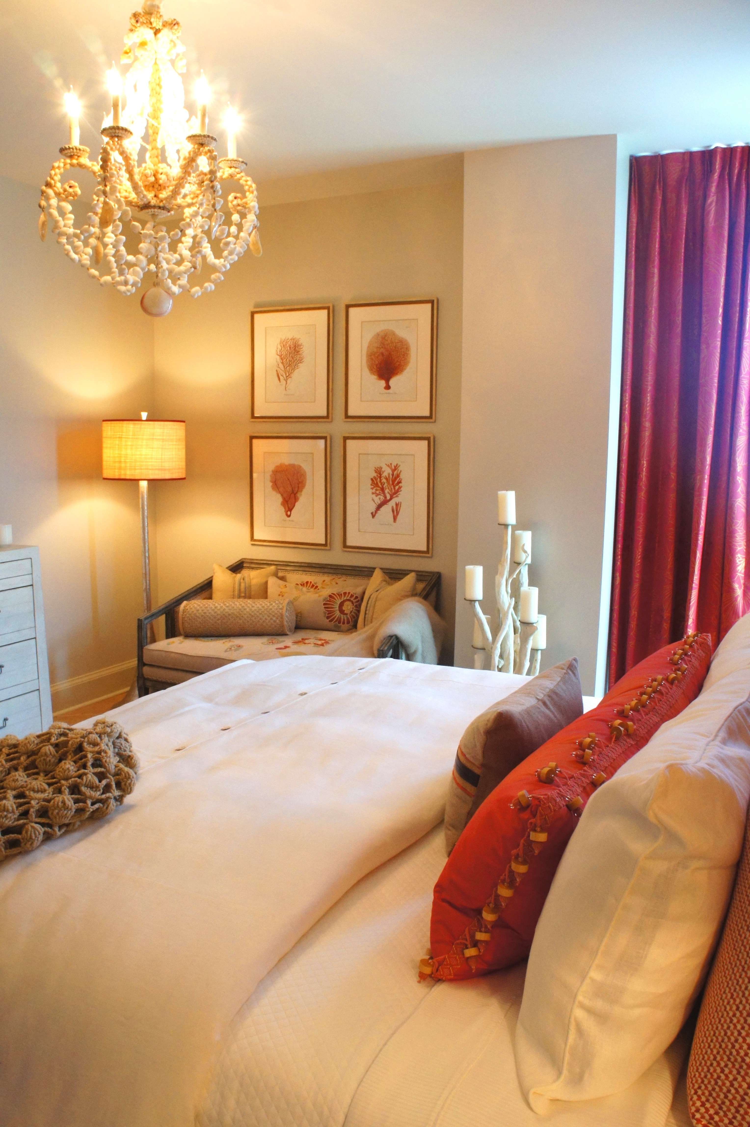 In the corner, we created a cozy nook with a plush settee underneath a set of four framed hand-colored prints. The shell chandelier by Currey Company adds a beautiful touch of coastal.
