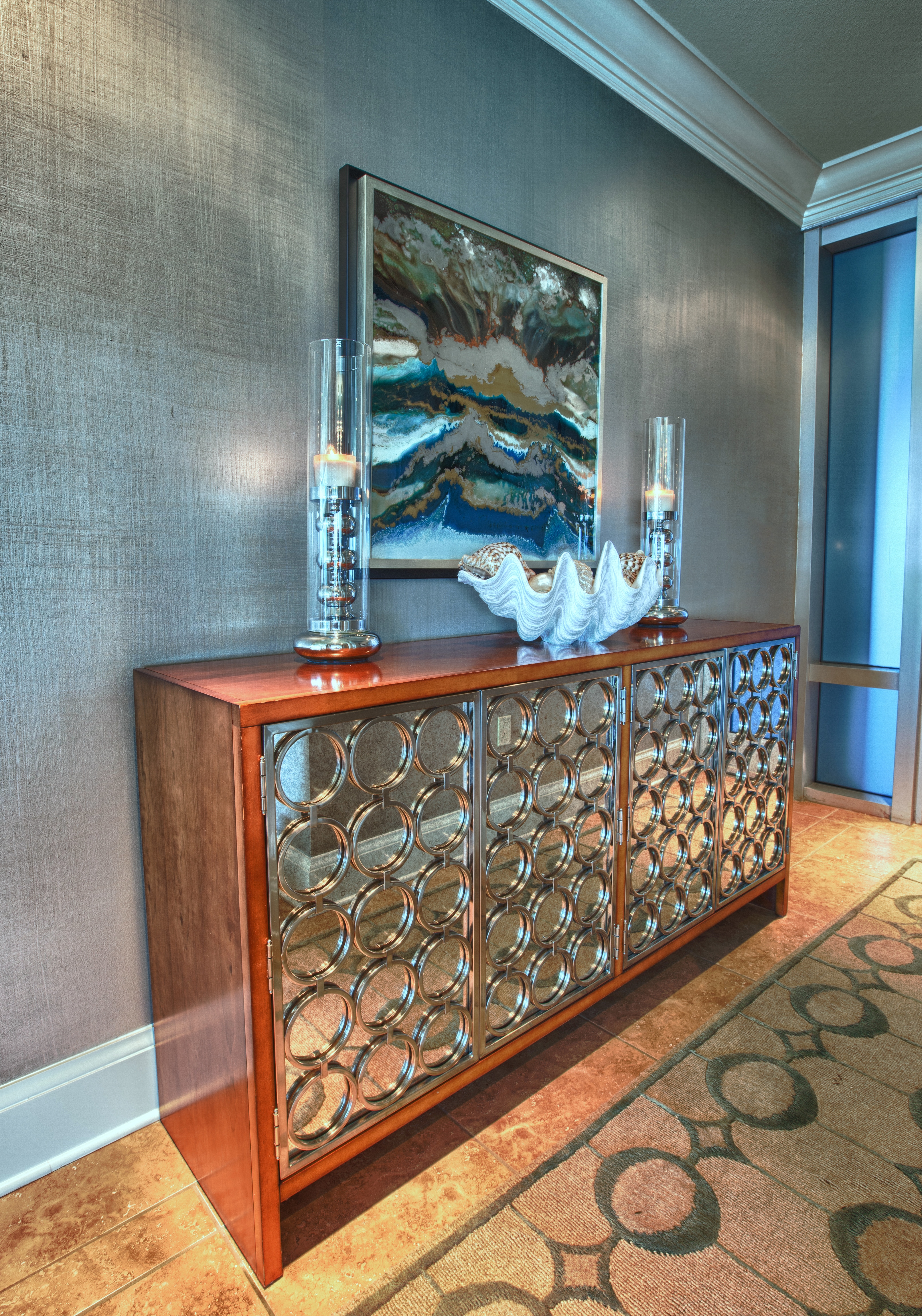 This condominium was a delightful project that I had the pleasure of working on with fellow designer, Joey LaSalle! Our mission was to take this beautiful condo, which had some rather generic finishes and features, and remodel it in a way that would play up its best features (mainly the views!) and update the rest. We wanted to remain in keeping with the architecture of the building, which is more modern, and bring in some coastal elegance, with touches of rich luxury! The result is very beautiful, rich and restful…