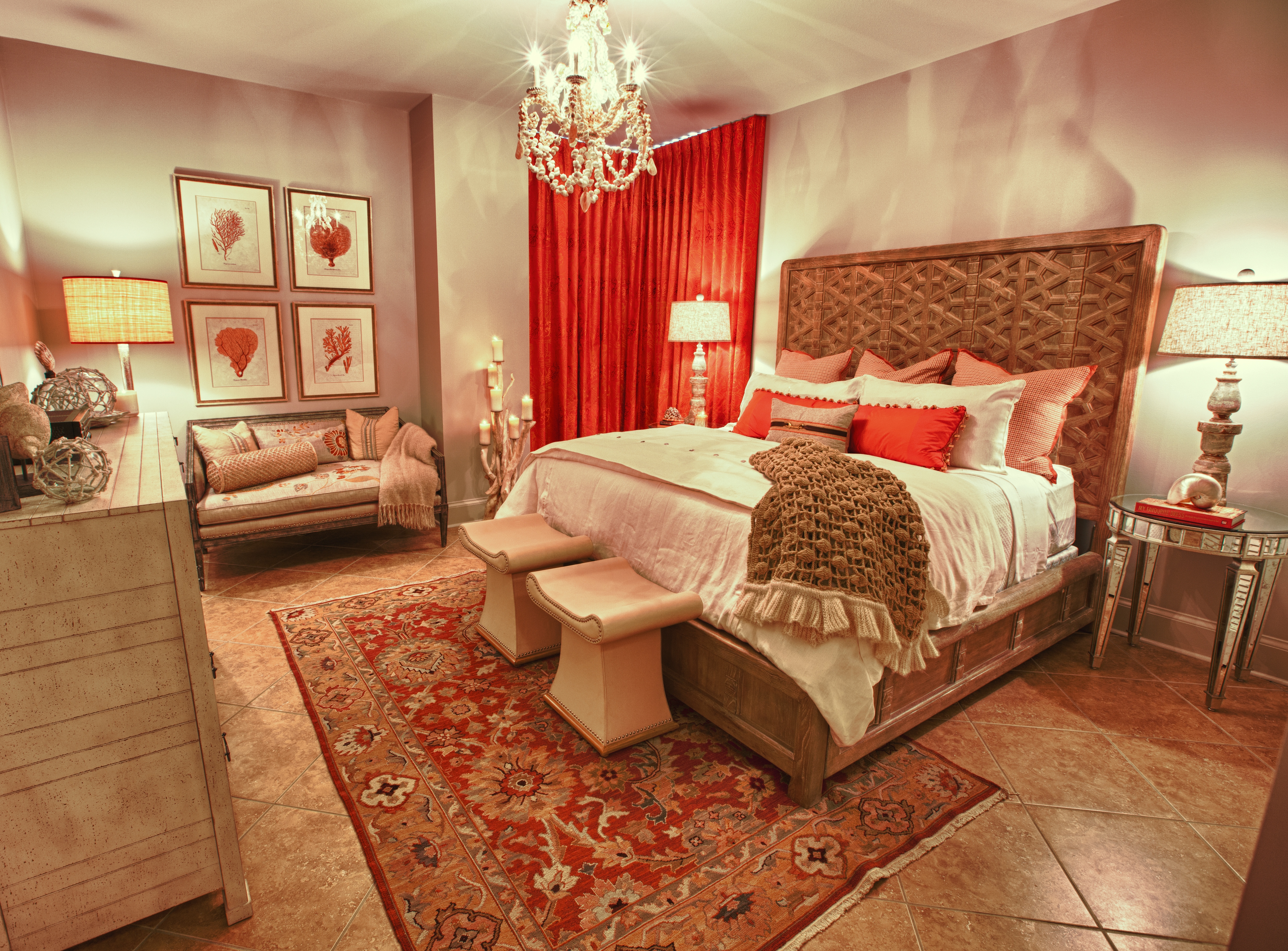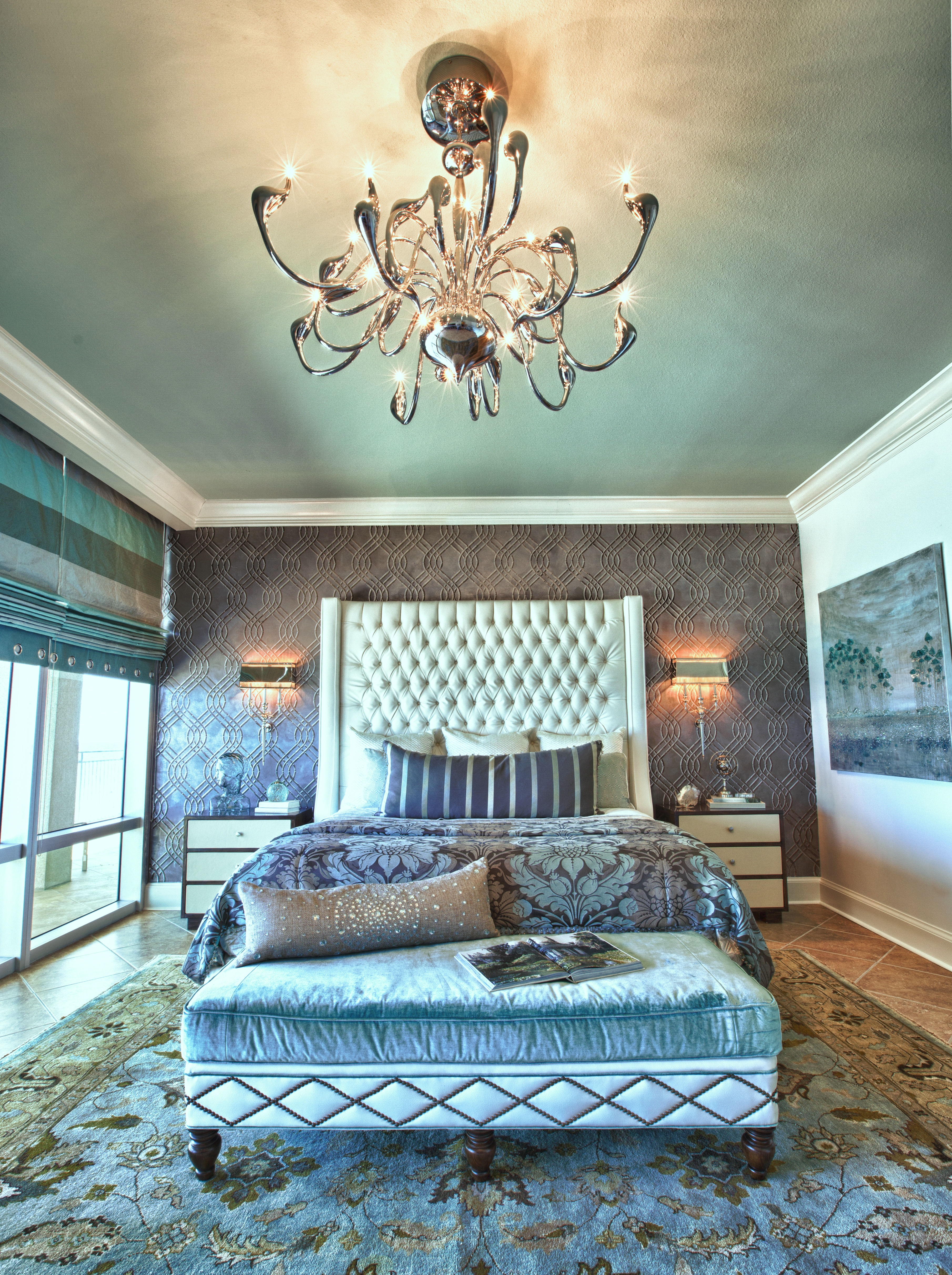This room definitely makes a statement, with its grand cream leather king bed, whose lightness is emerging out from the almost 3-D faux finish on the walls. Thank you, Krista and Cindy with Ufauxrea for all the wonderful work you do for us! This bed wall finish is a soft charcoal geometric pattern, with highlights in glass beads that help to create the illusion of depth. The chrome chandelier adds some excitement to the room, while the traditional rug and beautiful damask foot blanket help to ground the design for a more transitional feel.