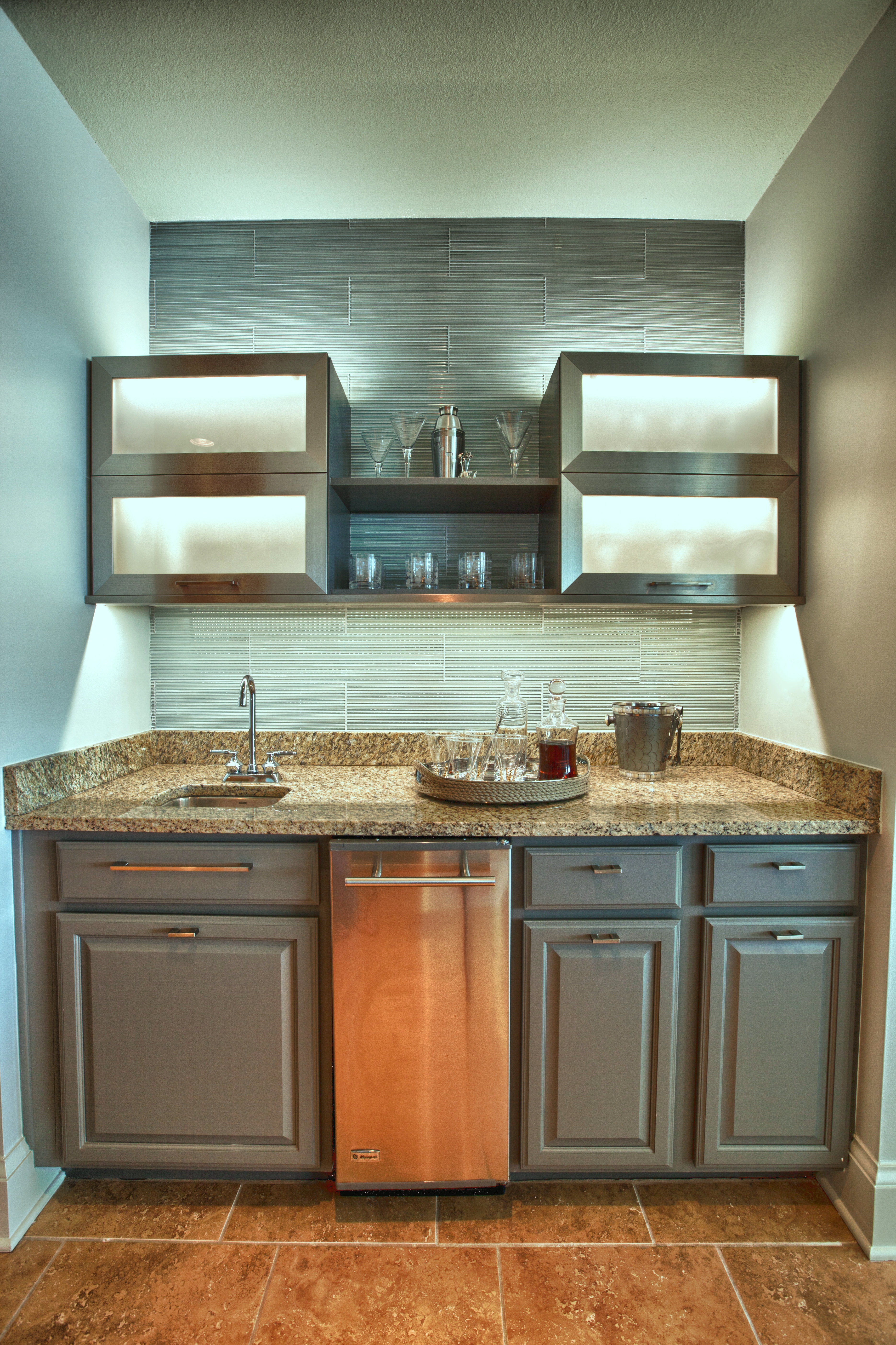 The upper cabinets above the wet bar were removed and replaced with these contemporary stainless steel-framed cabinets and shelves. The l.e.d. lighting helps to accent the new, fresh tile.