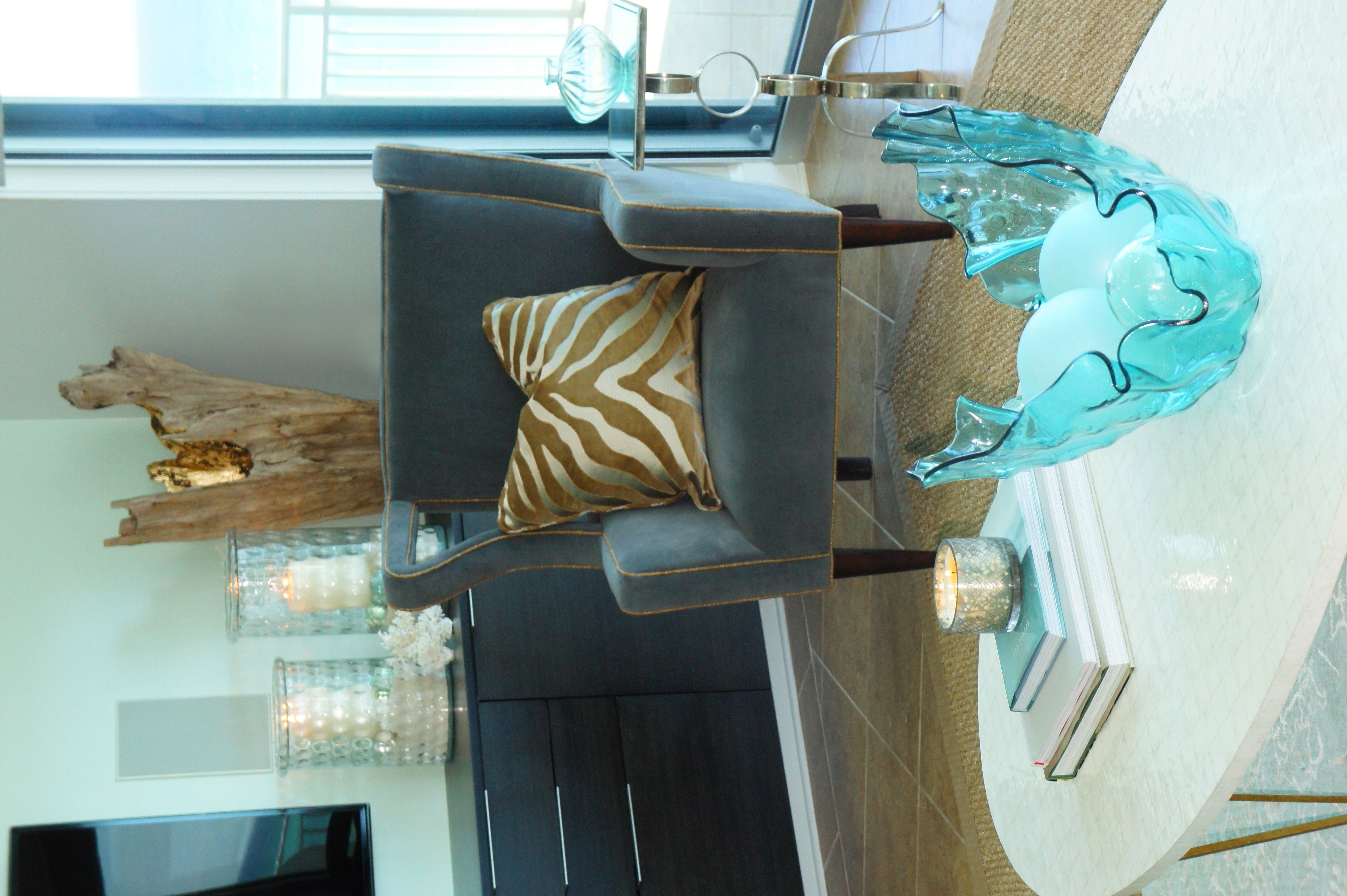 Welcome to the Living Room! We aimed for a cool, natural, relaxing environment with color accents to tie the water in, as well as some touches of gold.