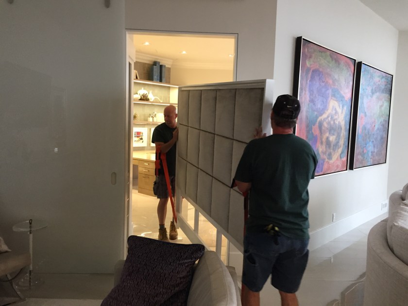 Here comes my beautiful headboard!!!!! Following them like a lost puppy as they bring this in.