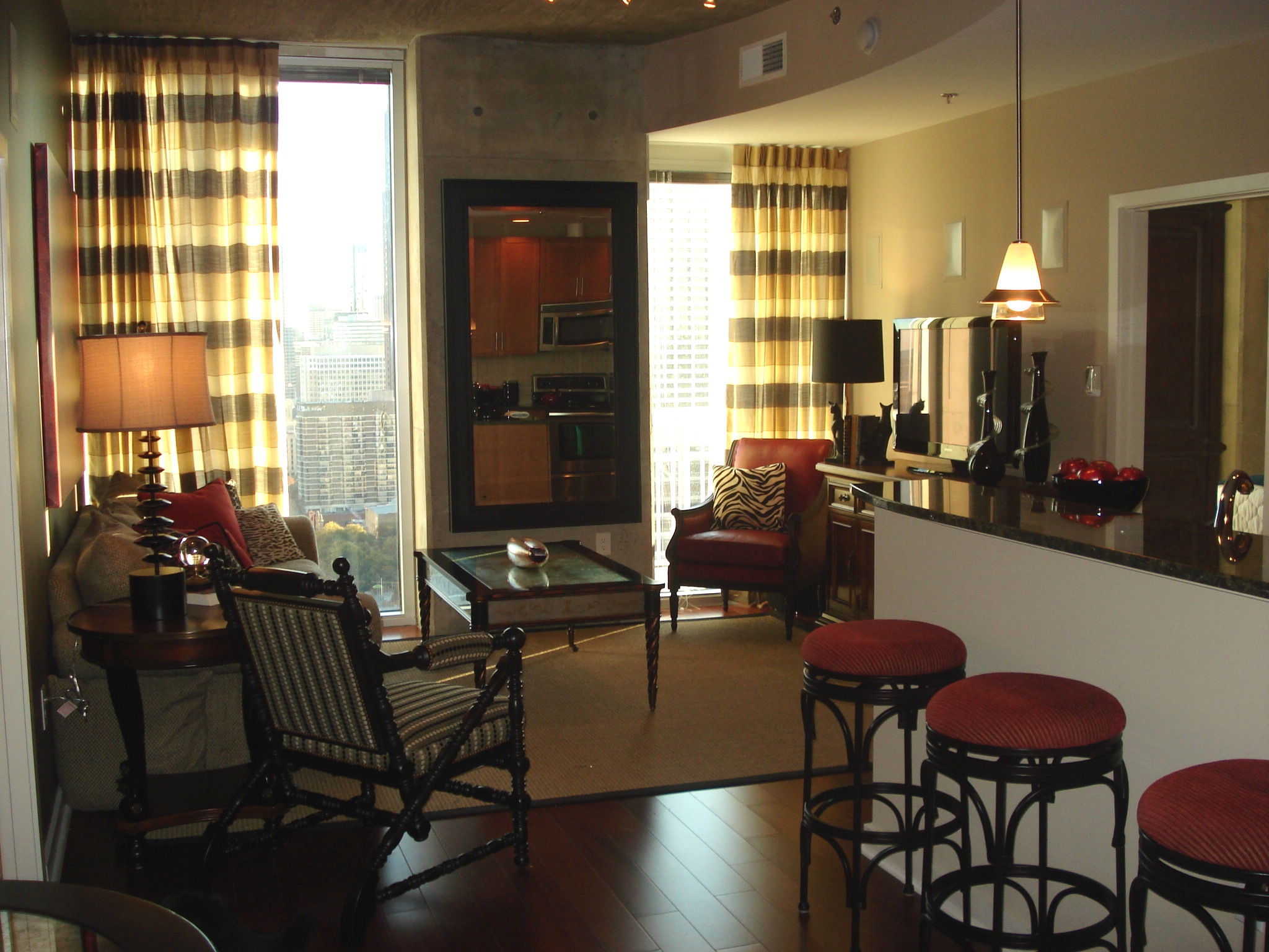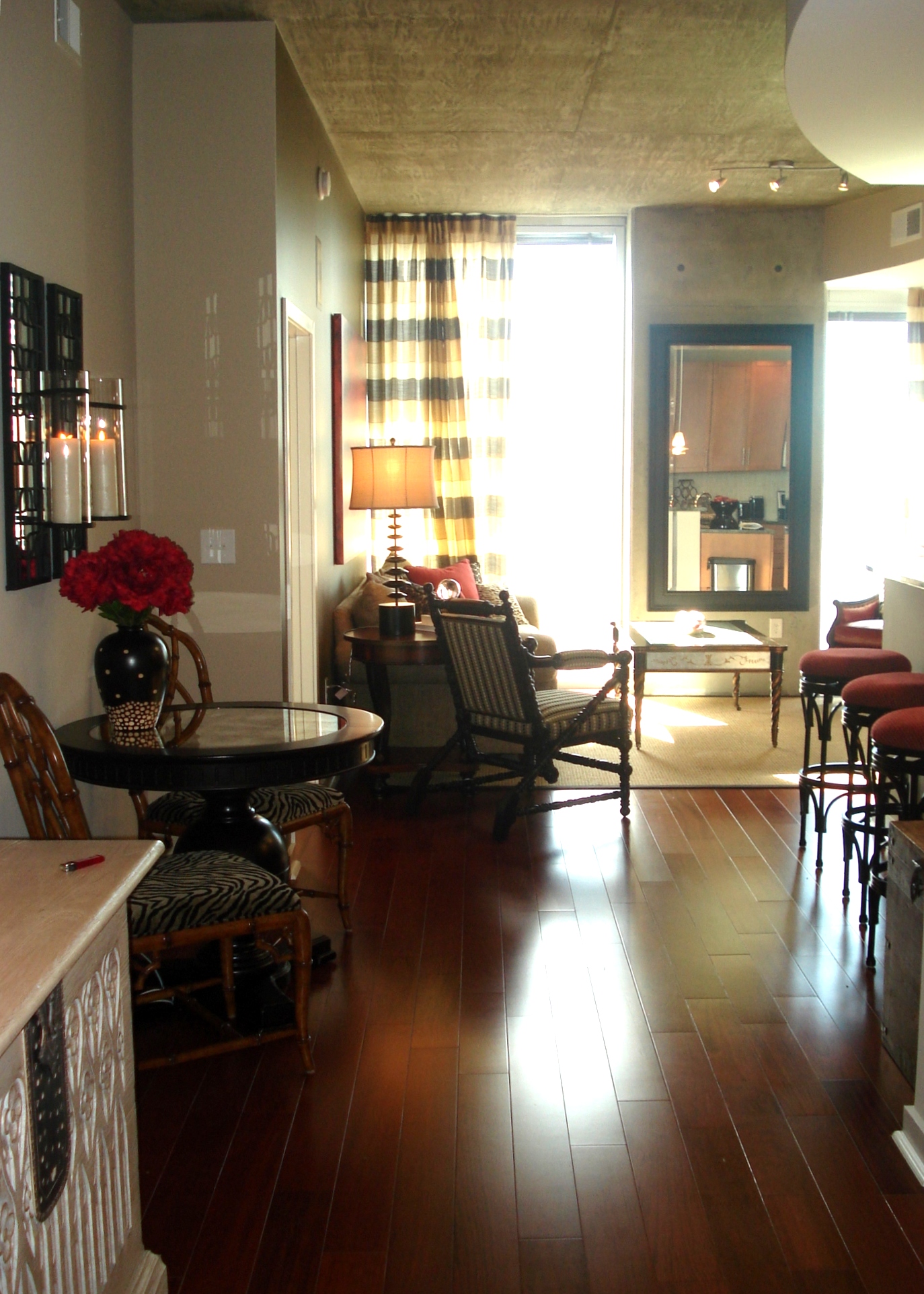 This is a view of the Living Room from the Entry, except for the fact that my camera did not capture the city view. The warm wooden floors provide the perfect balance to the cool concrete ceilings and columns. We added more character to the visual palette be using a mixture of wood finishes and painted black finishes on our furniture and accessories. The cocktail table and the bistro table are both black with antique mirror inserts. The wall sconces over the bistro table and chairs help to define the area, and also provide the opportunity for a romantic candlelit dinner! The overall color scheme was a neutral black, gold and beige, with dramatic but sparing use of red in the accessories and smaller pieces of furniture.
