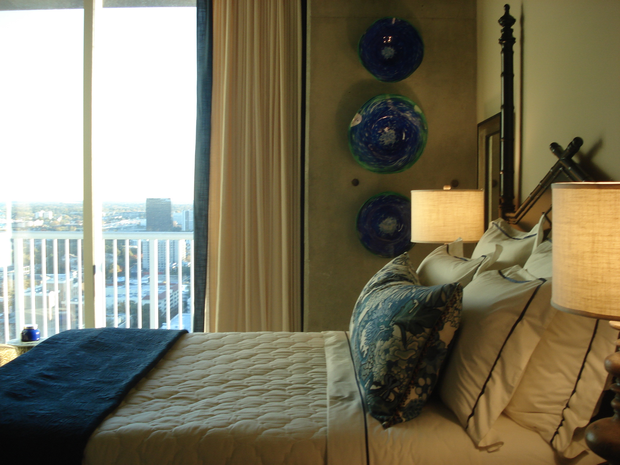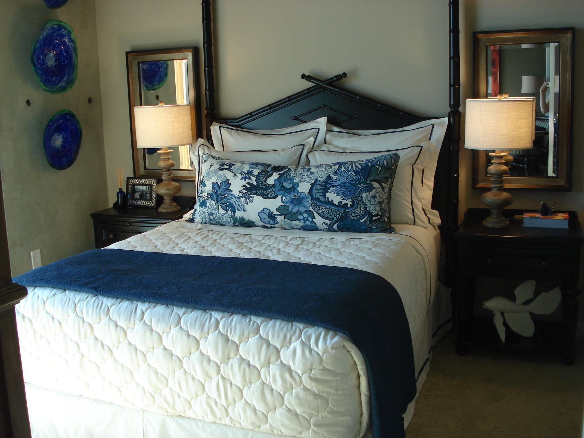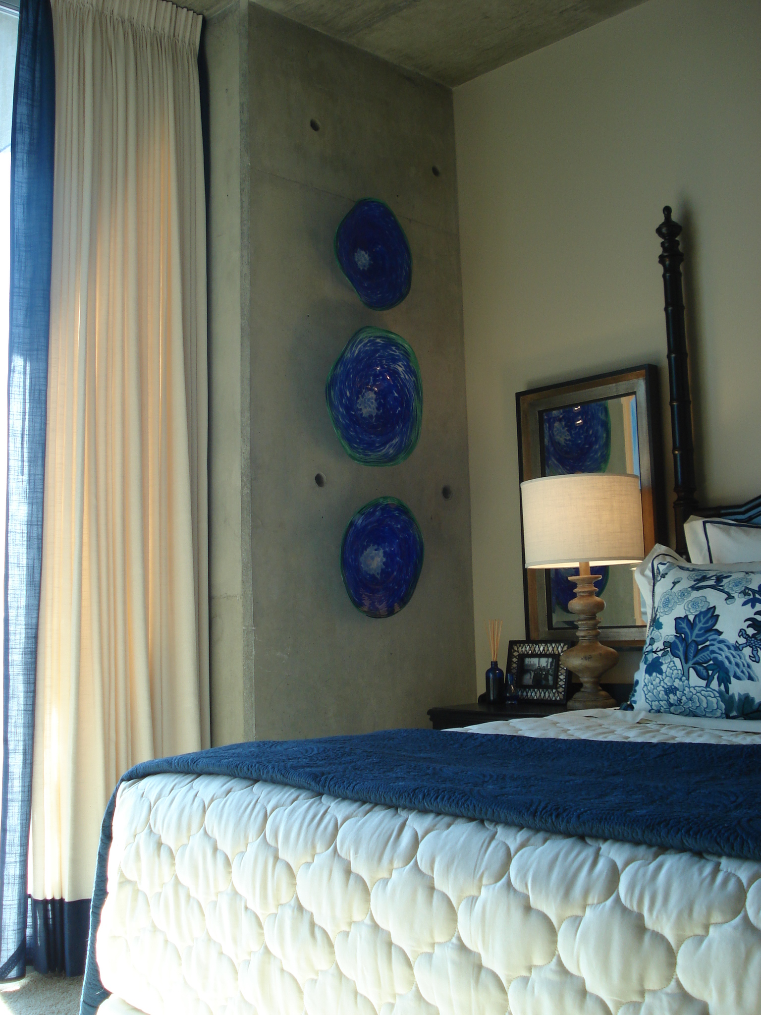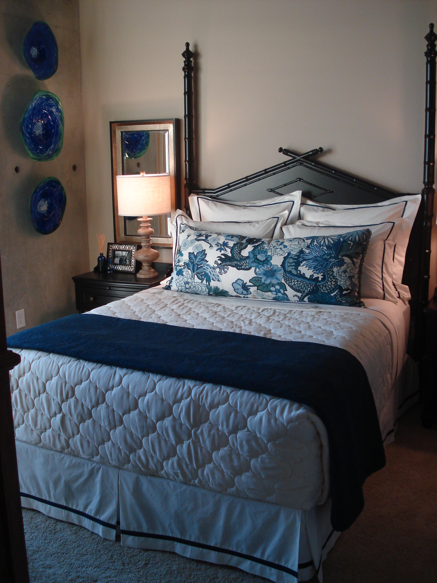 This is a view of the secondary bedroom in this unit. The color scheme was derrived from my client’s existing television armoire, which was a natural wood tone, with navy accents. I first found this amazing dragon print from Schumacher. I knew I wanted this fabric to be the focal point of the room. I did this by allowing the large pattern to show fully on one large body pillow, and giving it a solid cream and white canvas, or backdrop, with the Legacy sheeting and Homestyle Bedding Coverlet. The dark blue coverlet helped to dress the bed up and add an extra textured layer. The body pillow is trimmed on the ends with a hanging blue and brown beaded fringe. Because the Drexel Heritage headboard had such an interesting shape, I did not want to detract from it by adding any art over the bed. Instead, I added depth to the room with matching mirrors over each nightstand. These mirrors reflect the lamp light at night for added lumination. I had an artist custom-make the art glass sculptures hanging from the concrete column. I love the juxtaposition of the smooth, reflective glass on the rough concrete, and the bright burst of color against the mottled gray. I cleaned up the corners of the bed dressings by envelope-wrapping the top coverlet. Not only does this look clean and allow us to see the blue silk-trimmed bedskirt, but it also provides a tight “snug-as-a-bug” feeling when crawling in for the night.