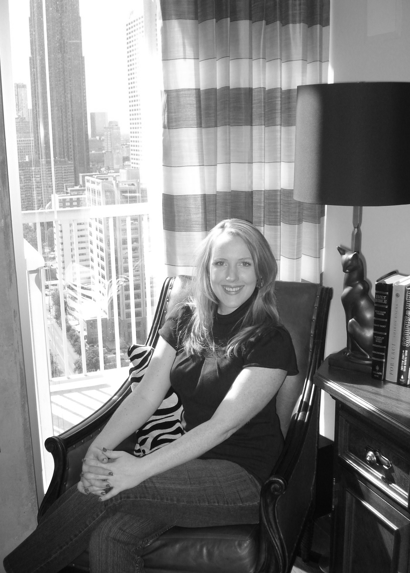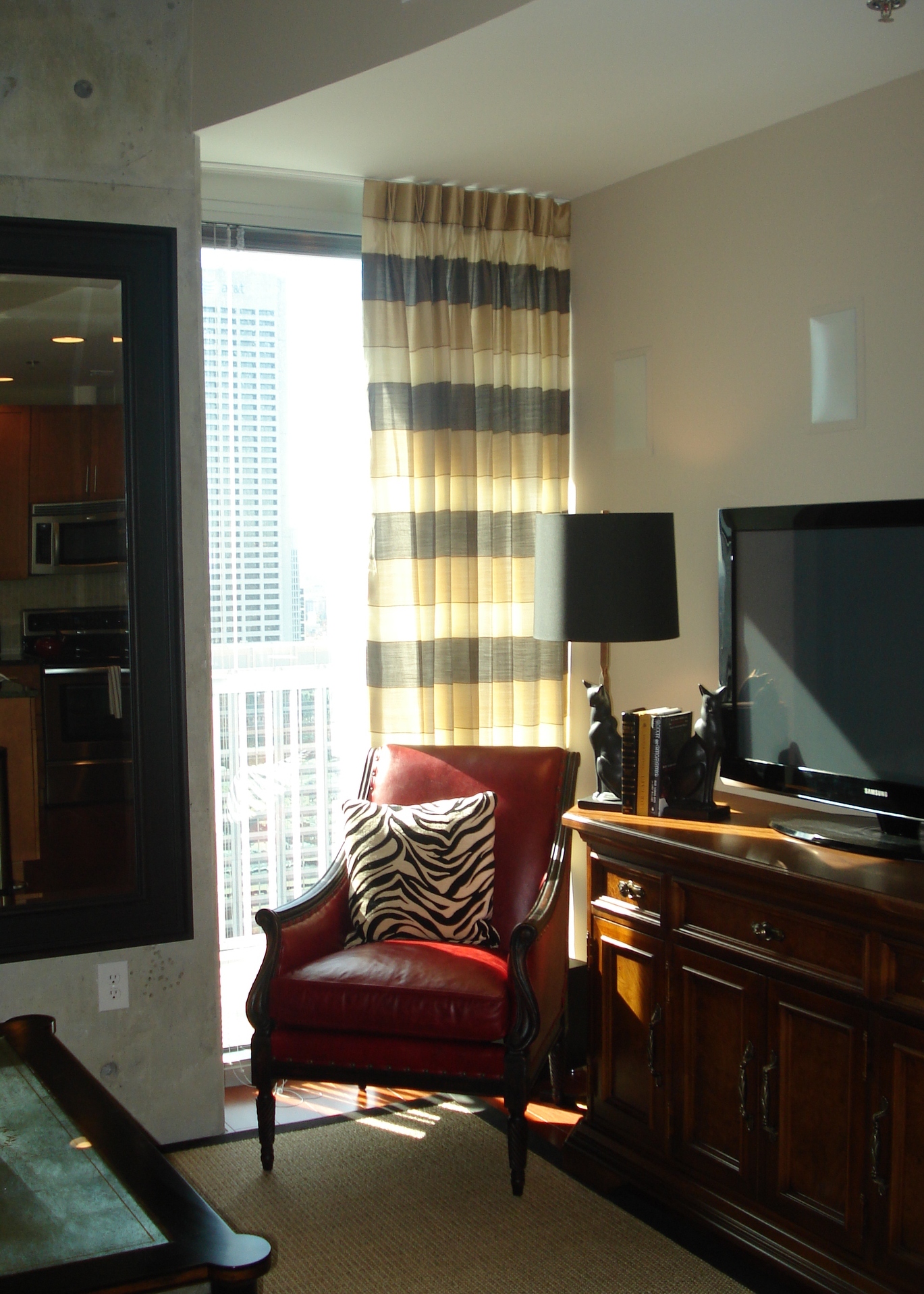 This view of the Living Room shows the great city view, and the beautiful red leather chair I found. Having one dramatic accent chair like this, placed opposite a heavier sofa and chair, helps to balance the visual weight of the room. The fact that it is in the corner with a floor lamp makes it a great place to read a book, and the zebra pillow provides the perfect amount of pattern and texture to make it a focal point in the room. The television console from Stanley Furniture was the perfect size to house all my client’s audio/visual components, and helped to break up the black.