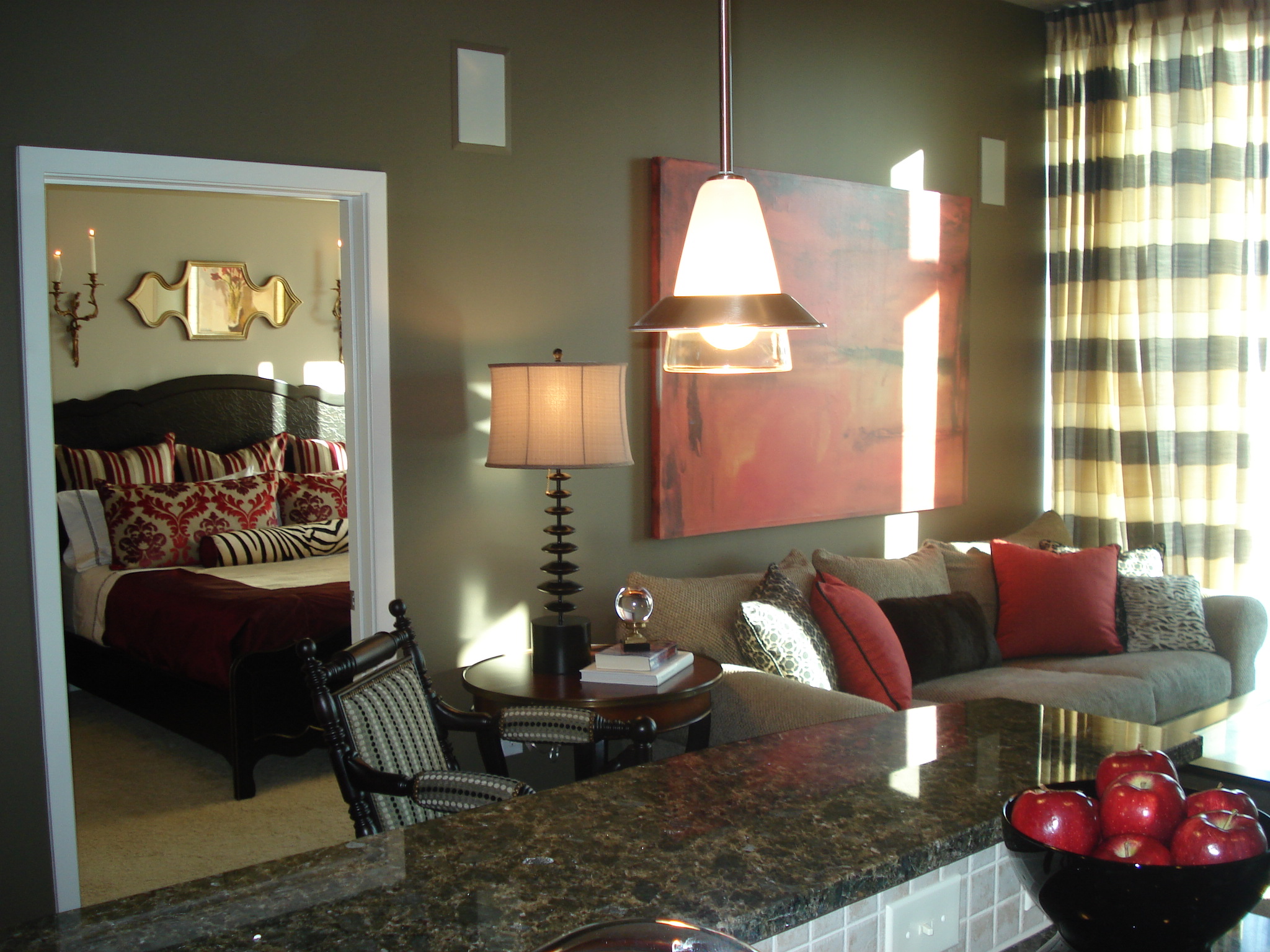 In the above photograph, I am trying to show how the colors in the Living Room transitions into the Master. You will see that I used the red as a common grounds for both rooms, but added rich plum and eggplant to the Master for an extra feminine touch.