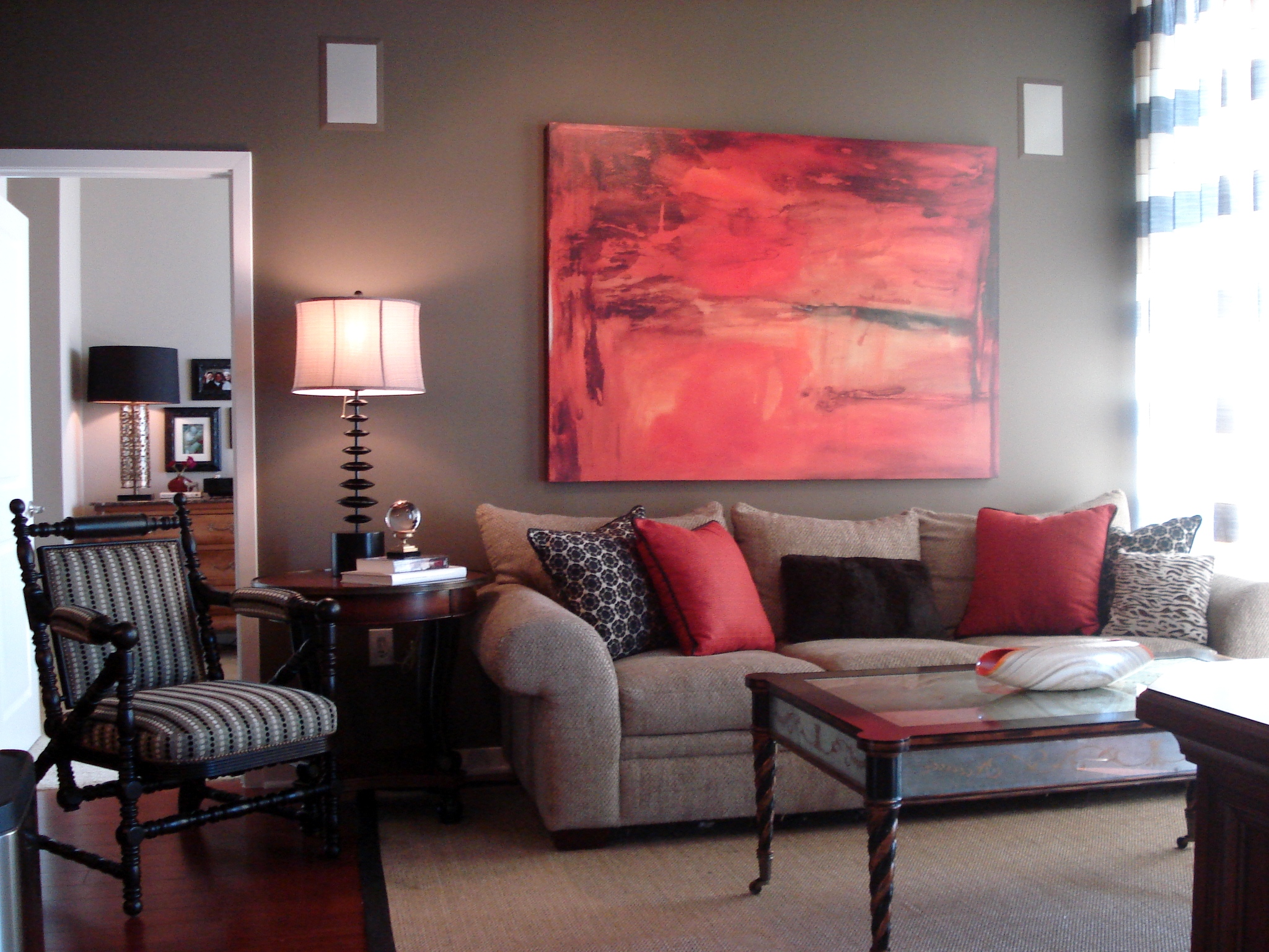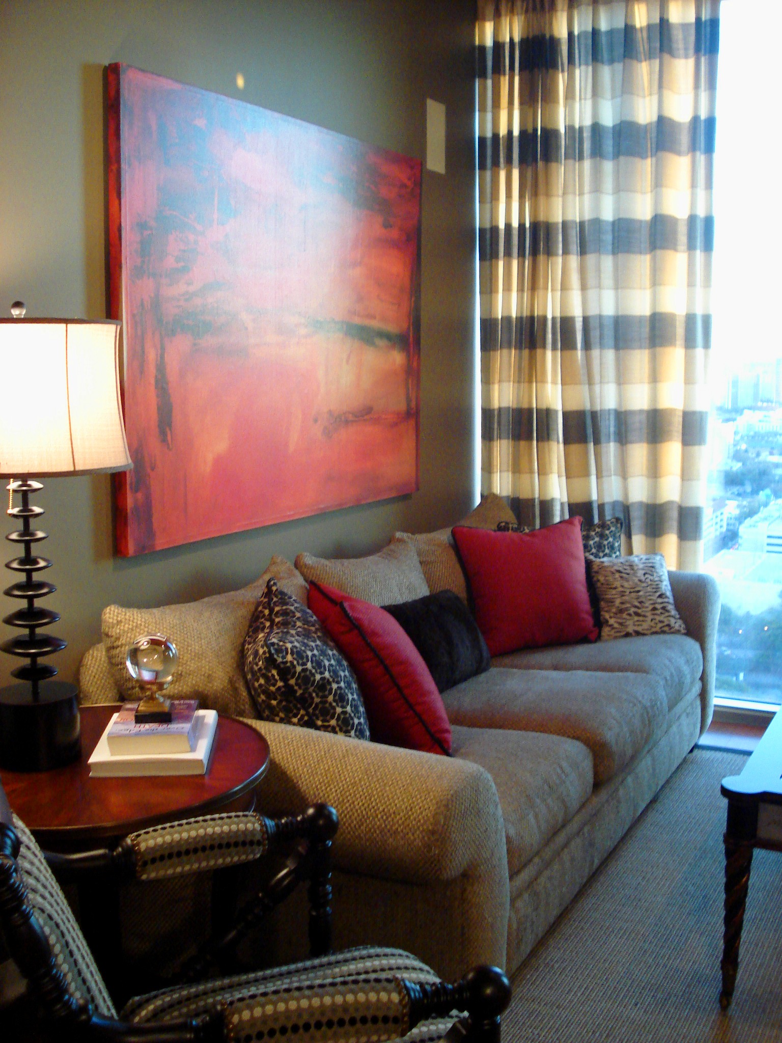 The sofa was the client’s sofa. She loved the comfort and the cats loved to crawl under it and hide! For this reason, we chose to keep it and jazz it up with some new pillows. Two of the pillows are out of a modern, geometric leopard print from Robert Allen. The two red pillows are actually tone-on-tone fretwork from Schumacher. Both the leopard pillows and the fretwork pillows are corded with leather braided cords, for a contrasting texture. The center pillow is made from faux fur. The painting was my client’s painting, and was the inspiration for our color scheme. I felt that the lamp was perfect, for the graduating discs mimicked the stripes in the drapes.