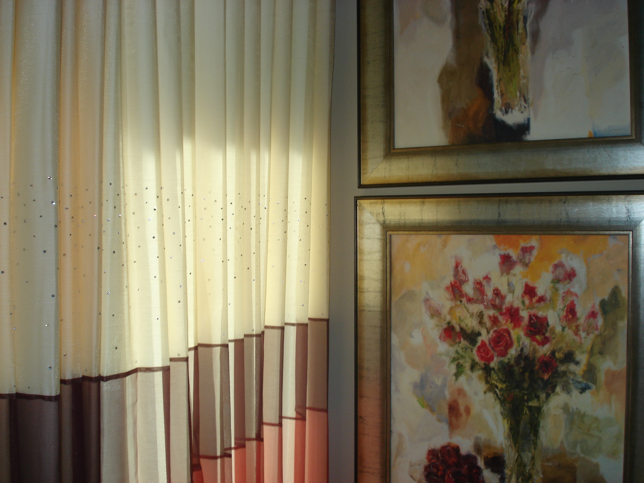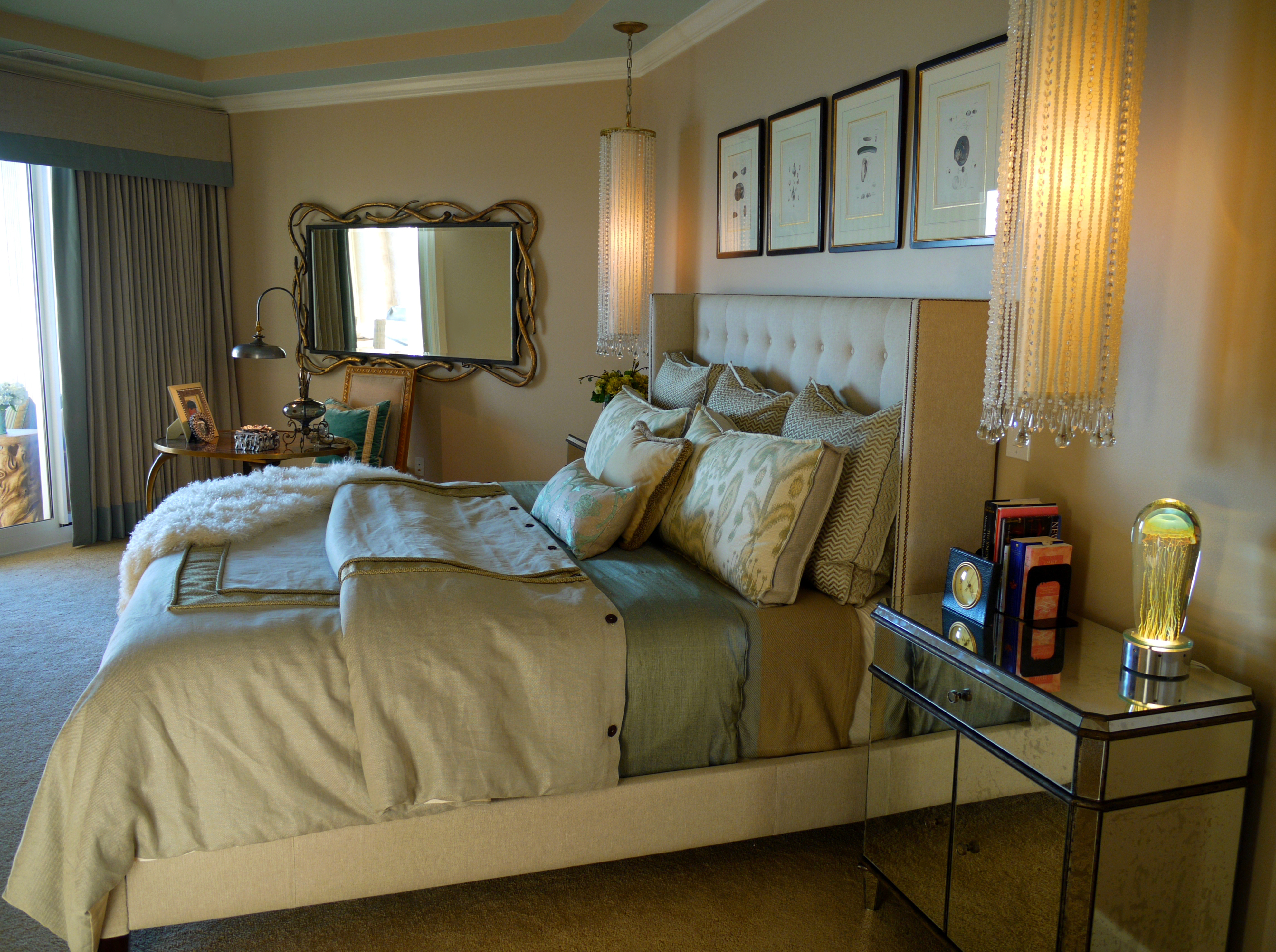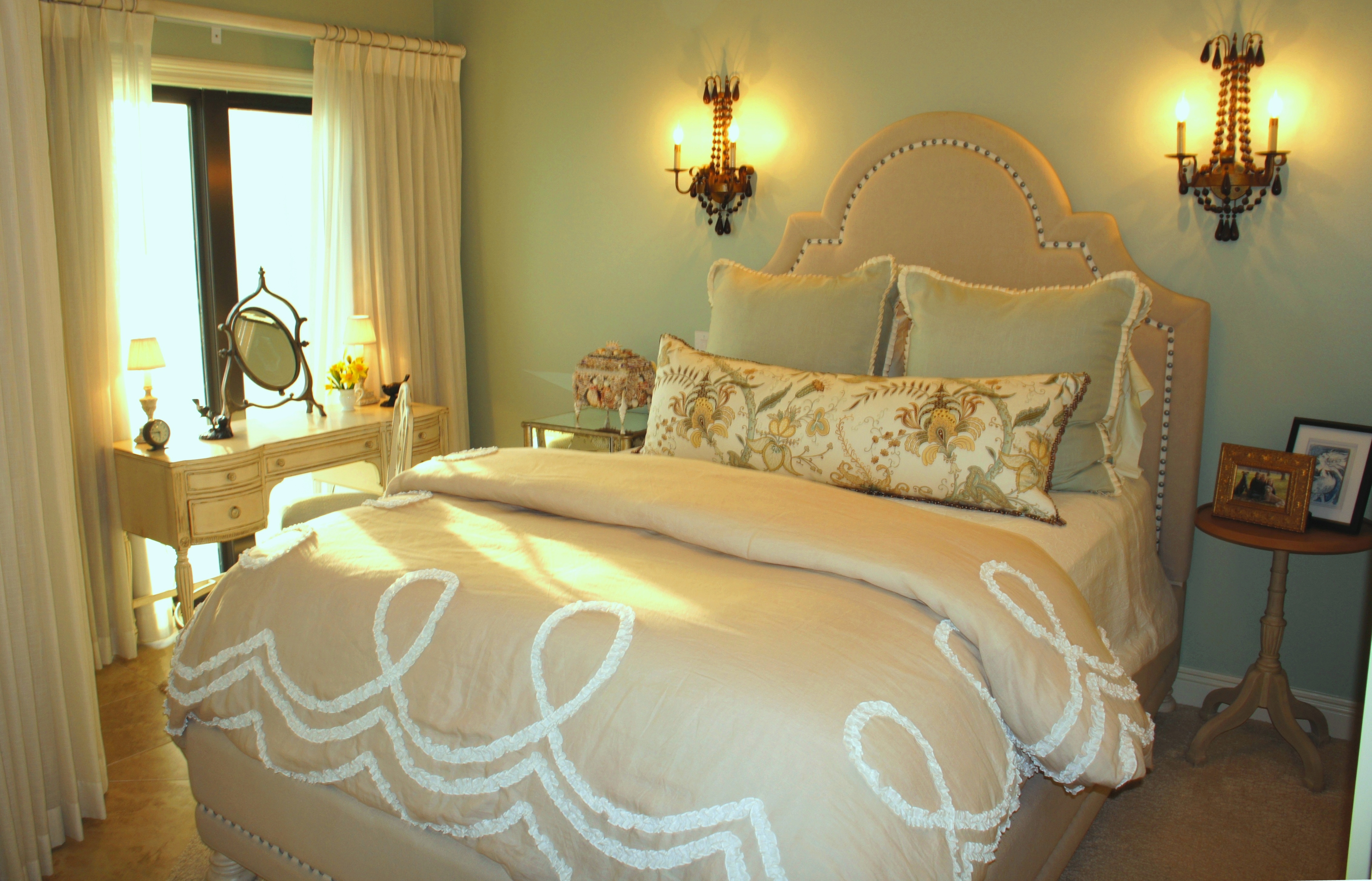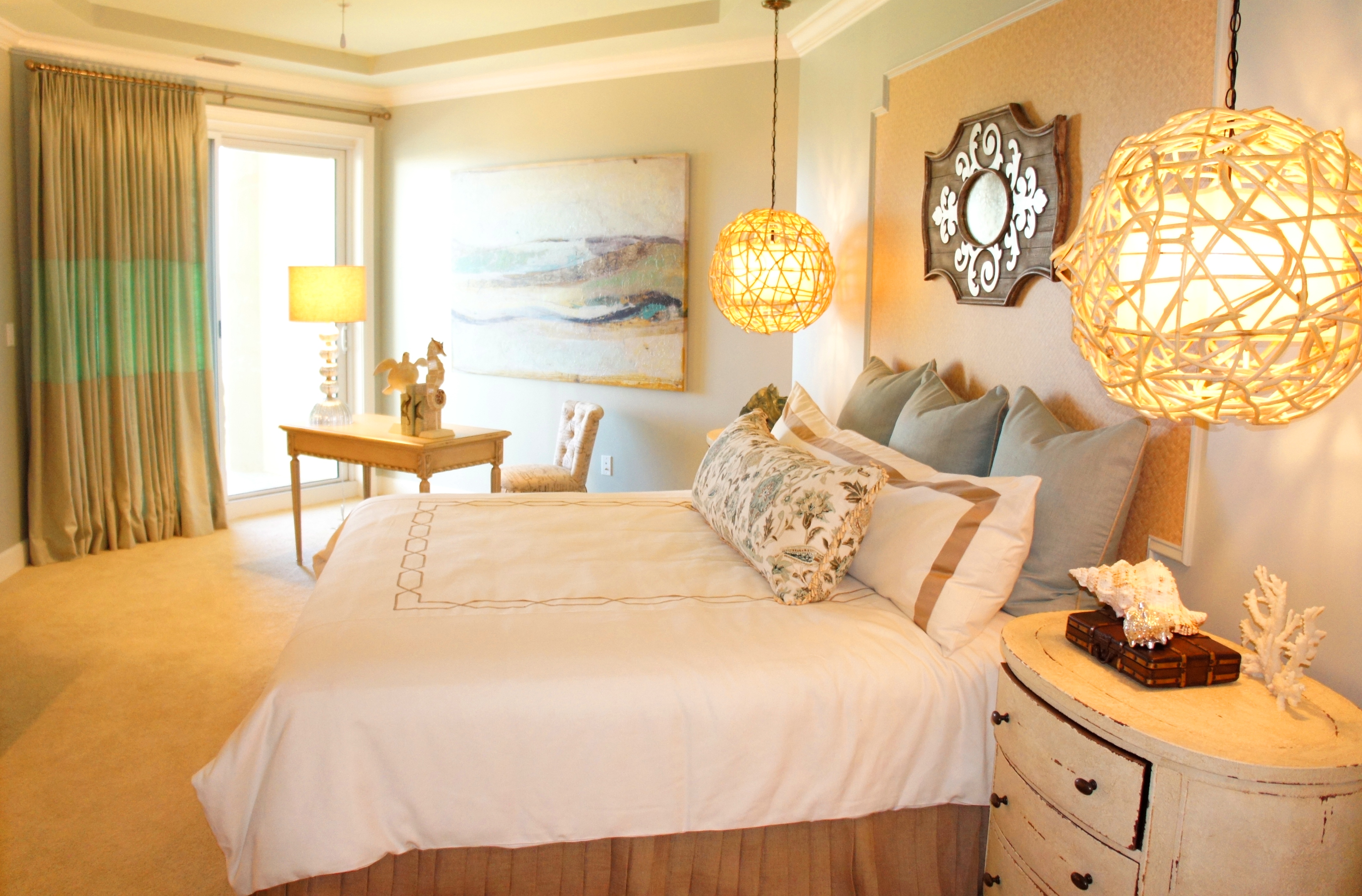 The lined sheers of this bedroom are adorned with Swarovski crystals, which sparkle at night and provide an extra touch of glamour and femininity. The oil paintings tie all the colors in the room together beautifully.