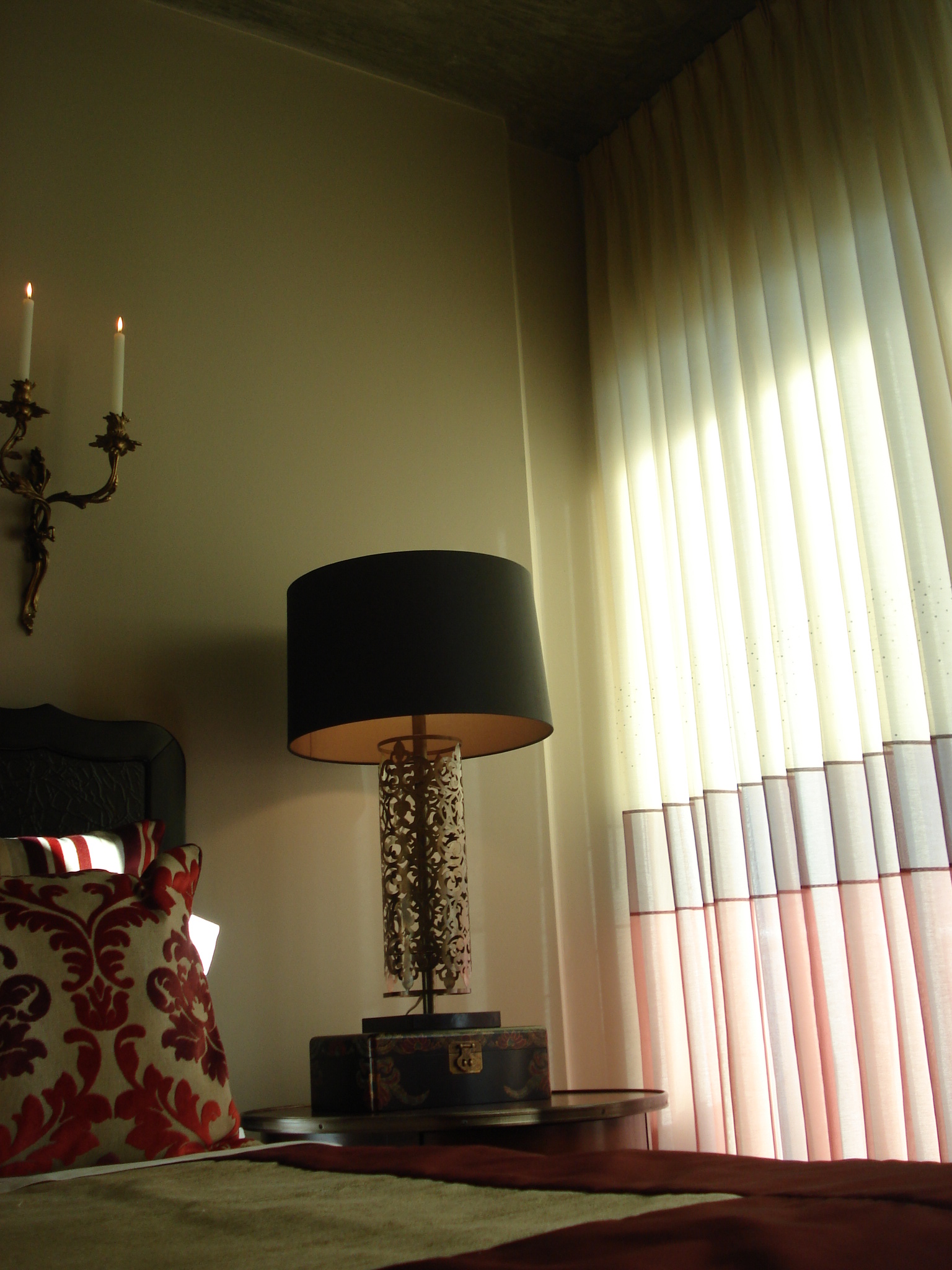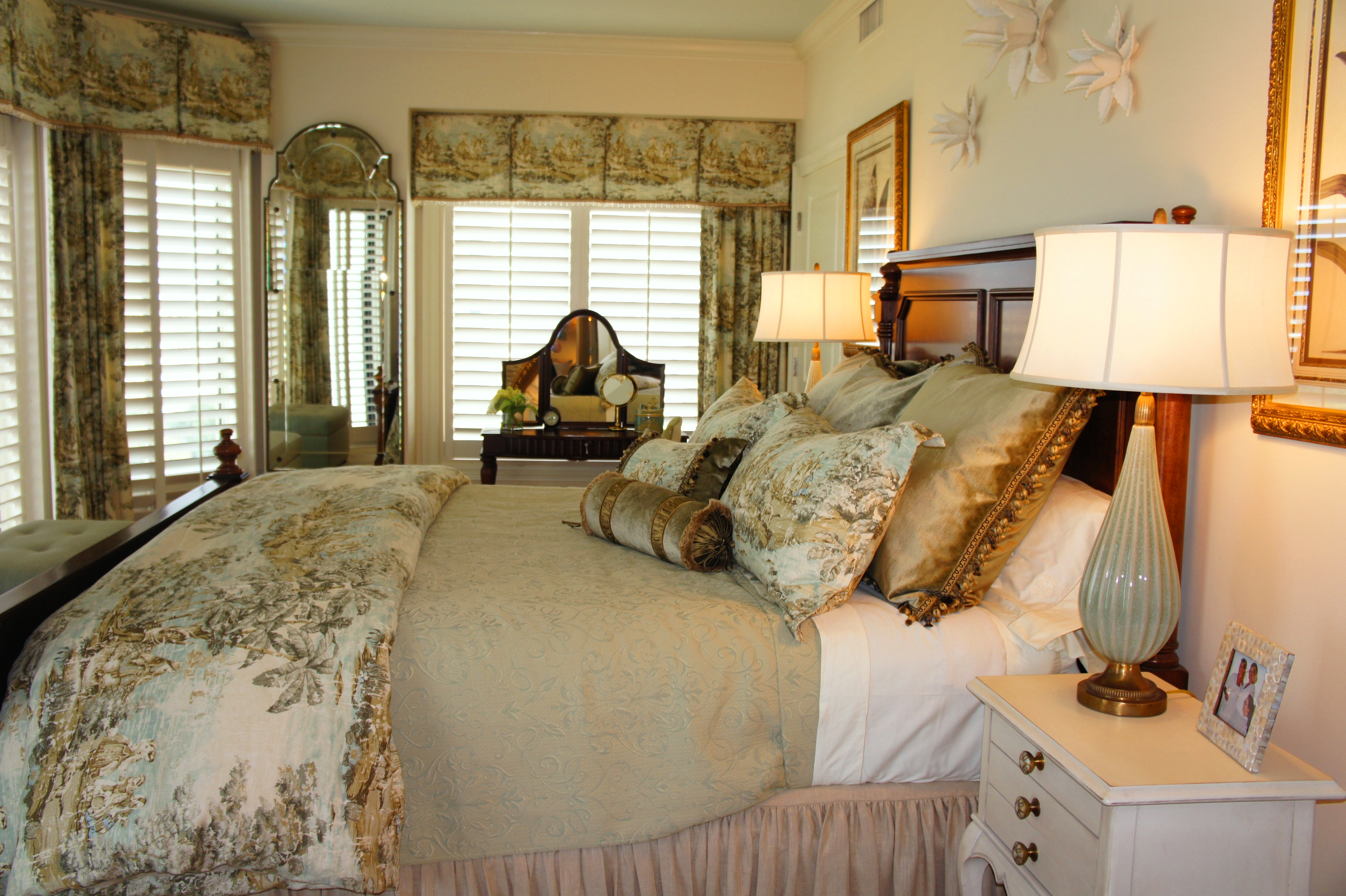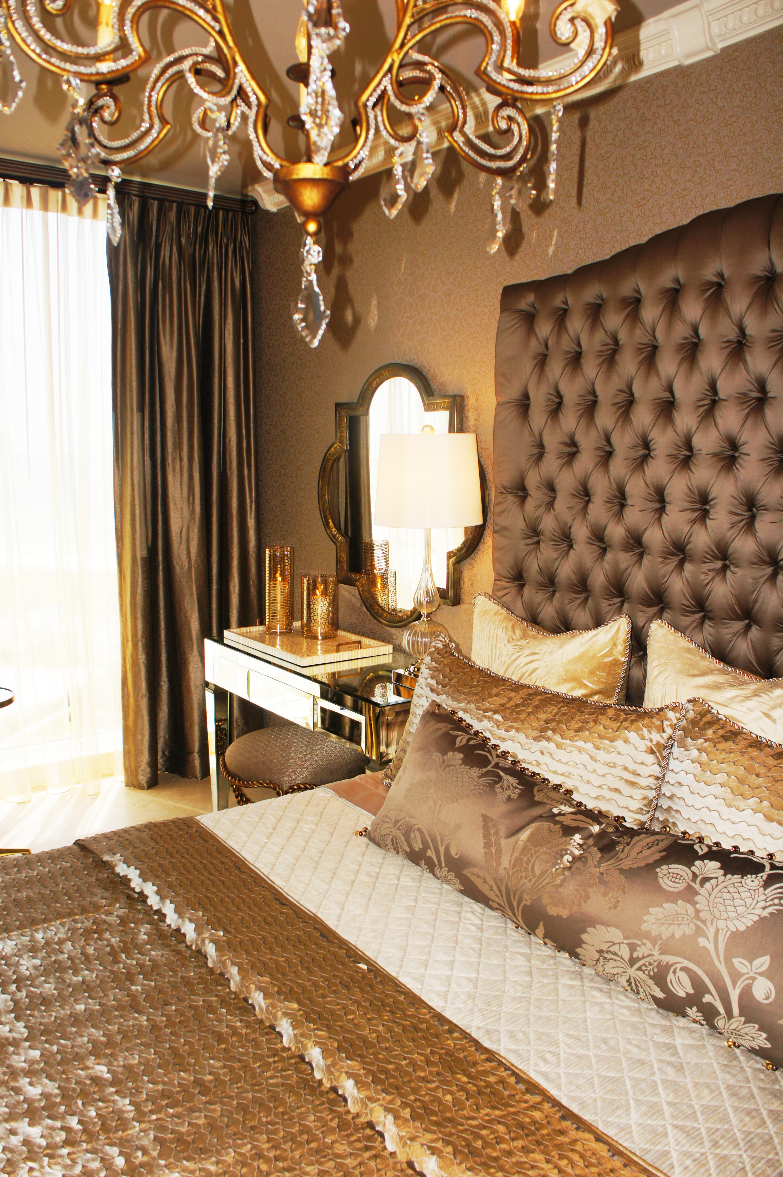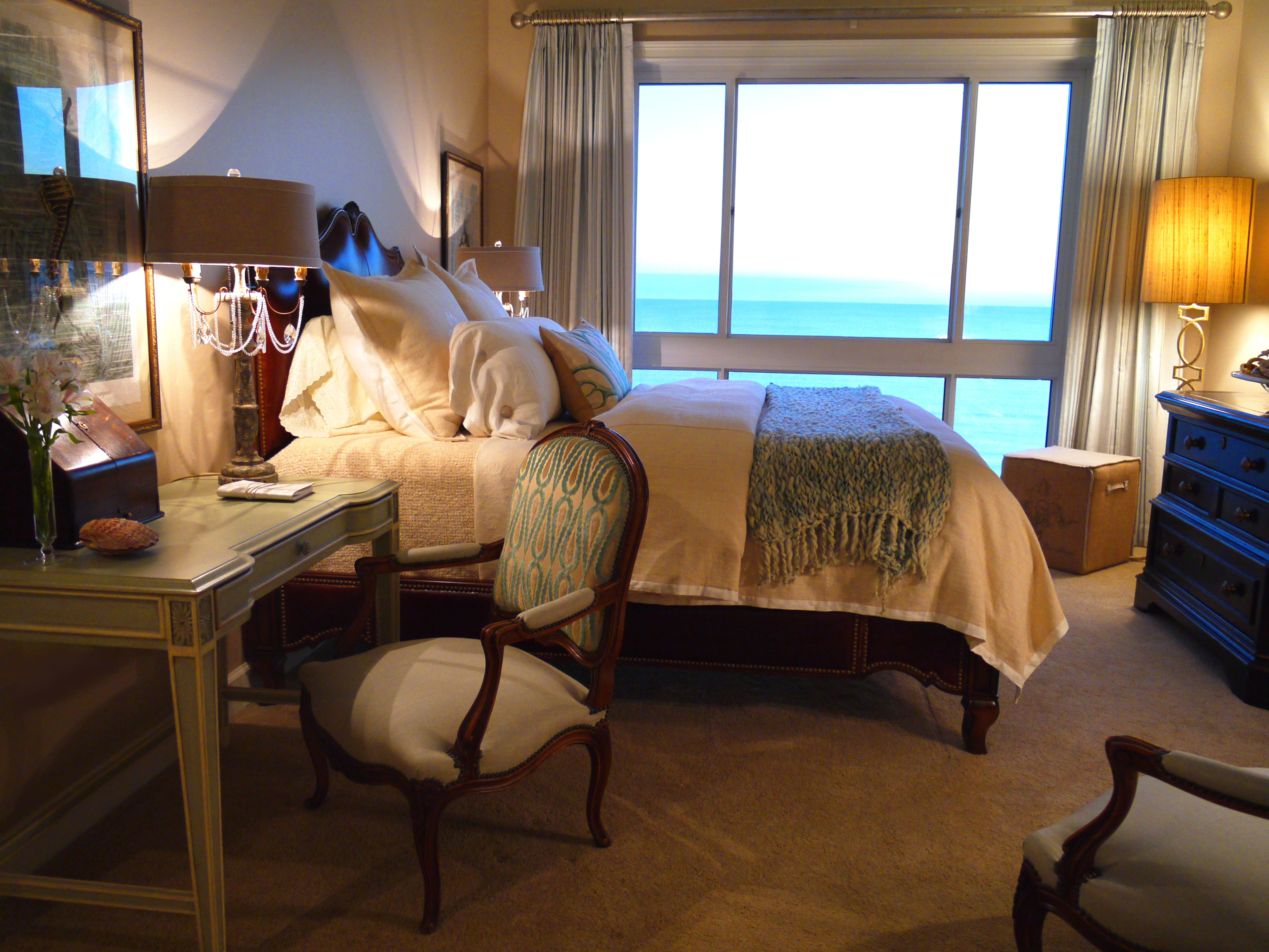 The lined sheers of this bedroom are adorned with Swarovski crystals, which sparkle at night and provide an extra touch of glamour and femininity. The oil paintings tie all the colors in the room together beautifully.