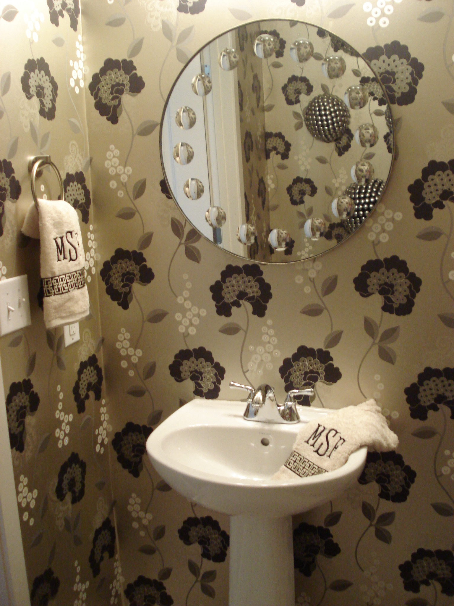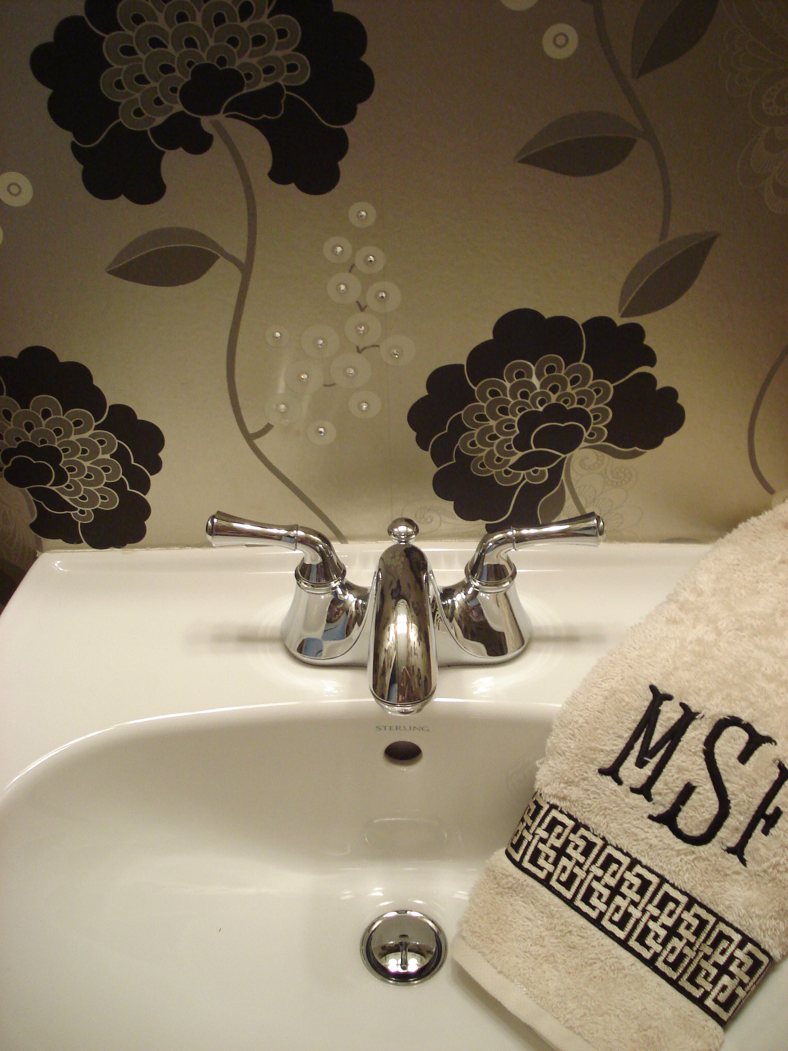 I made her hand towels by purchasing some nice, but affordable solid towels that matched the cream in the wallpaper. Then, I ordered the fabulous black and champagne fretwork decorative tape from Robert Allen and had it sewed as the border. Lastly, I had my client’s initials monogrammed above the decorative trim. This was a great way to have custom towels that matched the room perfectly.