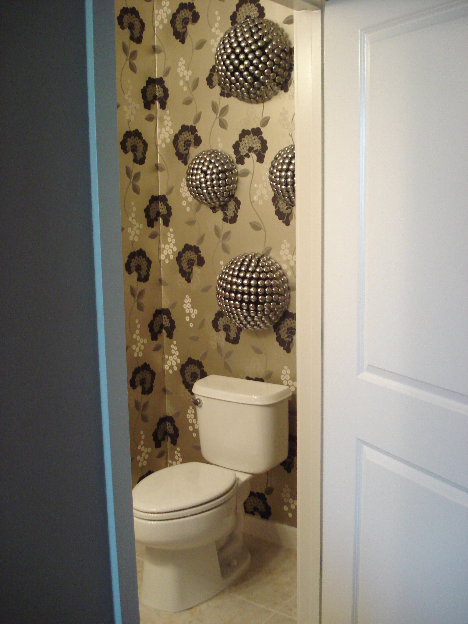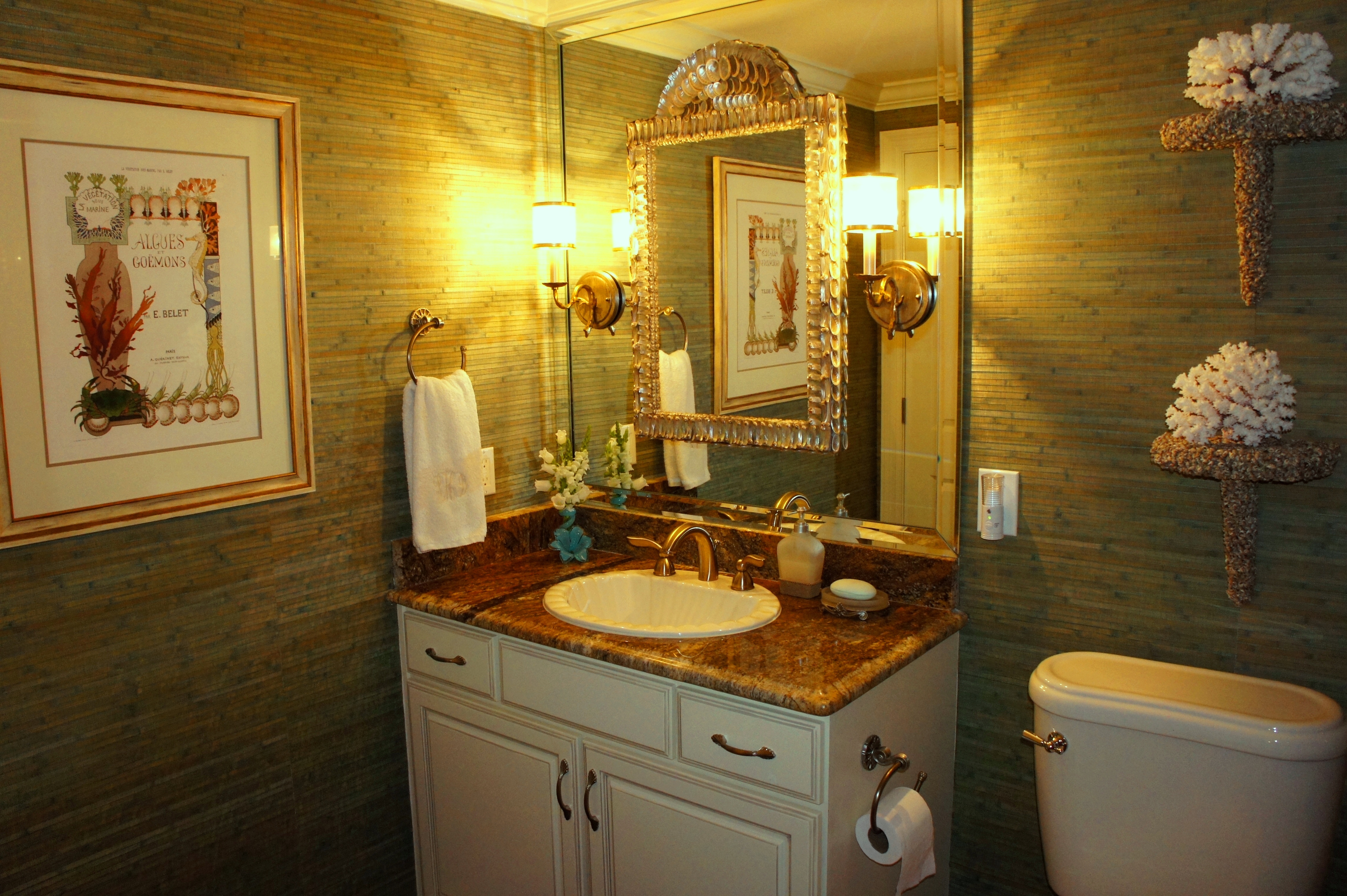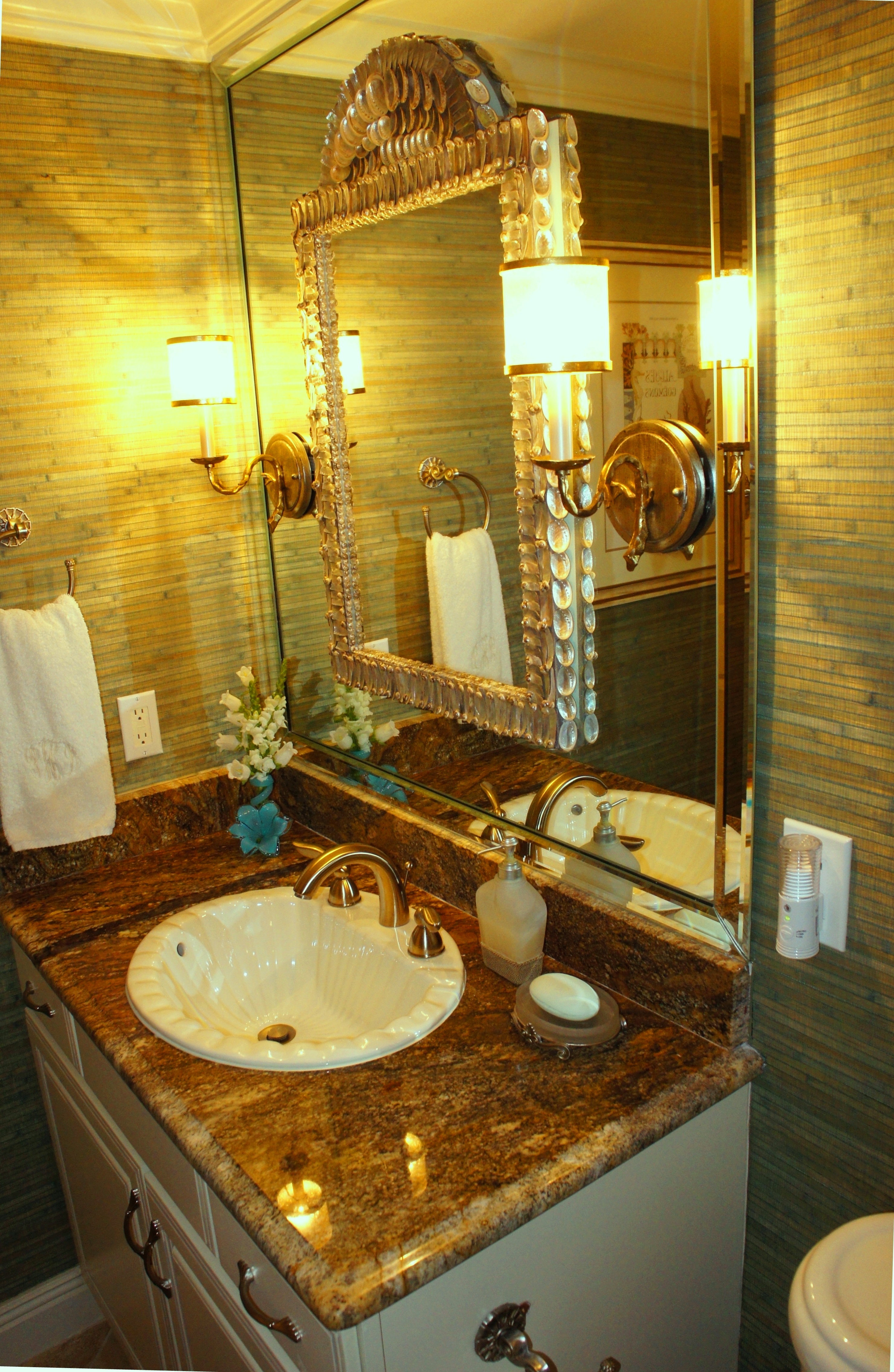 The Guest Bathroom was dressed up with another LaBarge “mirror on mirror” (my handyman loves me!) This particular mirror was VERY heavy and the process was laborious, but the result was worth it. This is why I employ people who believe that if there is a will, there is a way. I am very strong-willed! The wallpaper is a pale green with shiny gold print. It is colorful enough to give richness to the bathroom, but faded enough to not be too busy.