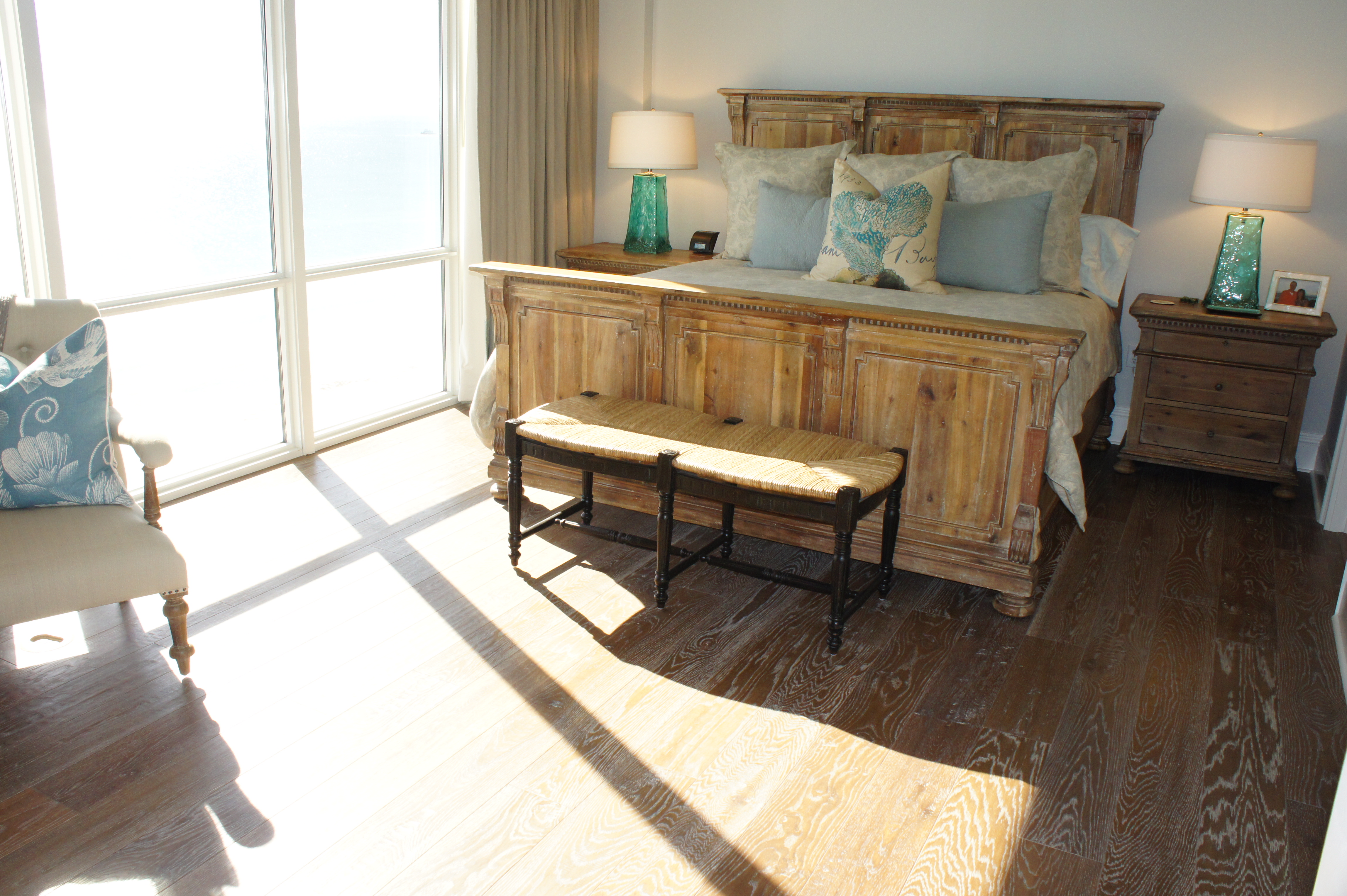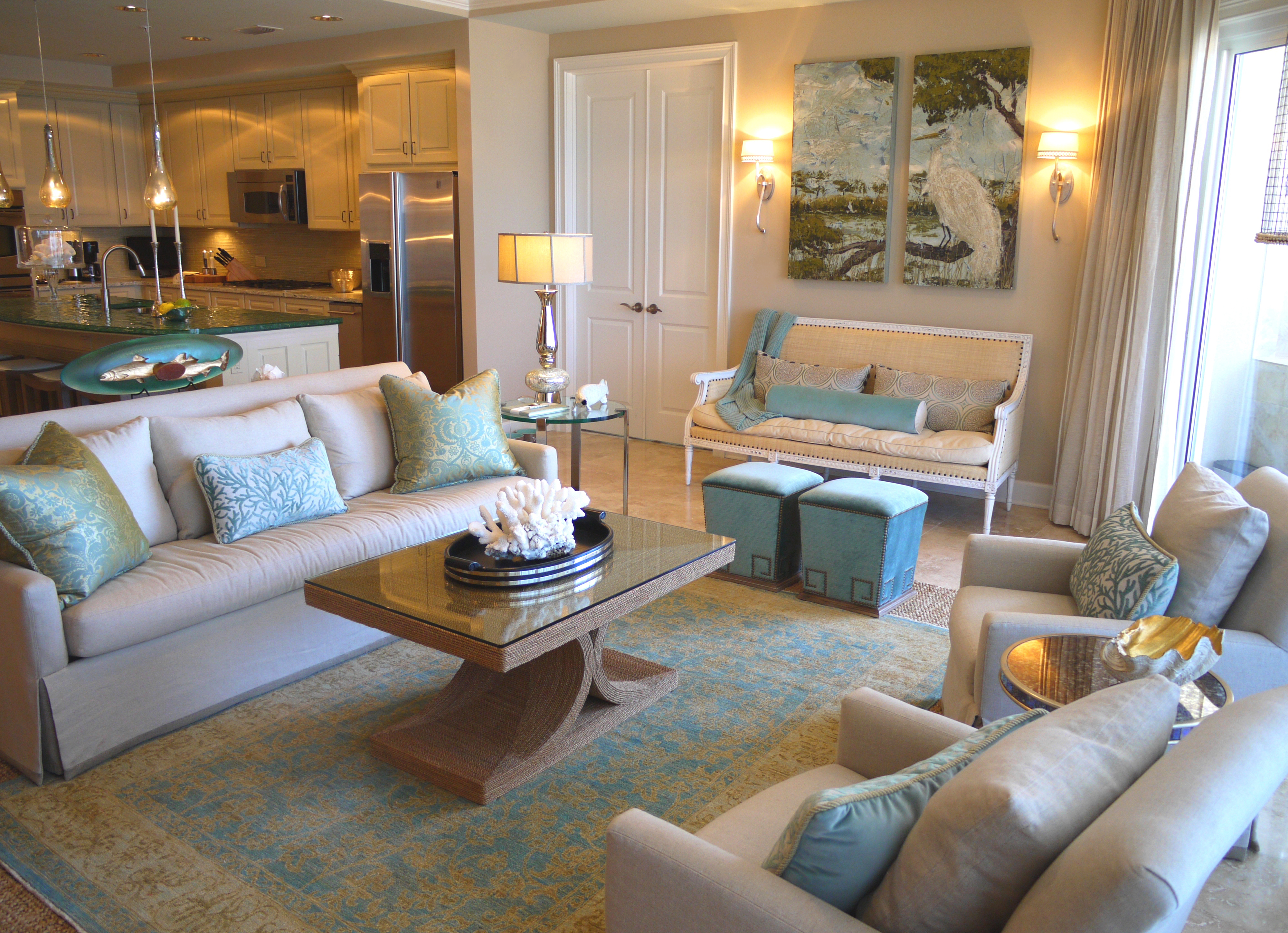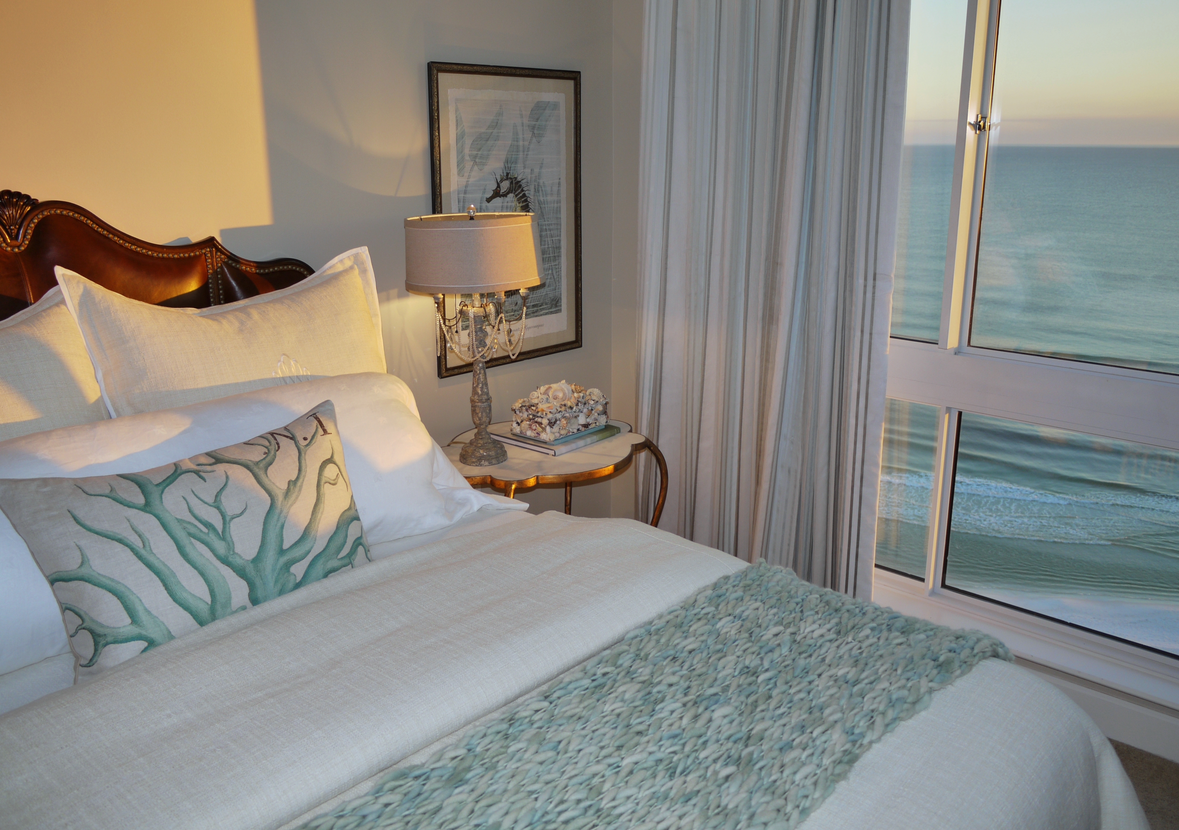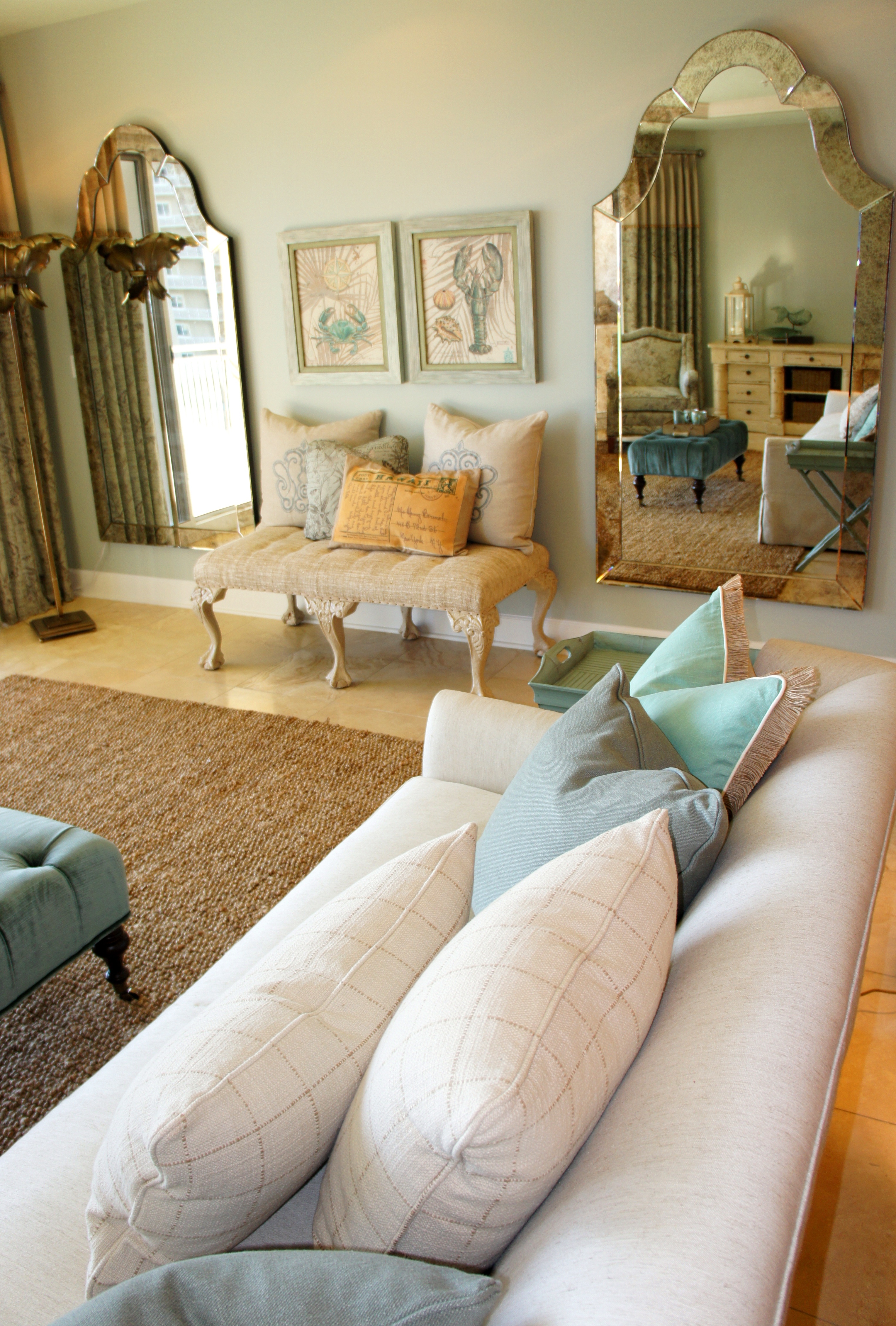 Rustic jute, raffia, linen and distressed finishes; or rich wool, silk, velvet, golds and things adorned in crystals? Why pick and choose when you can have it all? This unit was designed for two people who hold the beach near and dear to their hearts, while also enjoying the finer things in life. I wanted their design to reflect both of these loves by contrasting natural, somewhat rustic coastal finishes and accents with rich, fine textures and sparkling finishes. I laughingly came up with the term “crusty-chic”, which we ended up using quite a bit through the process! A more proper description, however, would probably be “coastal-chic”.