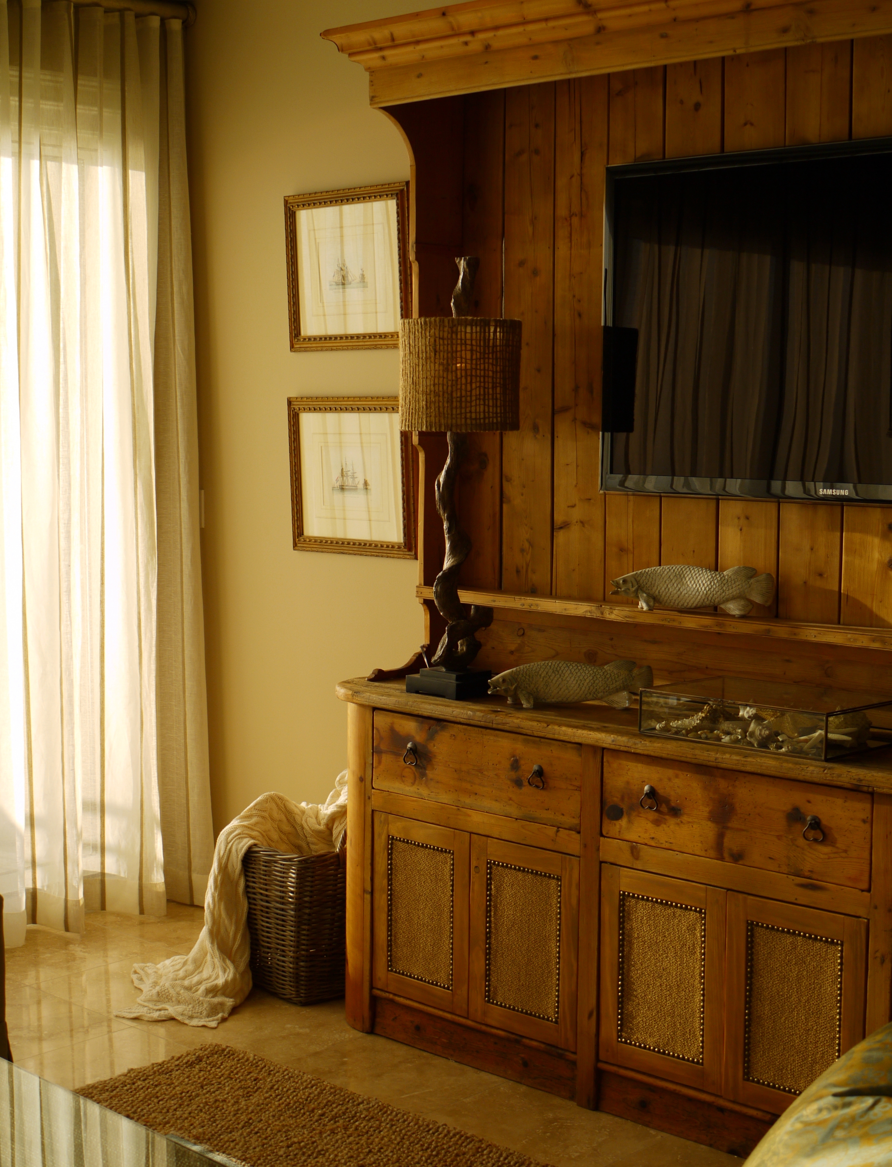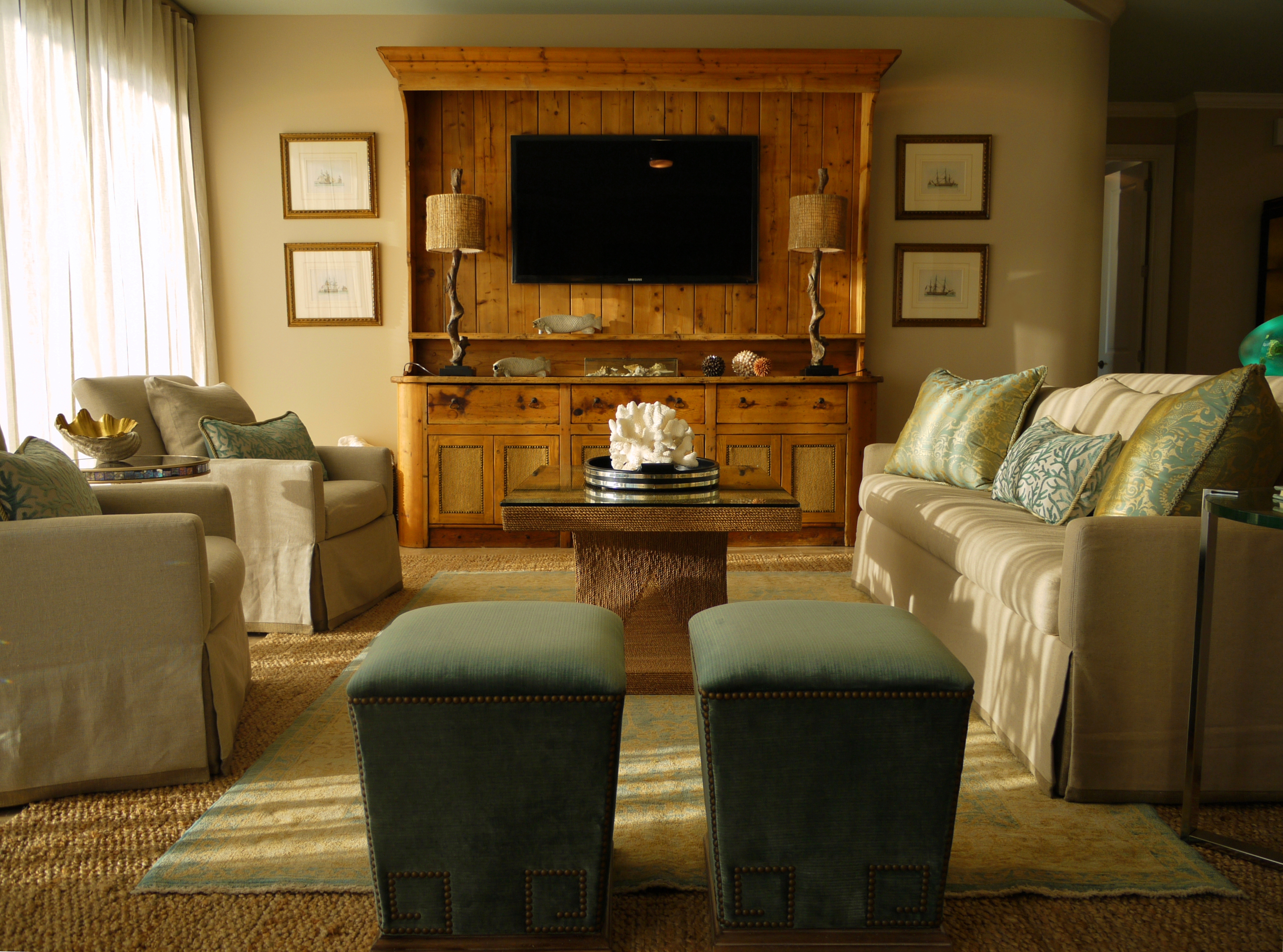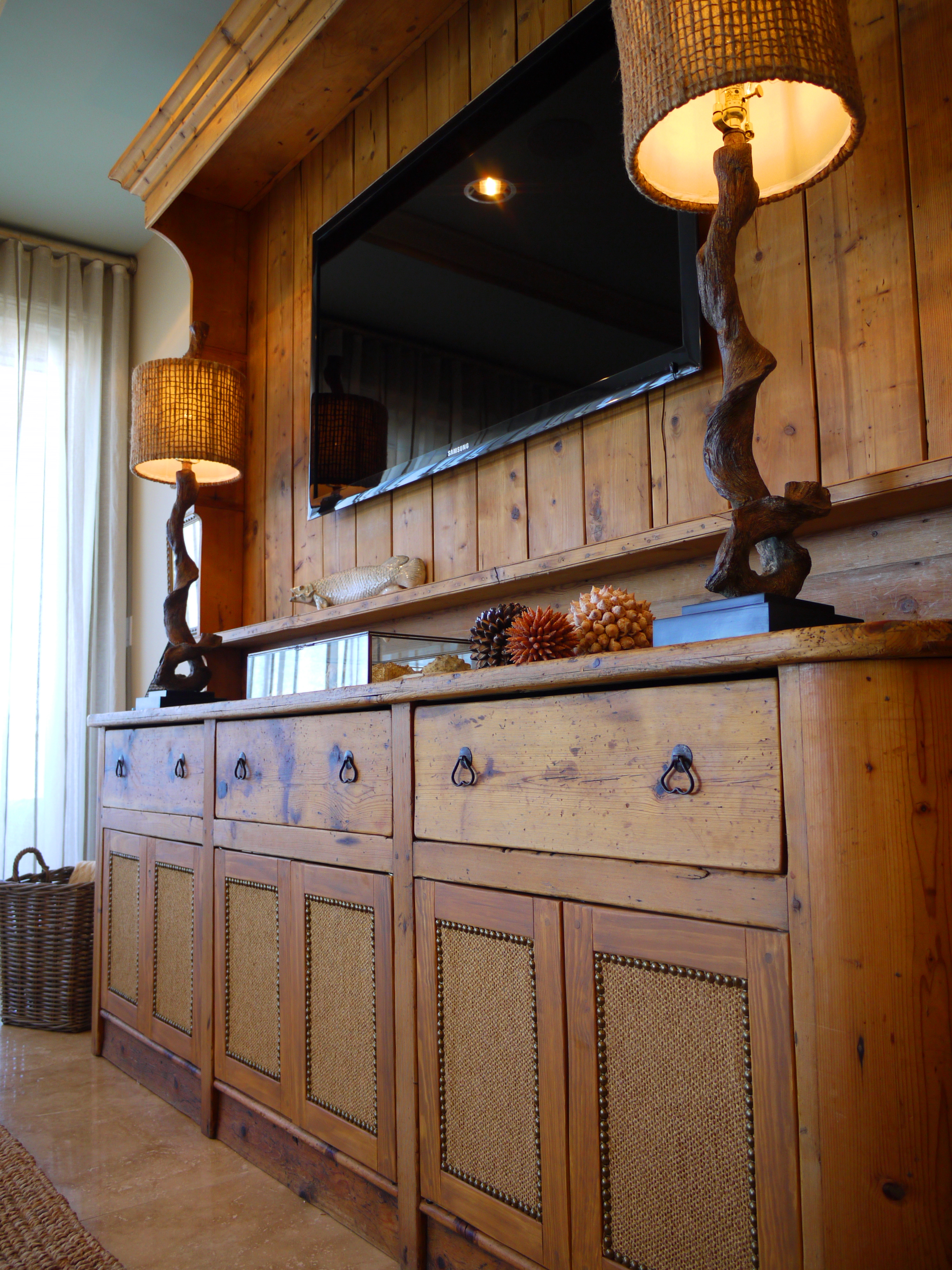 The main focal piece in this room is a large heart pine sideboard and hutch that the clients brought from home. This is an antique that once resided in someone’s kitchen. We loved the idea of making this into a t.v. piece, because it brought so much warmth and weight to the room, and helped anchor and define the space. We removed the shelves & mounted the t.v. Then, I had some custom doors made to match the piece, and upholstered them in a matching woven linen. This hides their components and makes it more functional. I love it when a client brings their own things like this to the table, because it helps to make a design unique, while also bringing an automatic sense of familiarity and “home” to their new place.