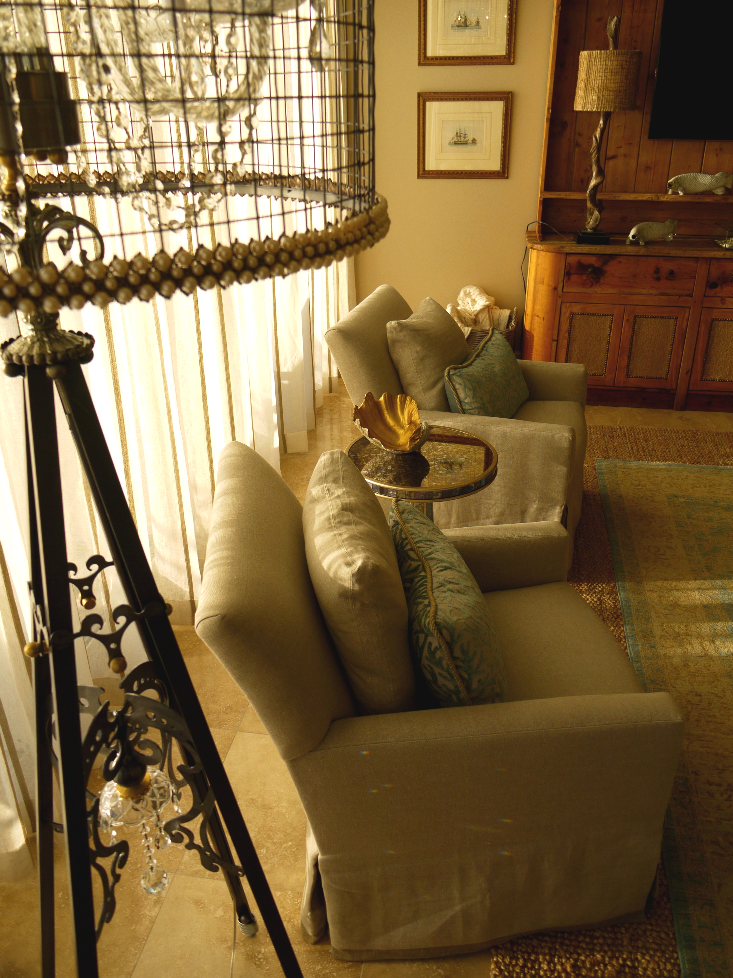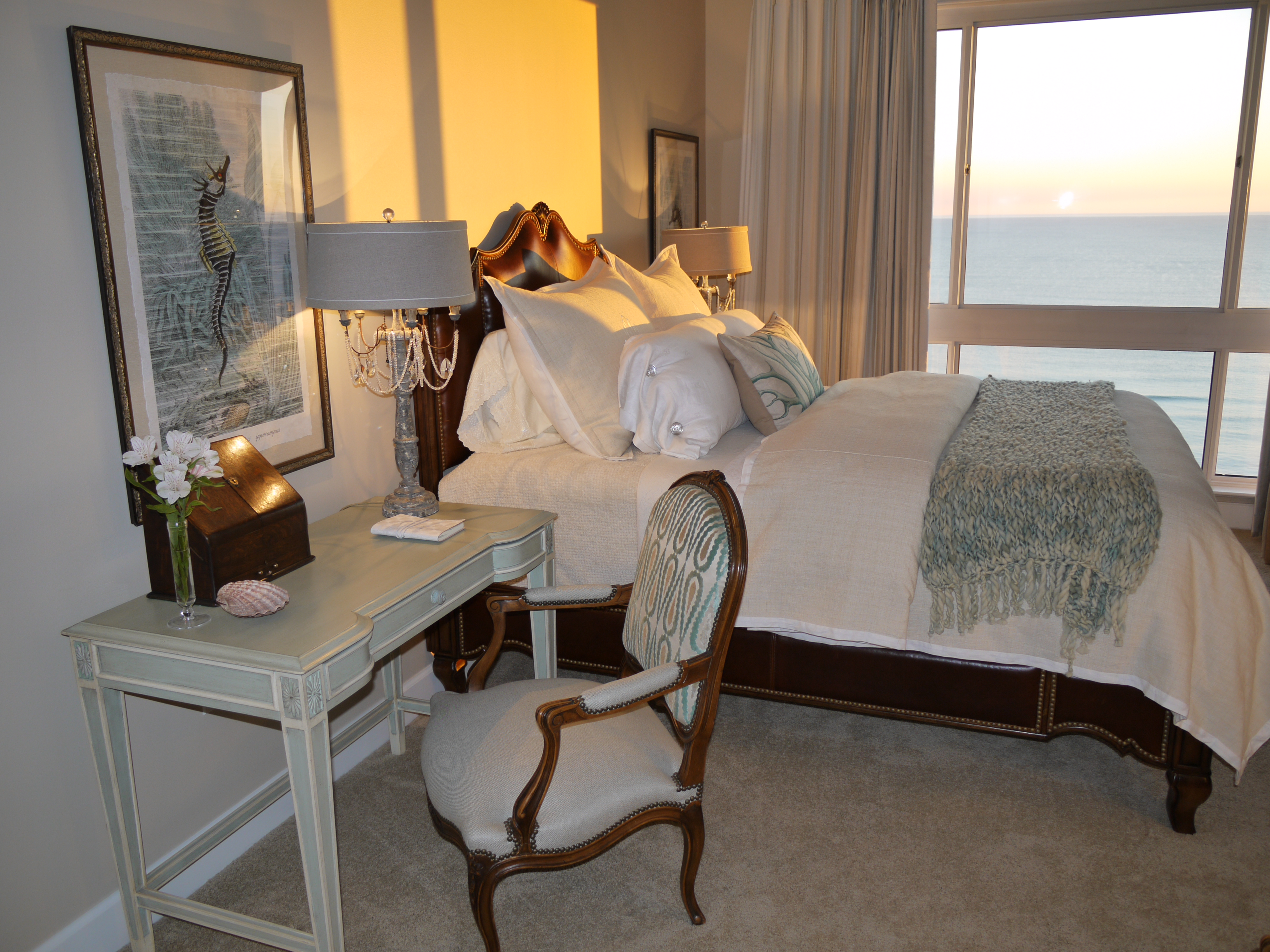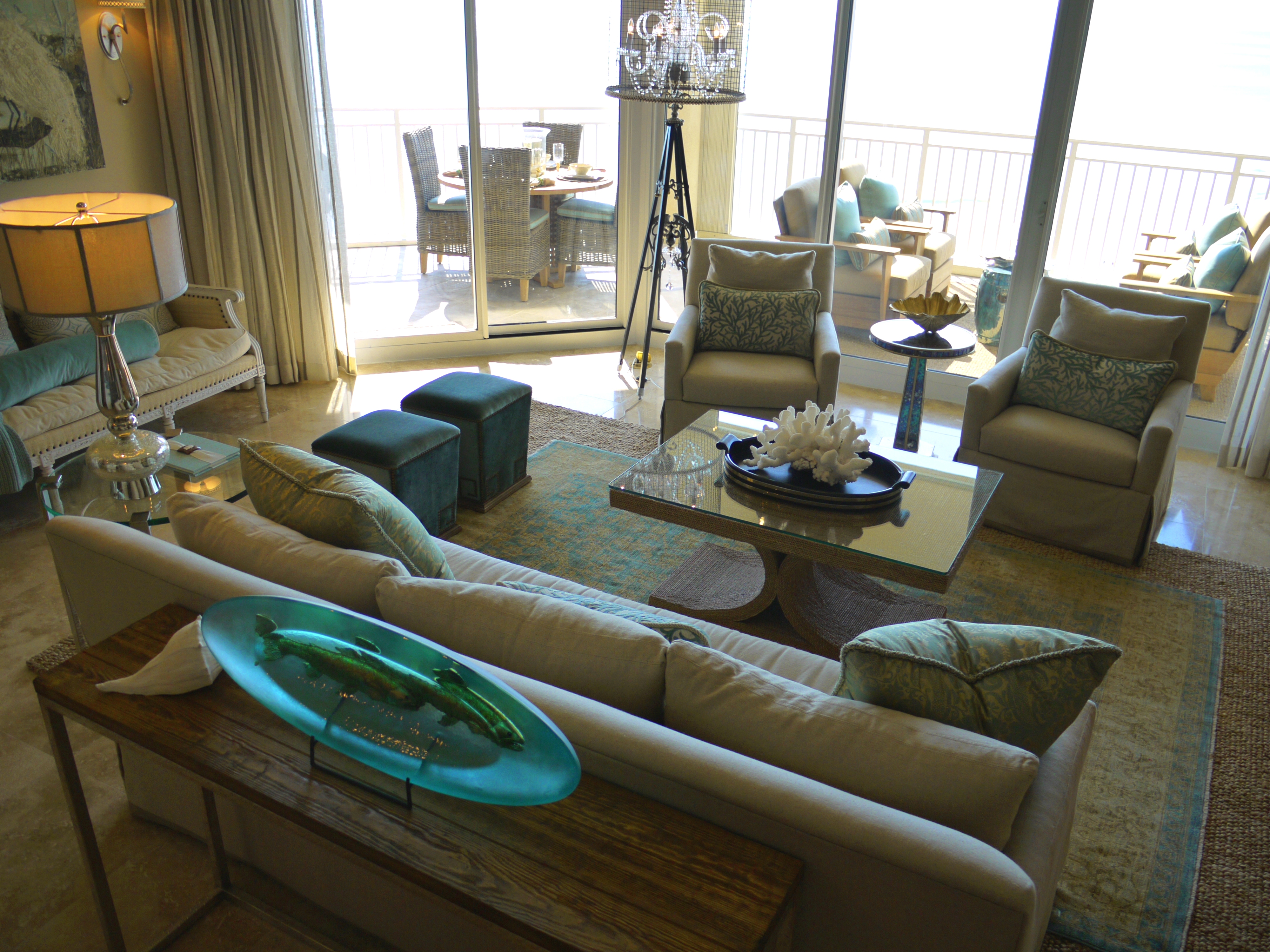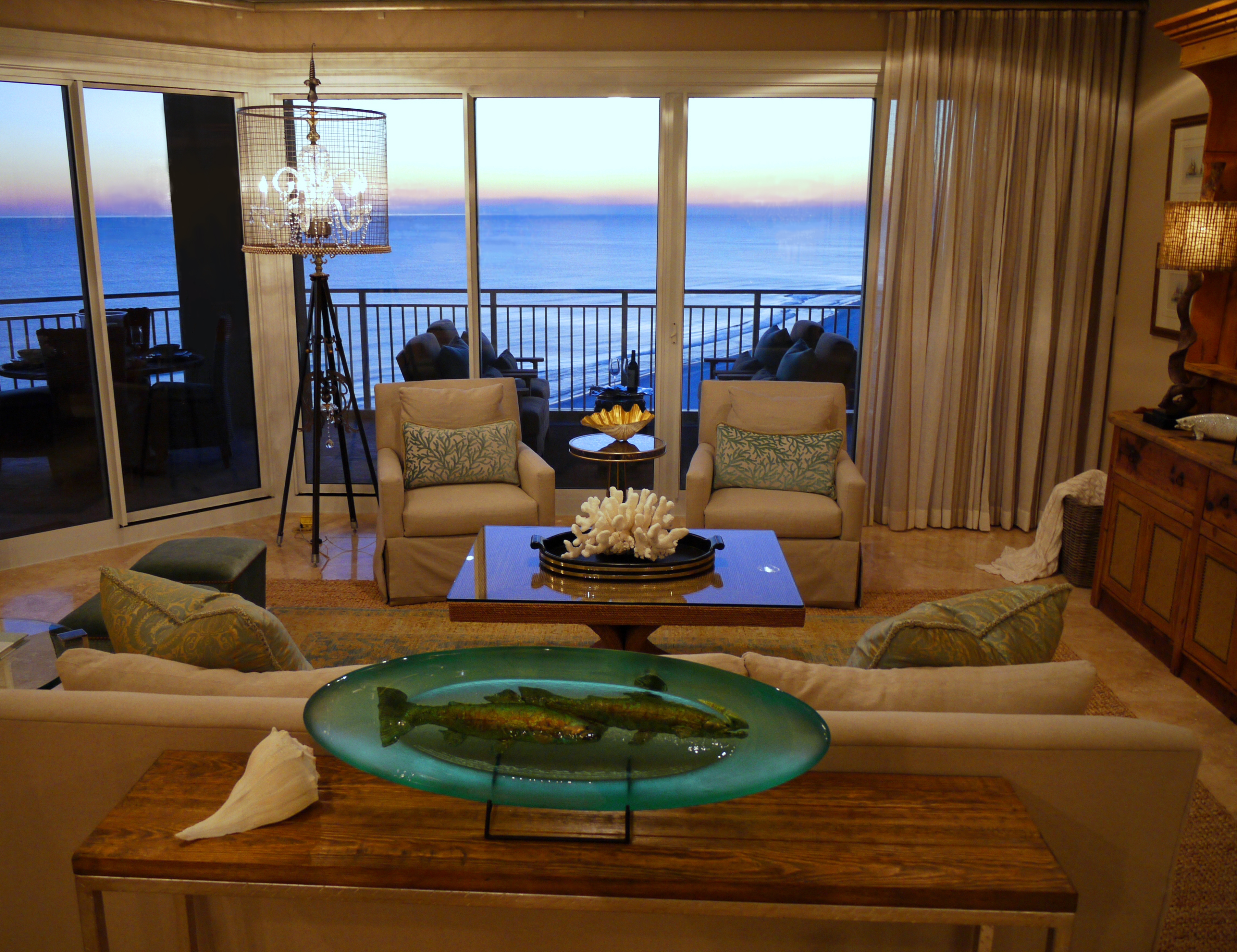 This unit provides a glorious view of the sunset in the evenings. In the foreground above, you will see the reclaimed wood sofa table we used, topped with the oval art glass from Fusion Art Glass. In this sculpture are 3-dimensional impressions of fish, finished in golds that sparkle when the light shines on it.