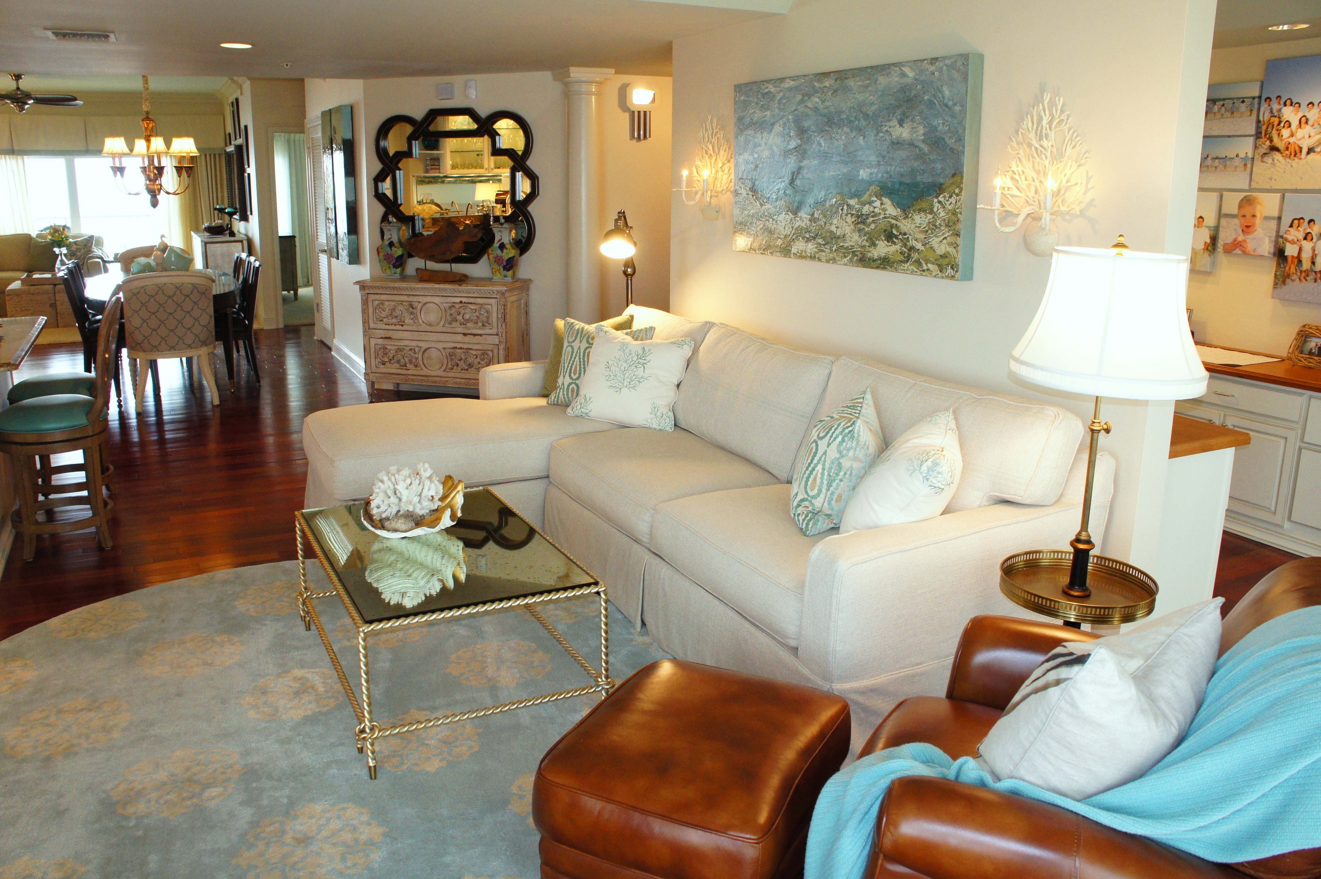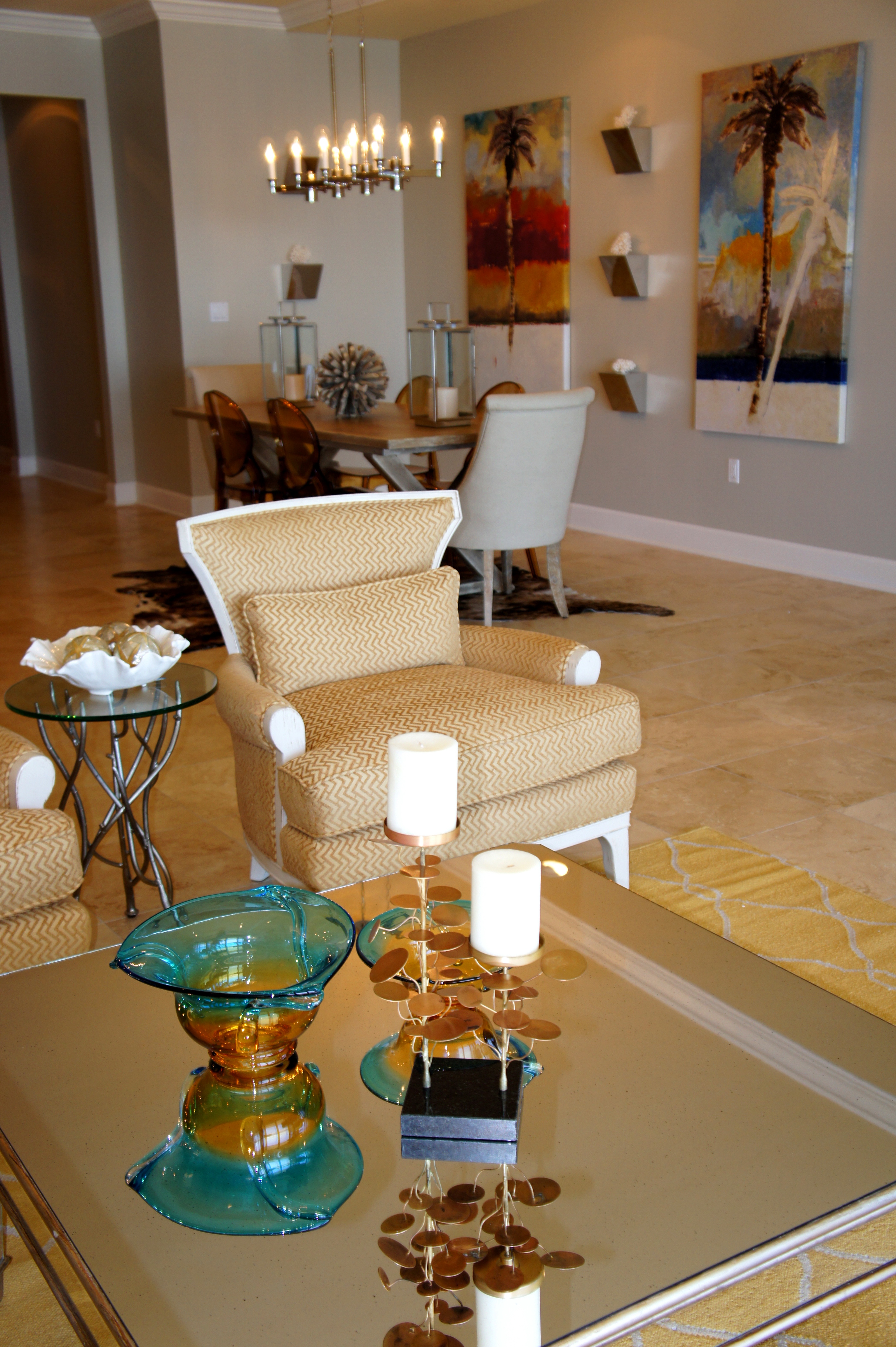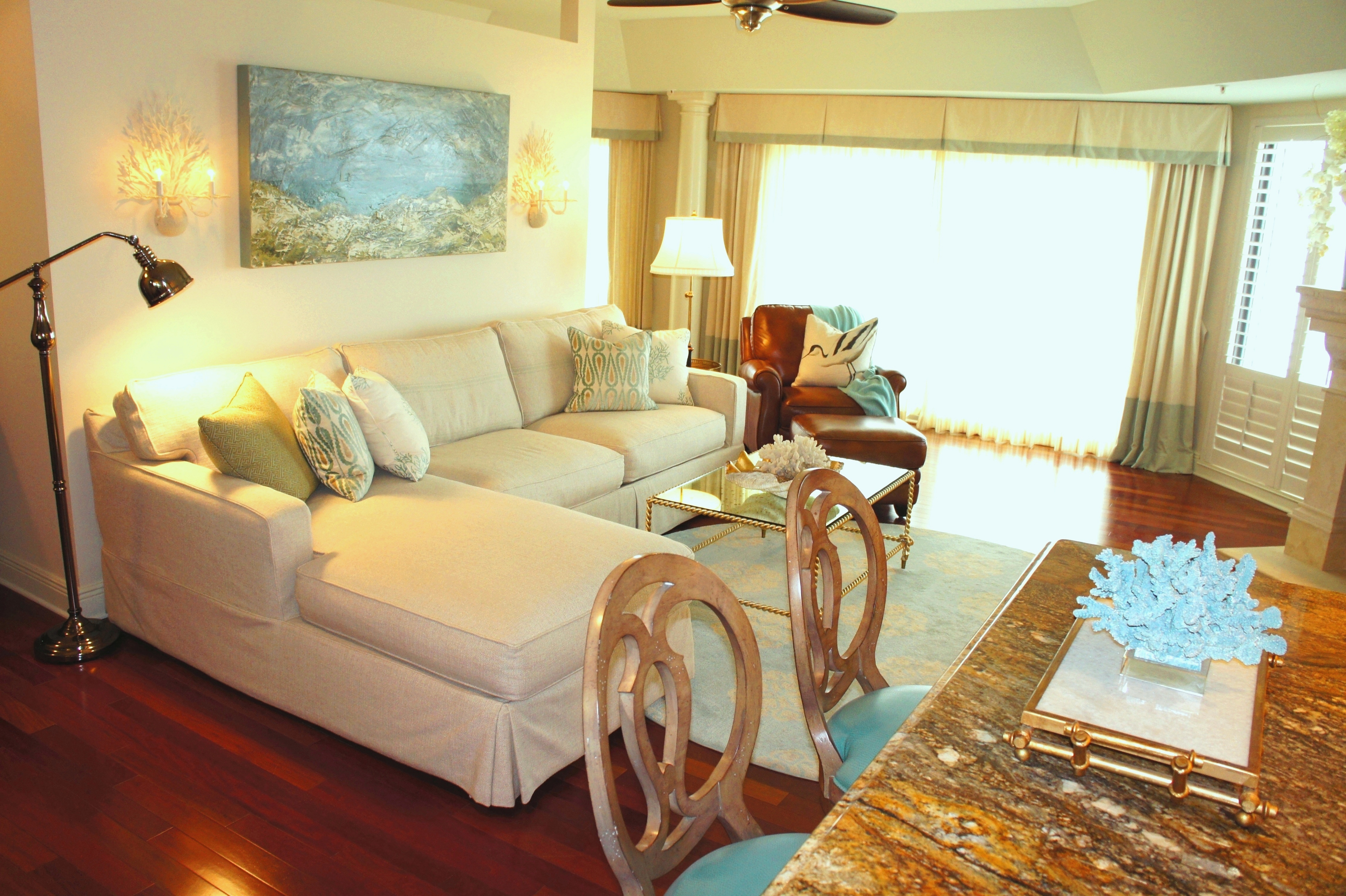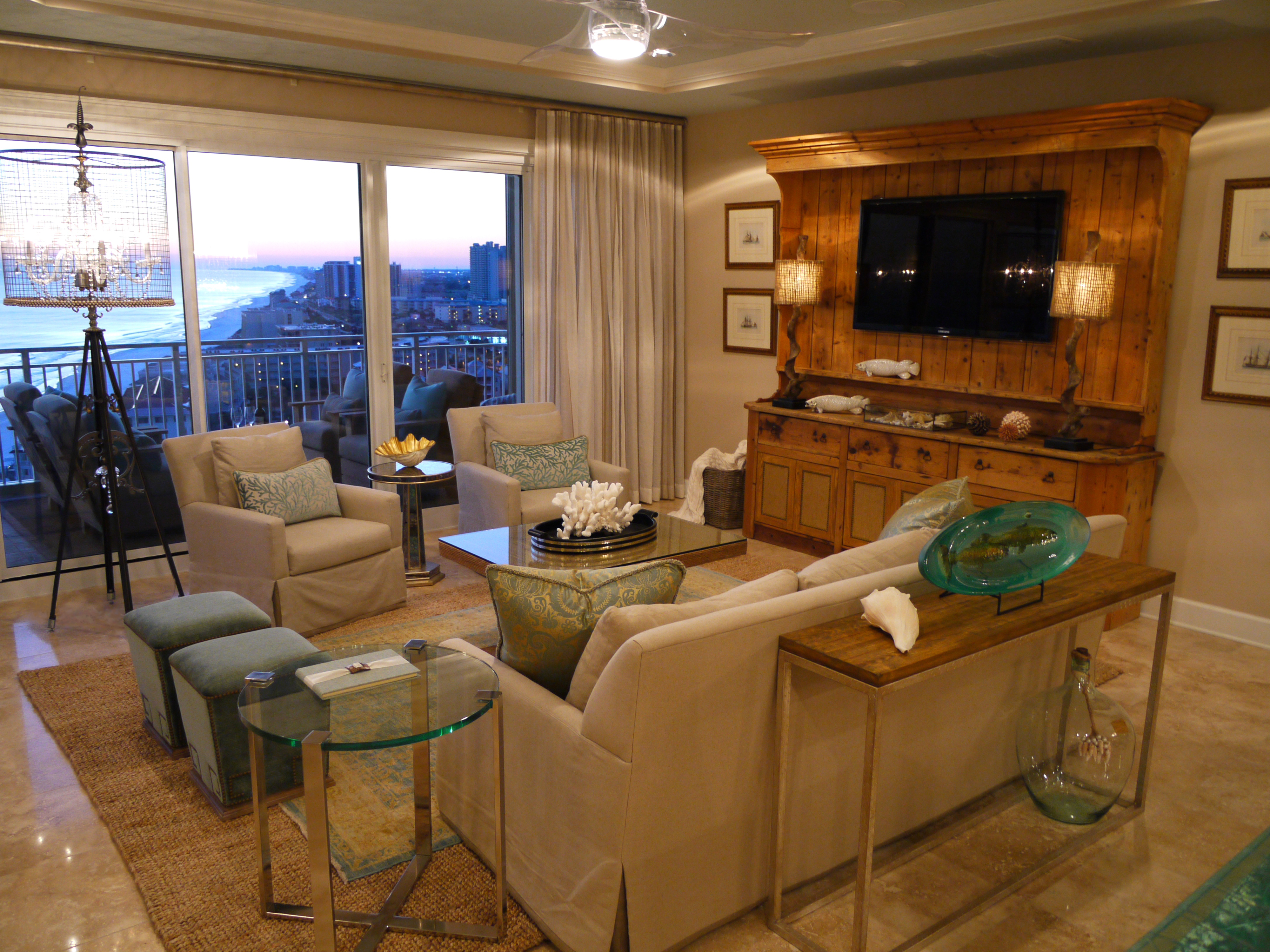 This unit provides a glorious view of the sunset in the evenings. In the foreground above, you will see the reclaimed wood sofa table we used, topped with the oval art glass from Fusion Art Glass. In this sculpture are 3-dimensional impressions of fish, finished in golds that sparkle when the light shines on it.