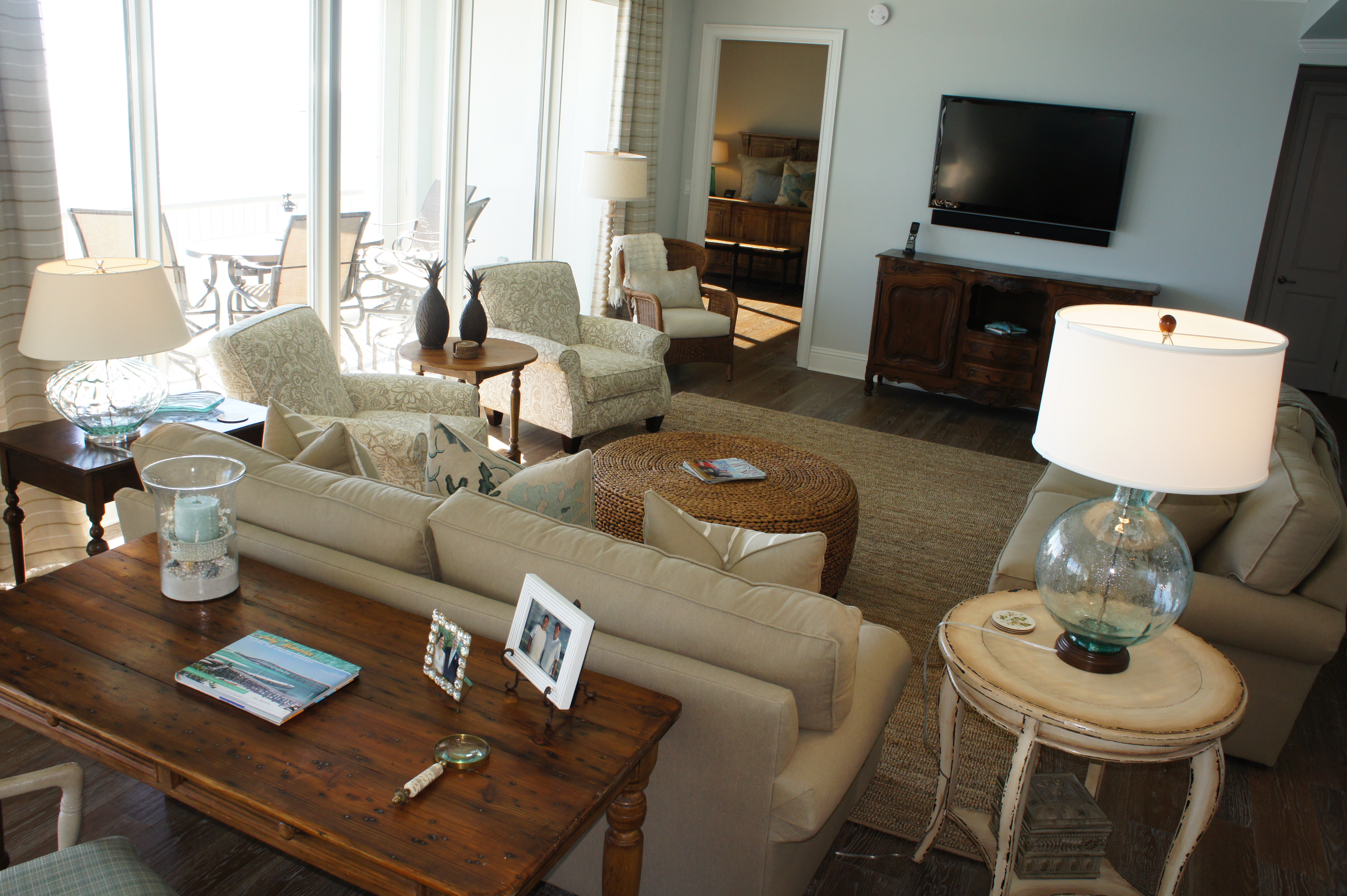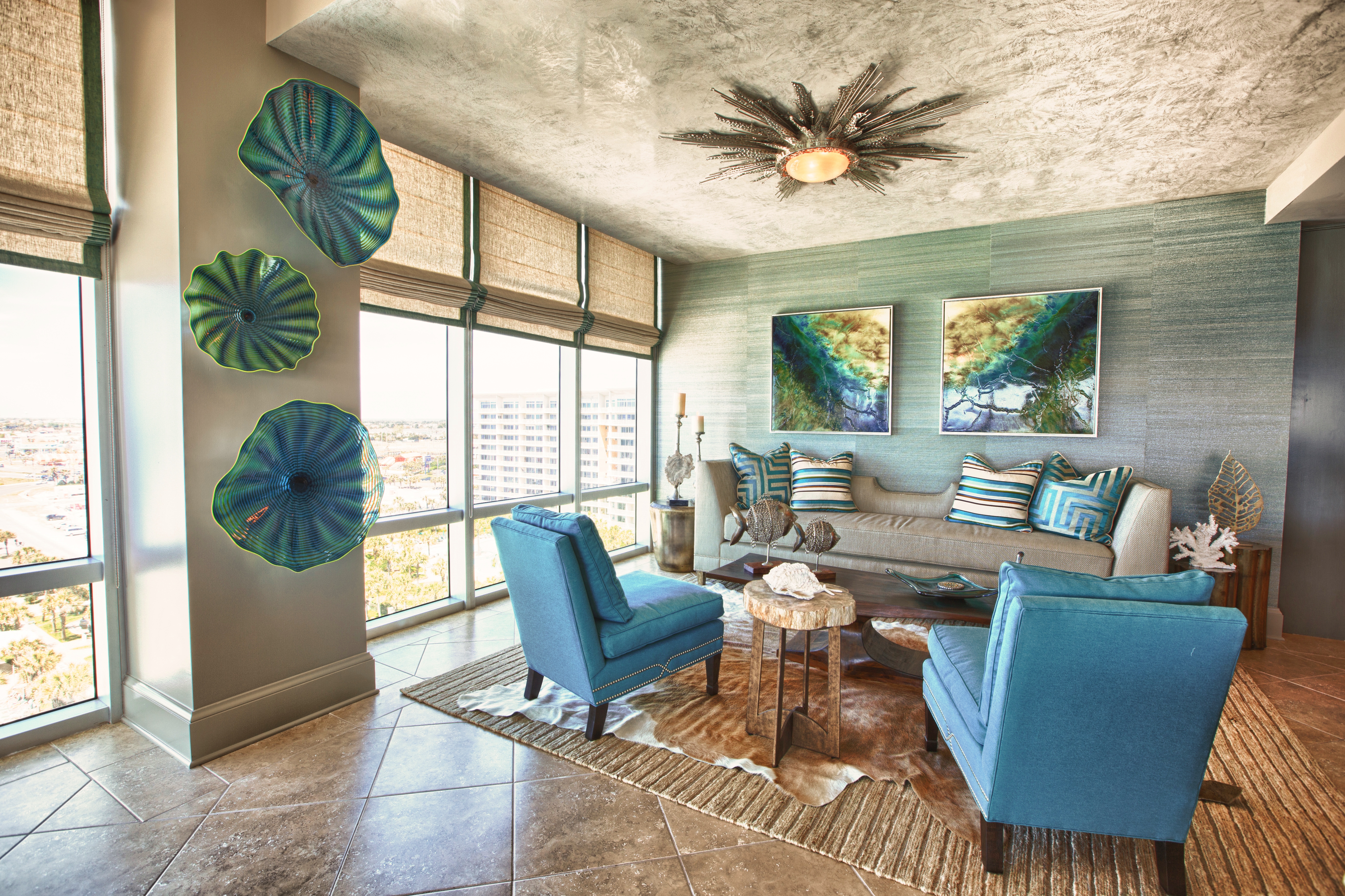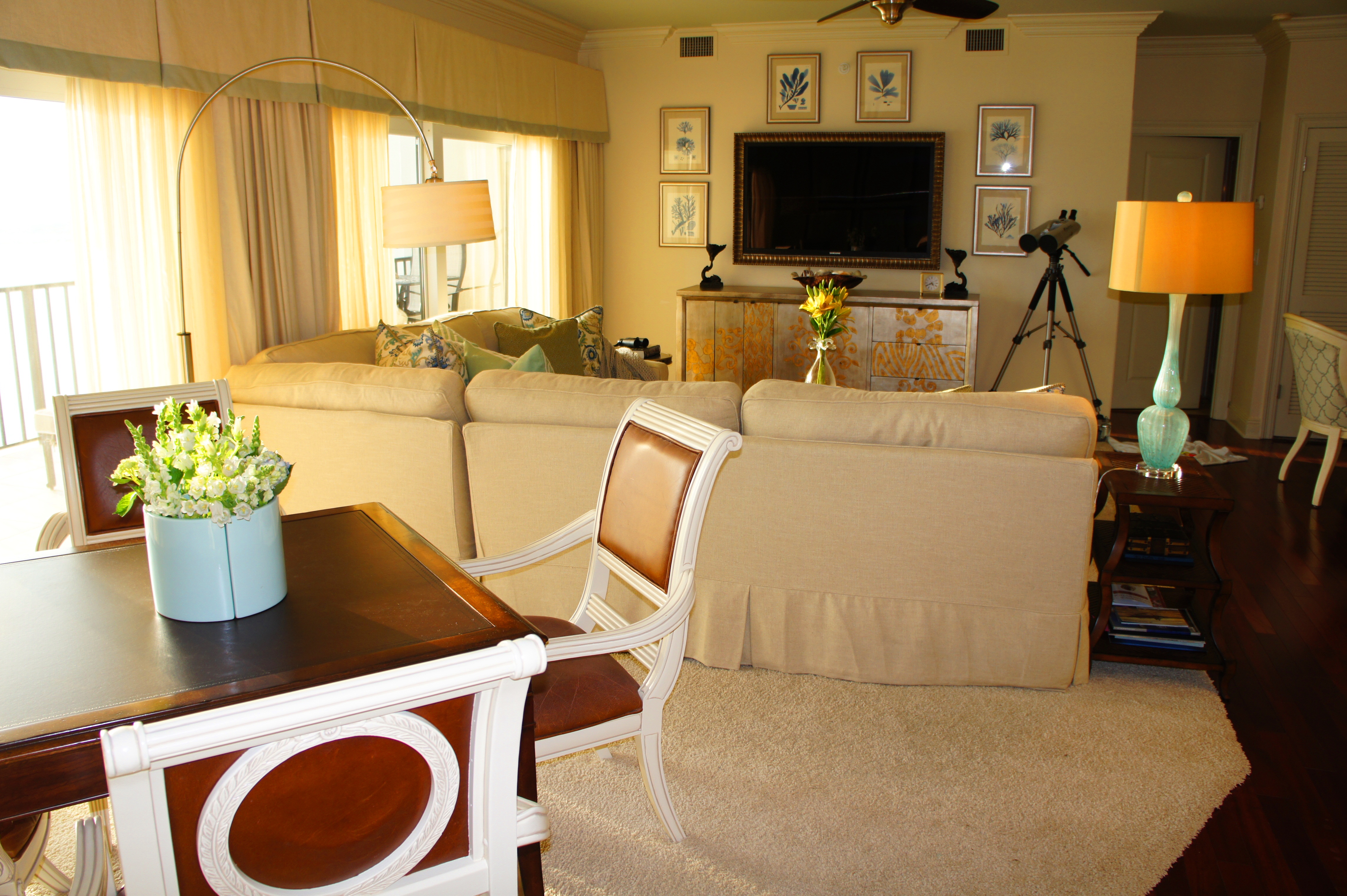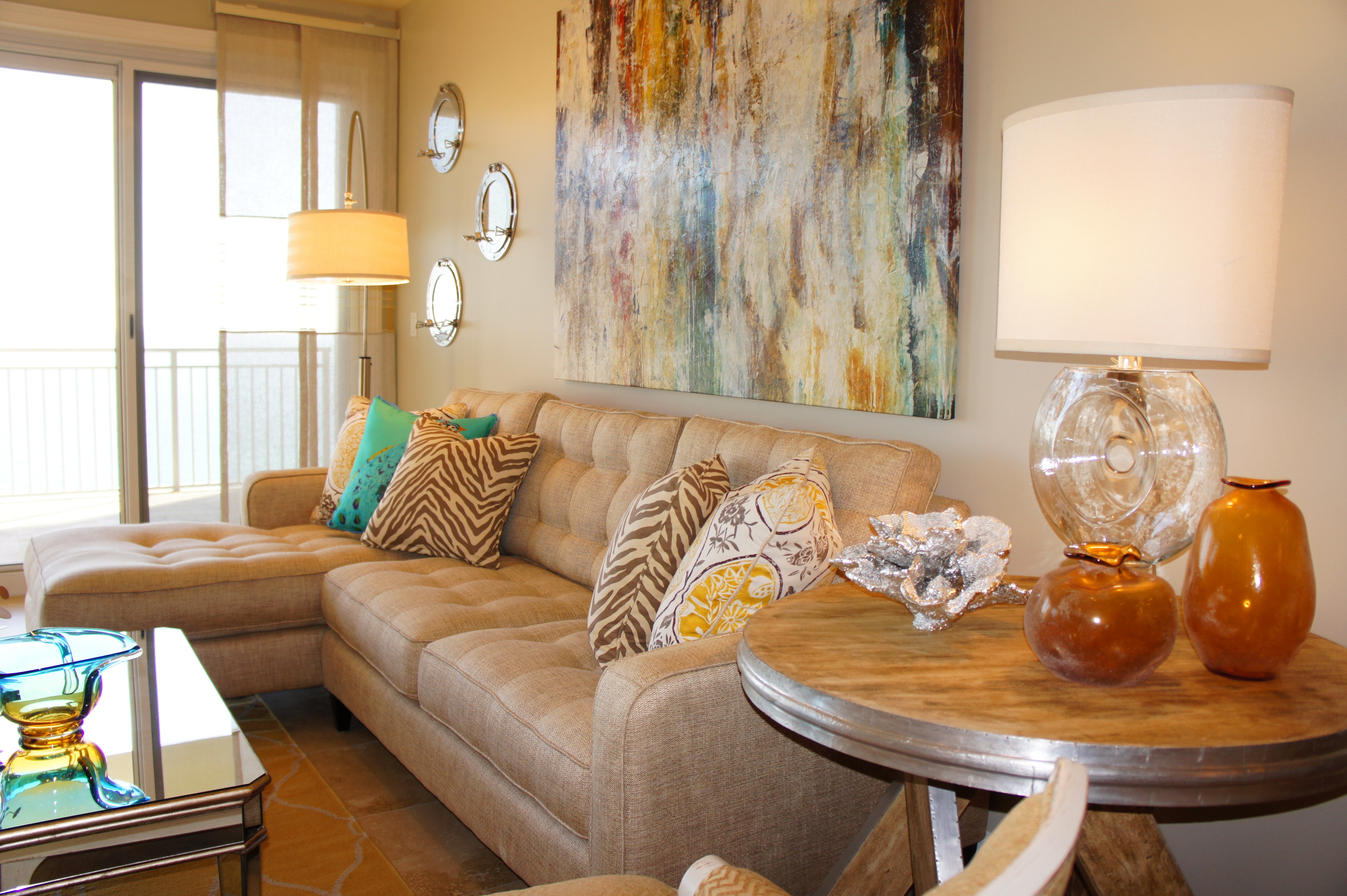 This unit provides a glorious view of the sunset in the evenings. In the foreground above, you will see the reclaimed wood sofa table we used, topped with the oval art glass from Fusion Art Glass. In this sculpture are 3-dimensional impressions of fish, finished in golds that sparkle when the light shines on it.
