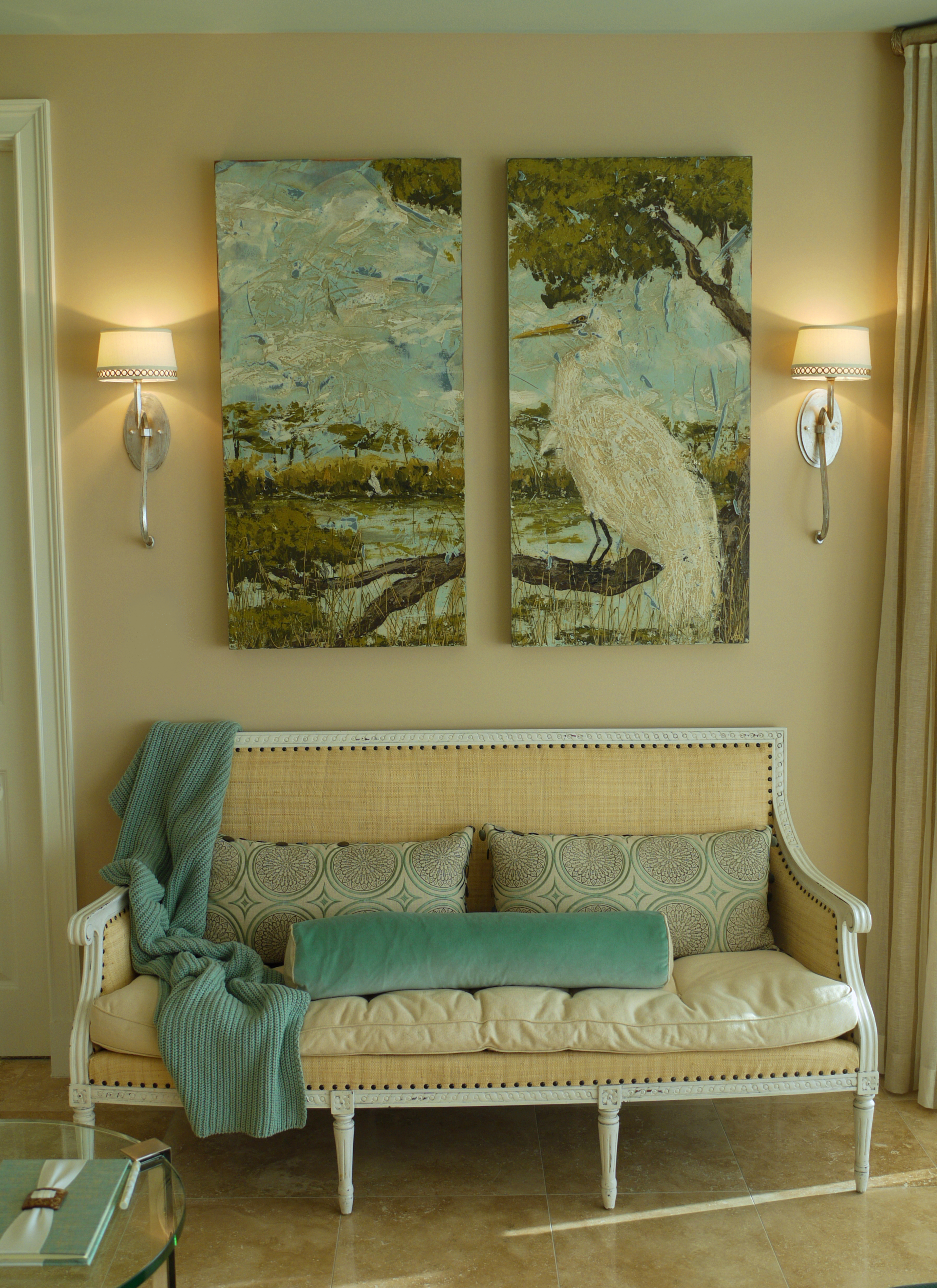 Opposite the entertainment unit is this wall, which is adorned with some commissioned original art by local artist Allison Wickey, and sconces by Fine Art Lamps. The French settee is finished in antique white, and upholstered in raffia, with a linen tufted seat cushion. To add color, I had these two custom kidney pillows made and trimmed it with moon shell fringe from Kravet’s Barbara Barry collection. The green velvet bolster was actually made for one of the bedrooms, but worked out perfectly here instead!