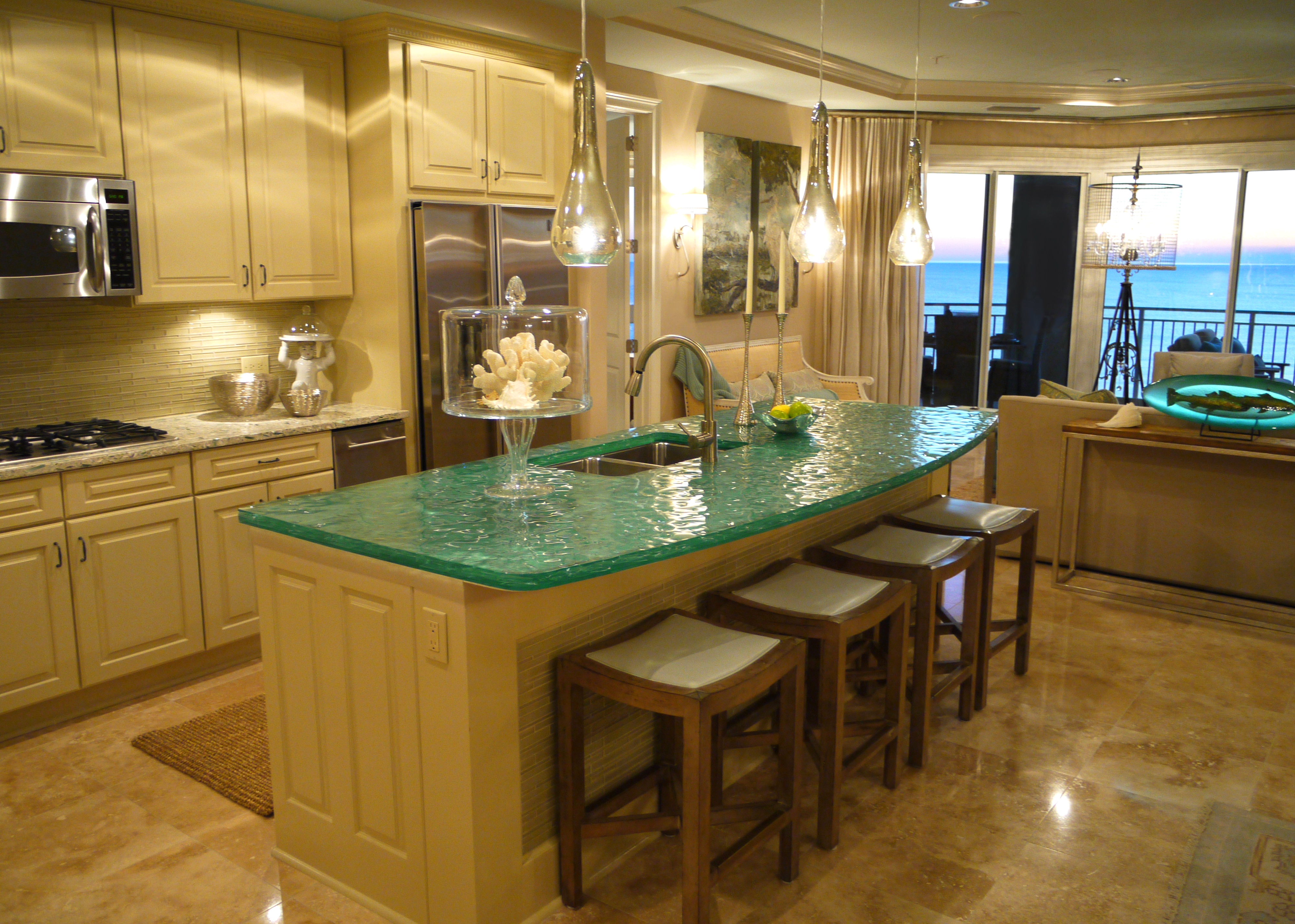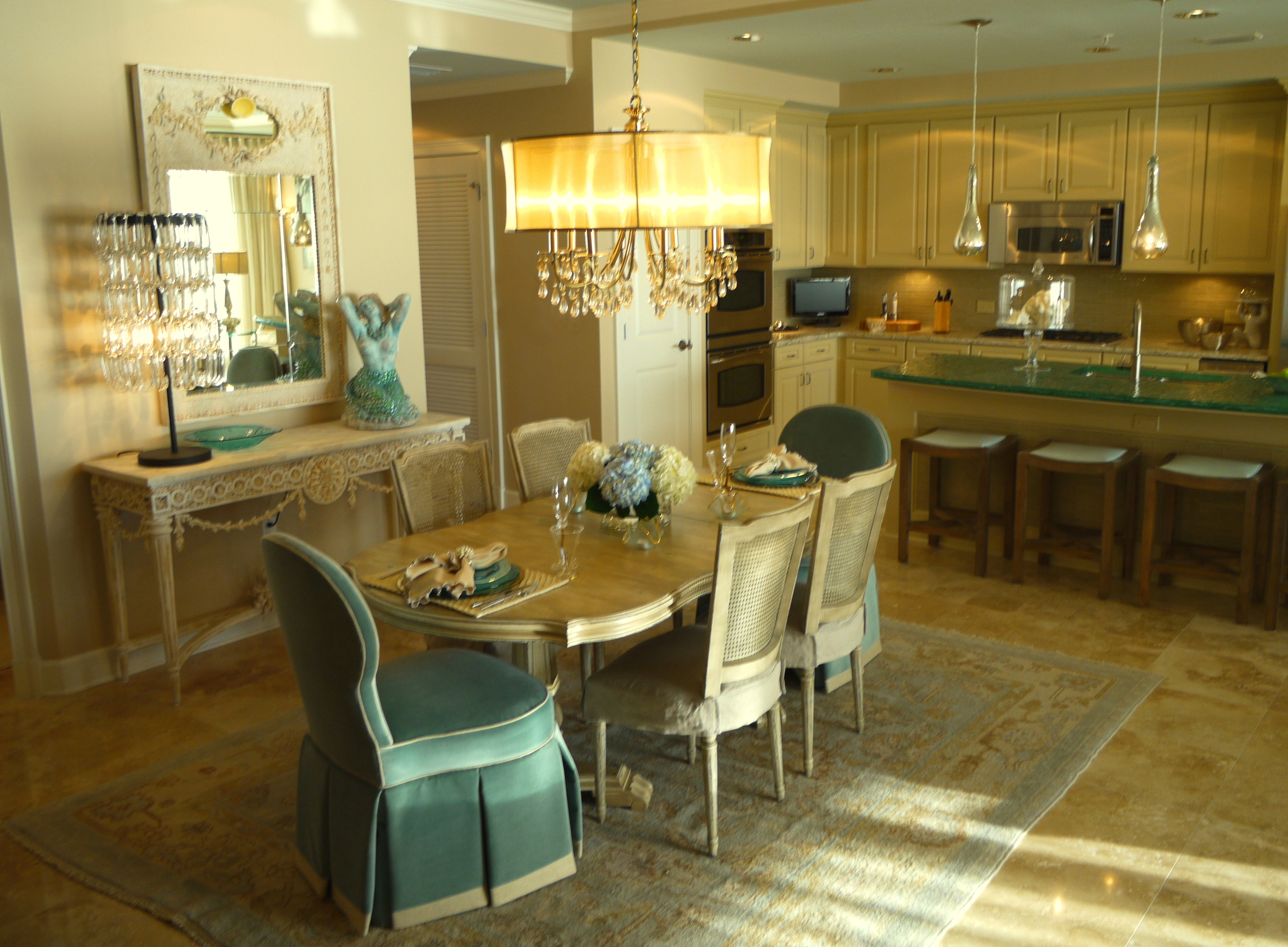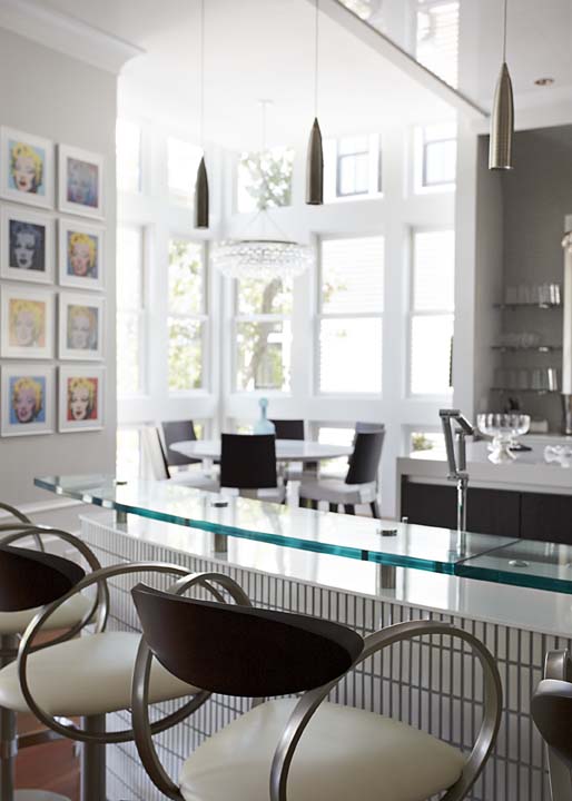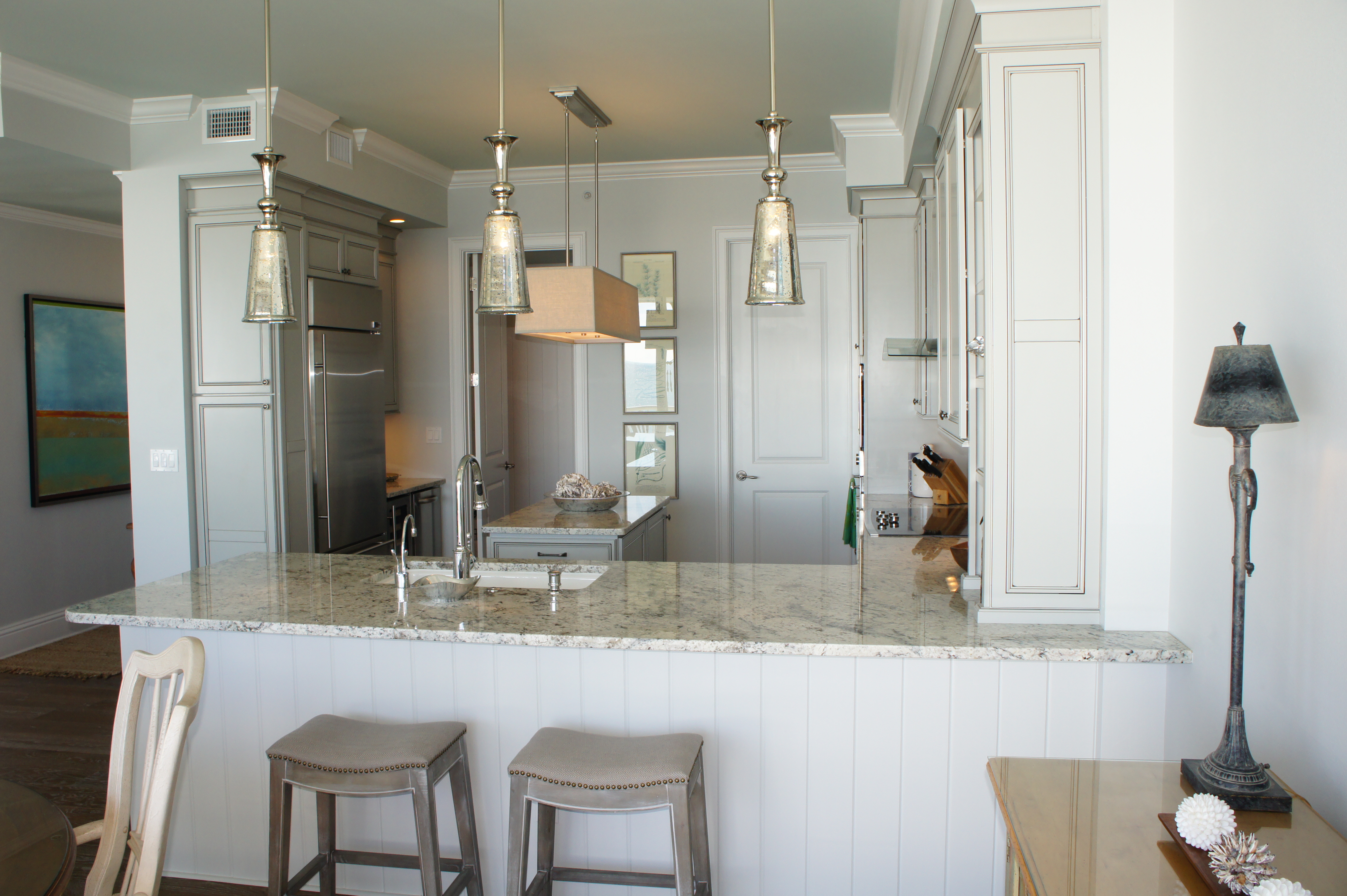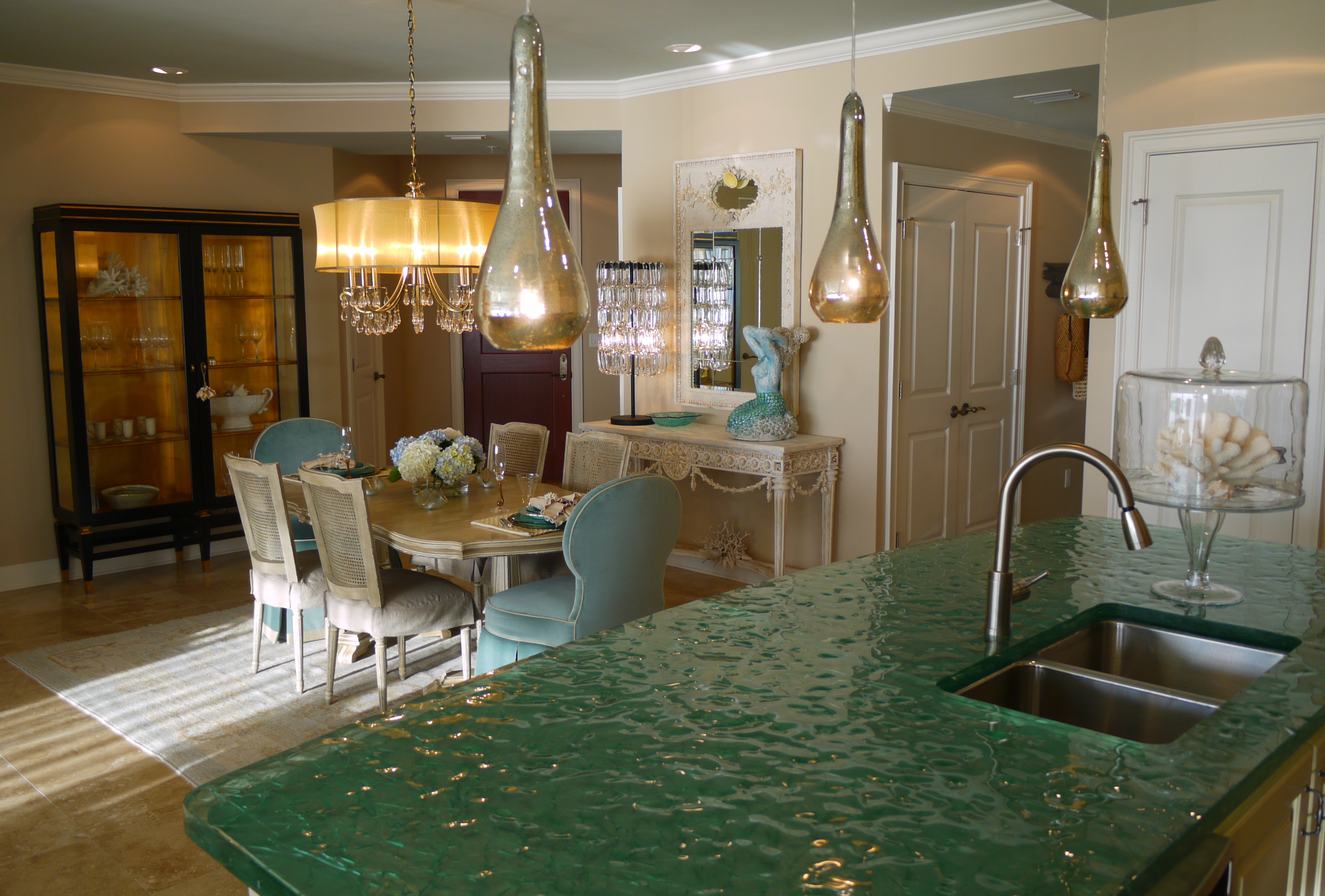 Here you can see how the glass island added a beautiful punch of color that picked up on the water outside. I replaced their pendant lights with these mercury glass pendants from Arteriors that look like they are dripping from the ceiling. The counter stools are by Lee Industries, and are covered in ice blue leather.
