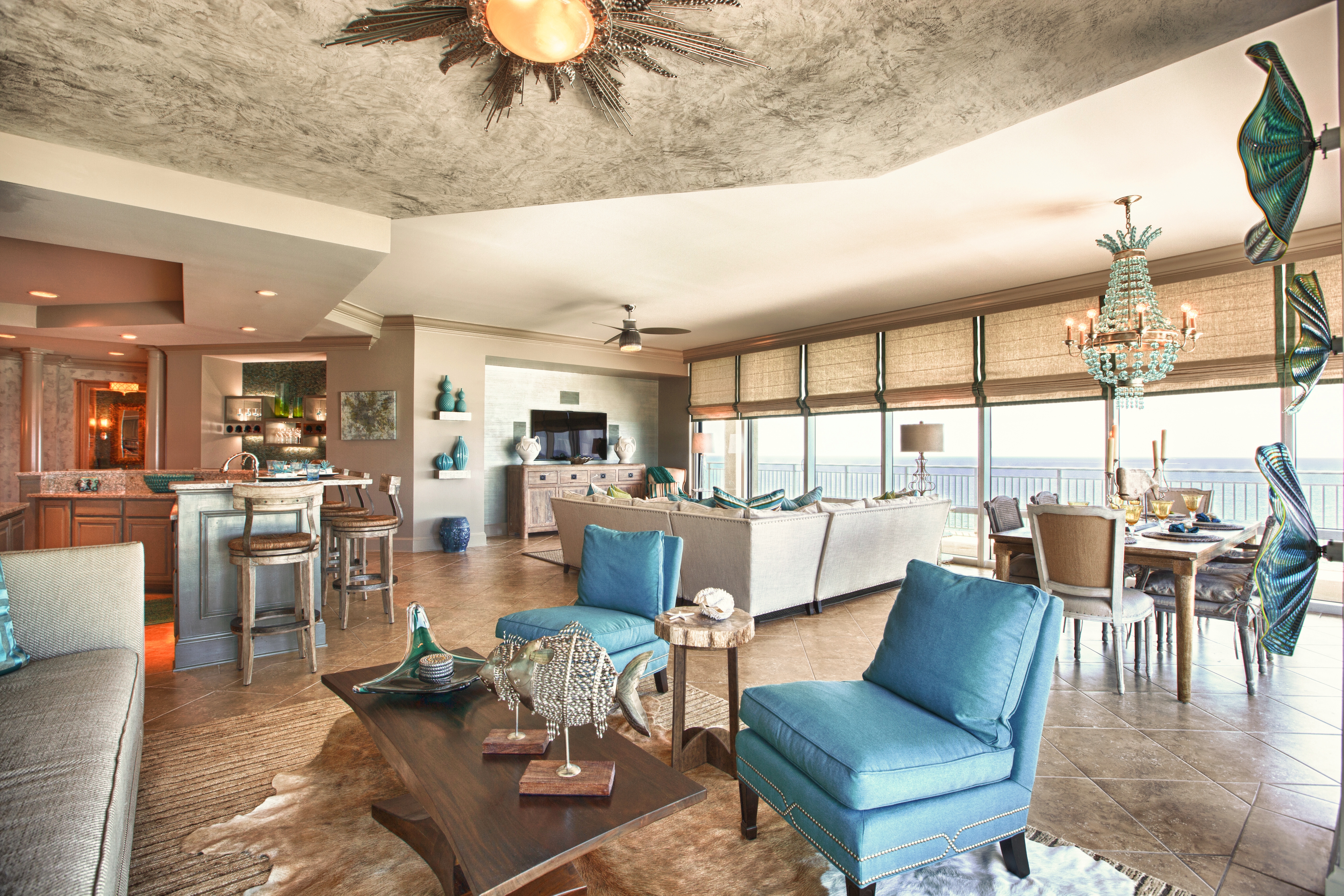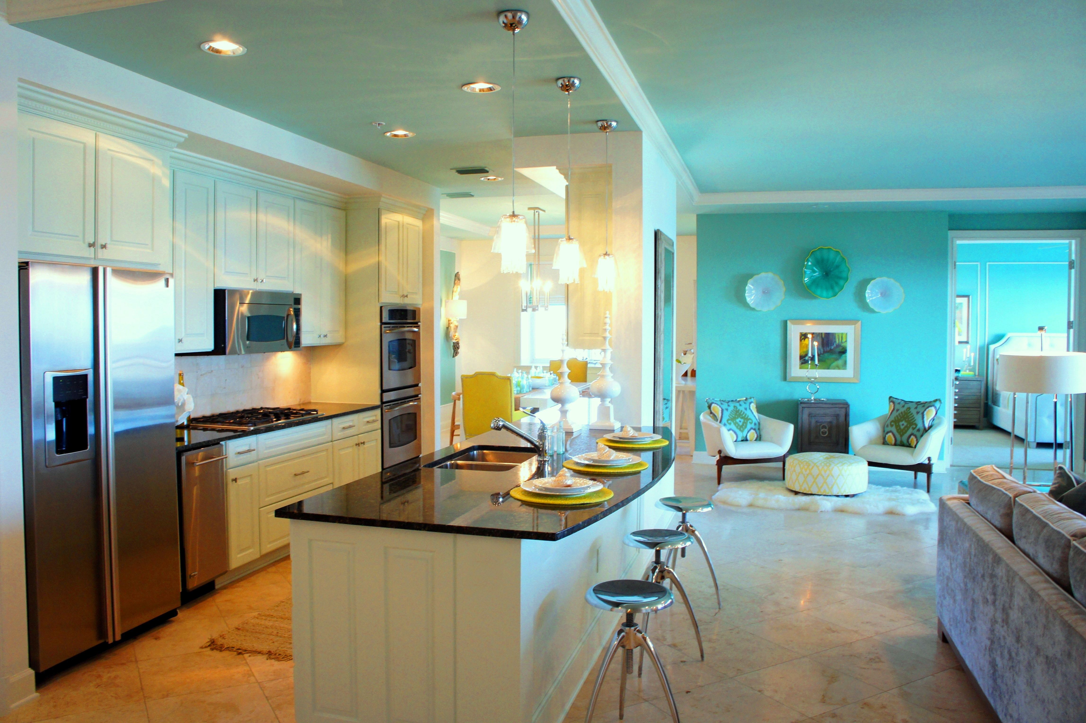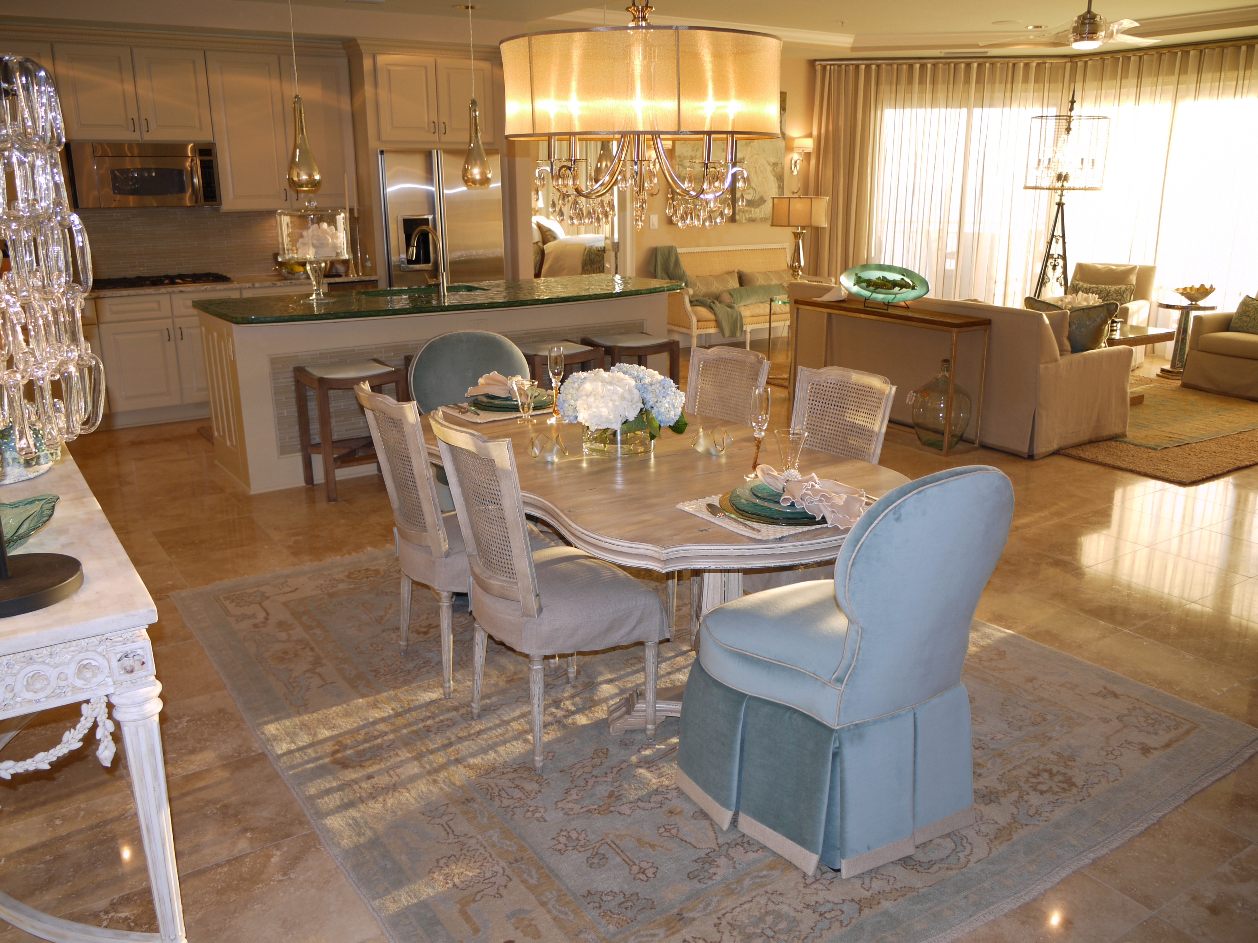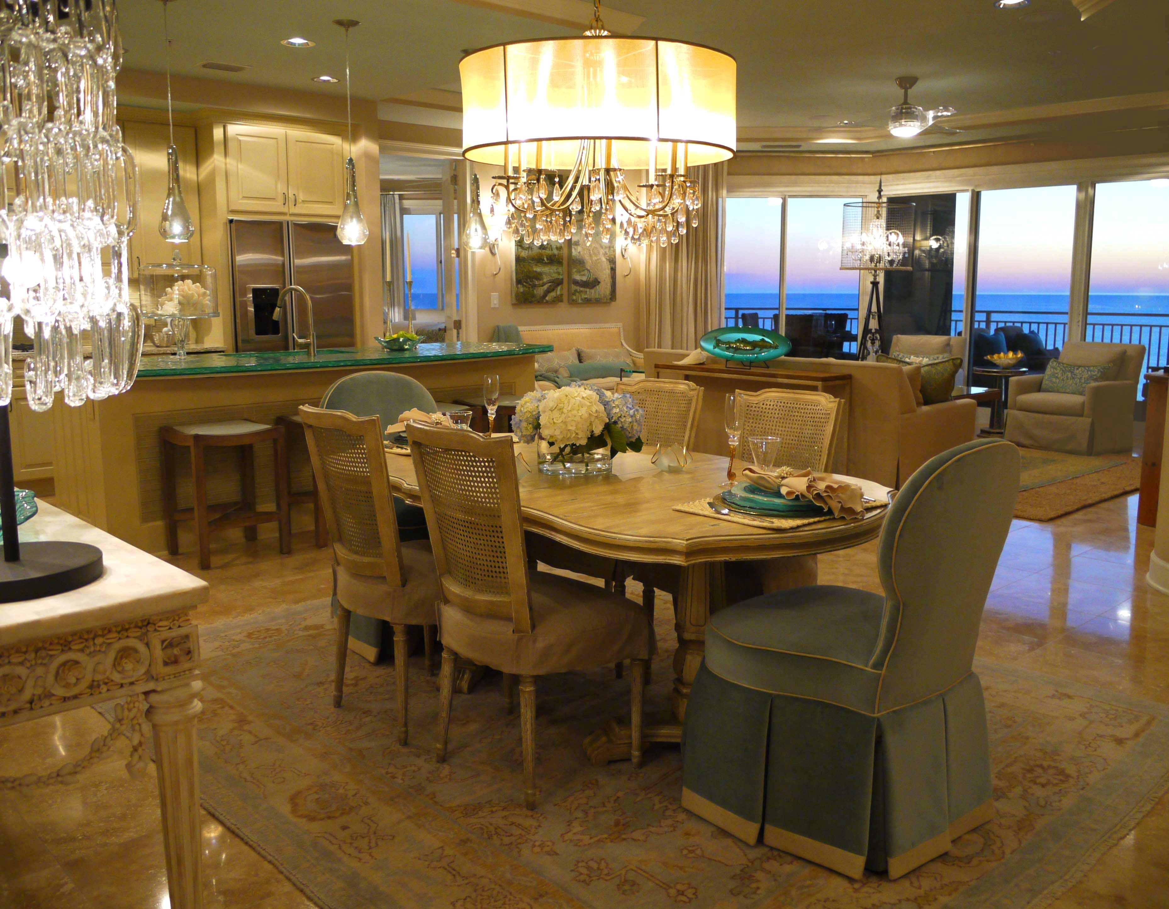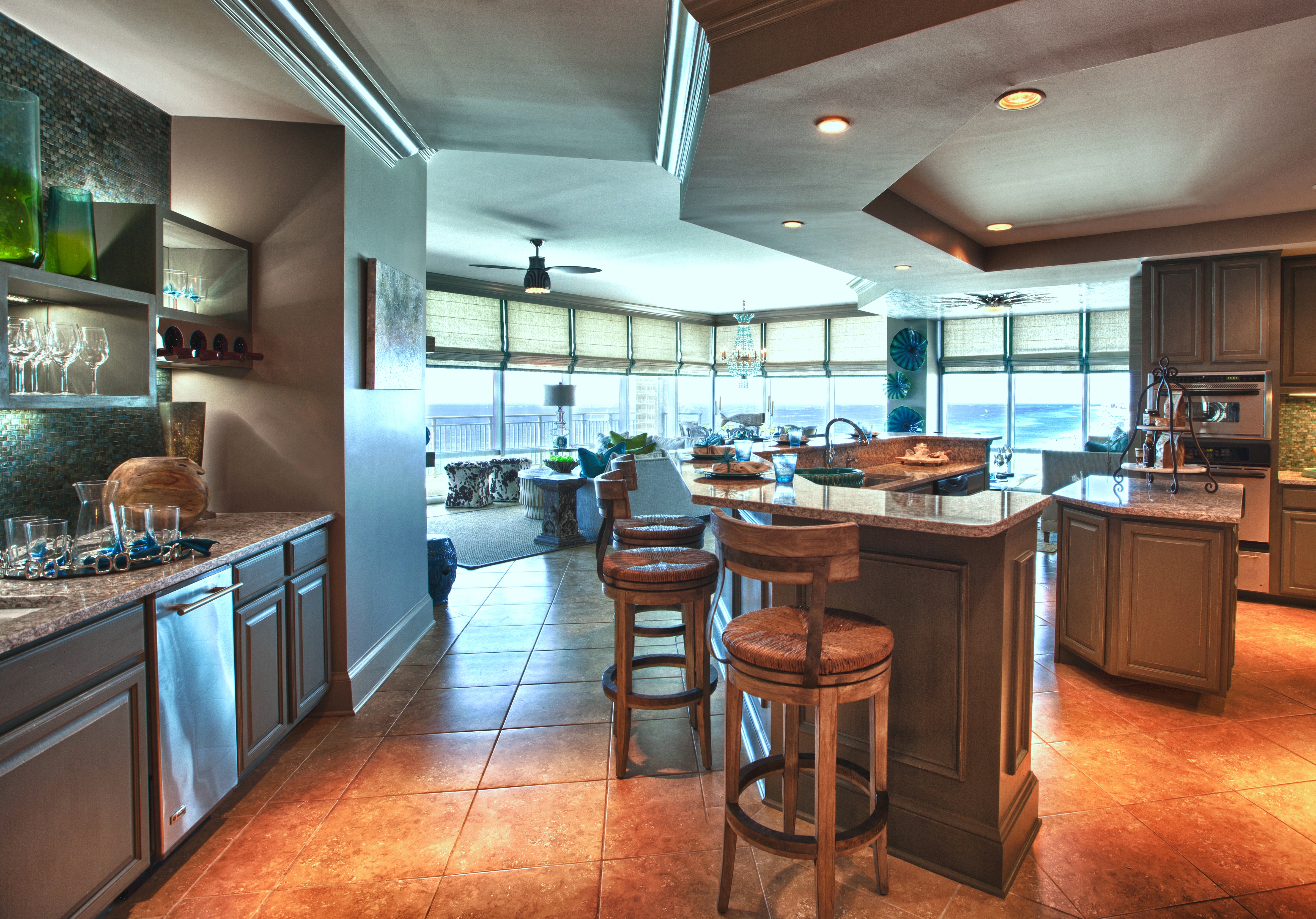Here you can see how the glass island added a beautiful punch of color that picked up on the water outside. I replaced their pendant lights with these mercury glass pendants from Arteriors that look like they are dripping from the ceiling. The counter stools are by Lee Industries, and are covered in ice blue leather.