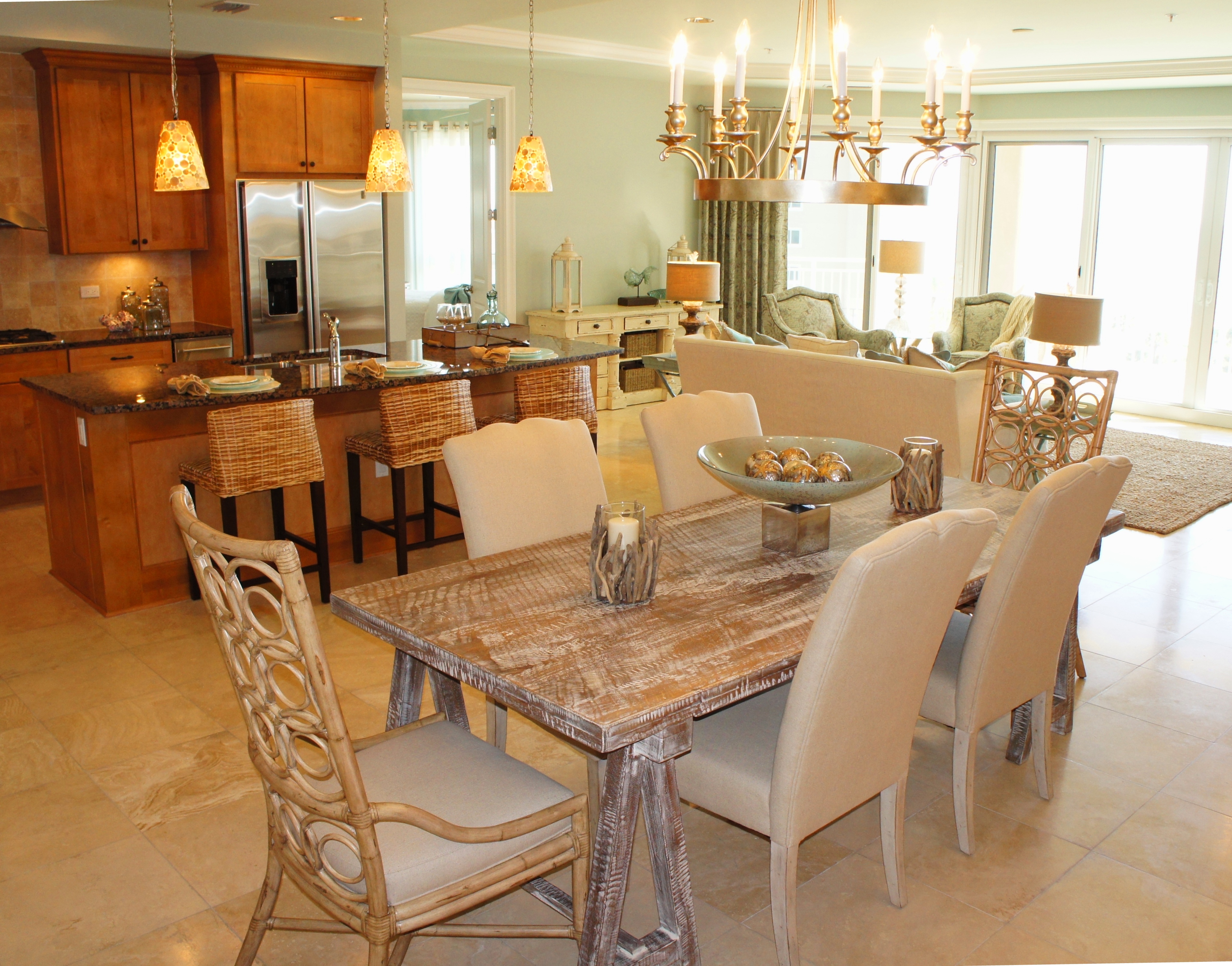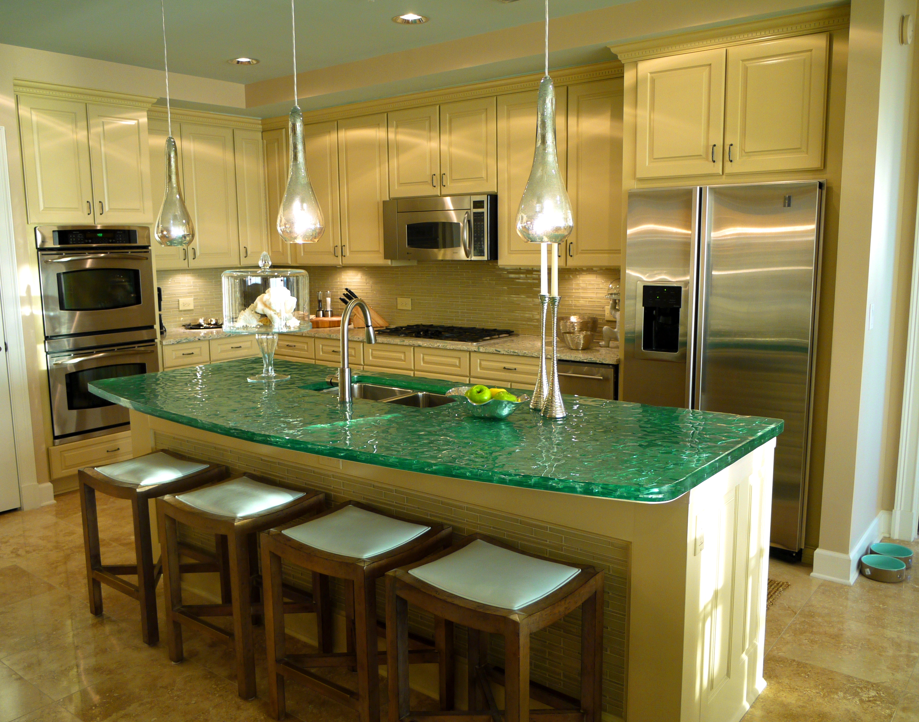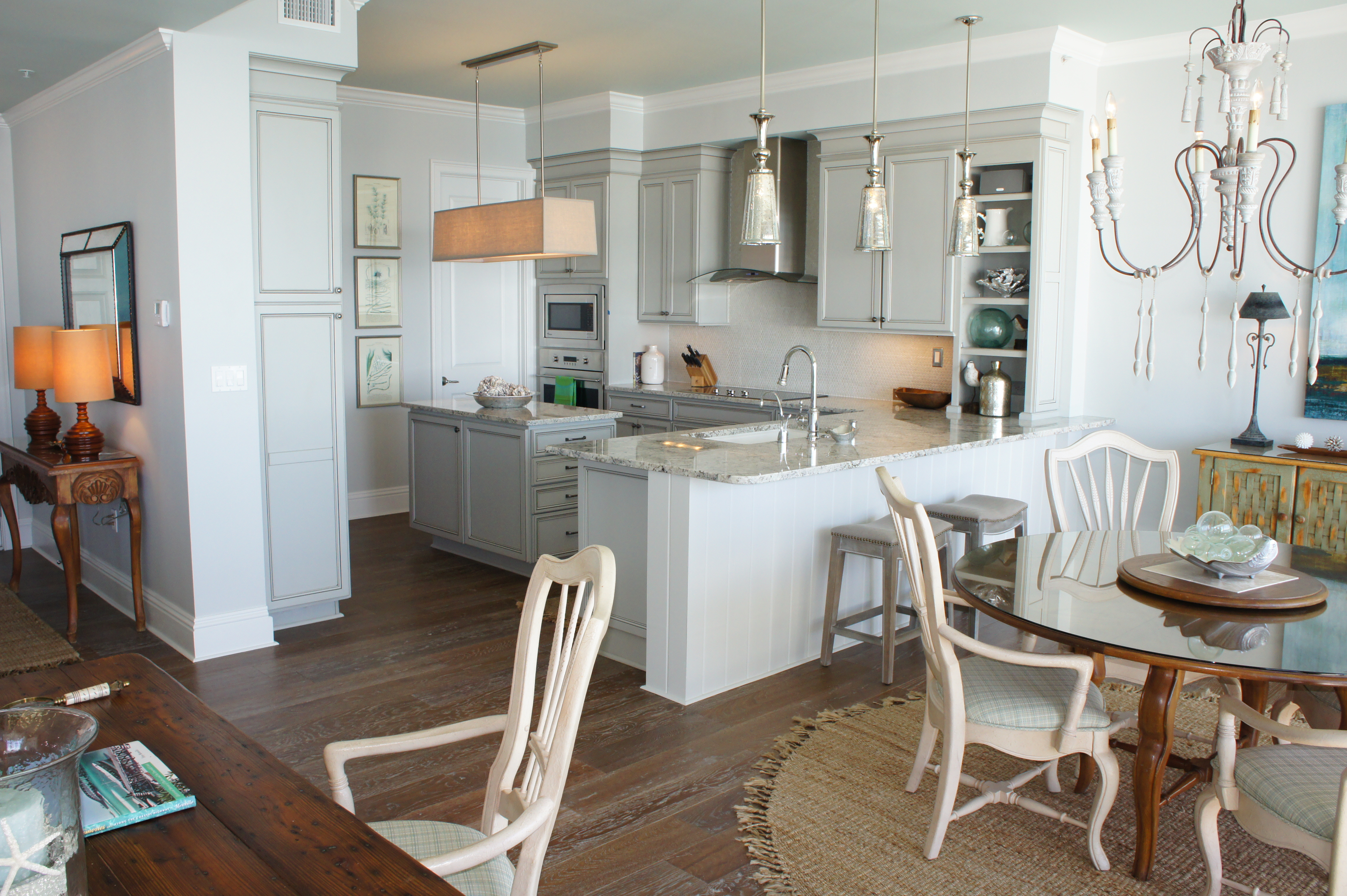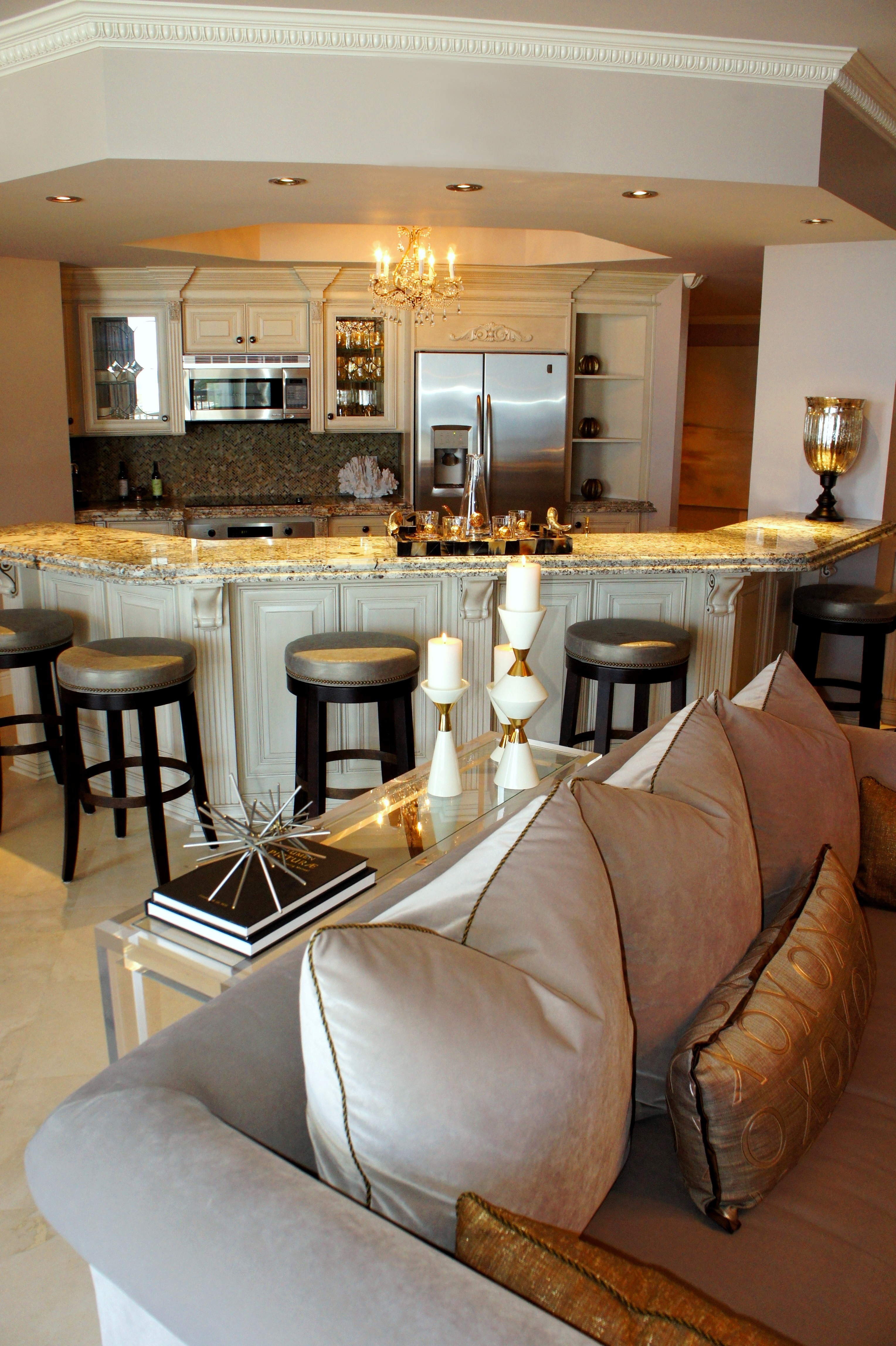 Here you can see how the glass island added a beautiful punch of color that picked up on the water outside. I replaced their pendant lights with these mercury glass pendants from Arteriors that look like they are dripping from the ceiling. The counter stools are by Lee Industries, and are covered in ice blue leather.