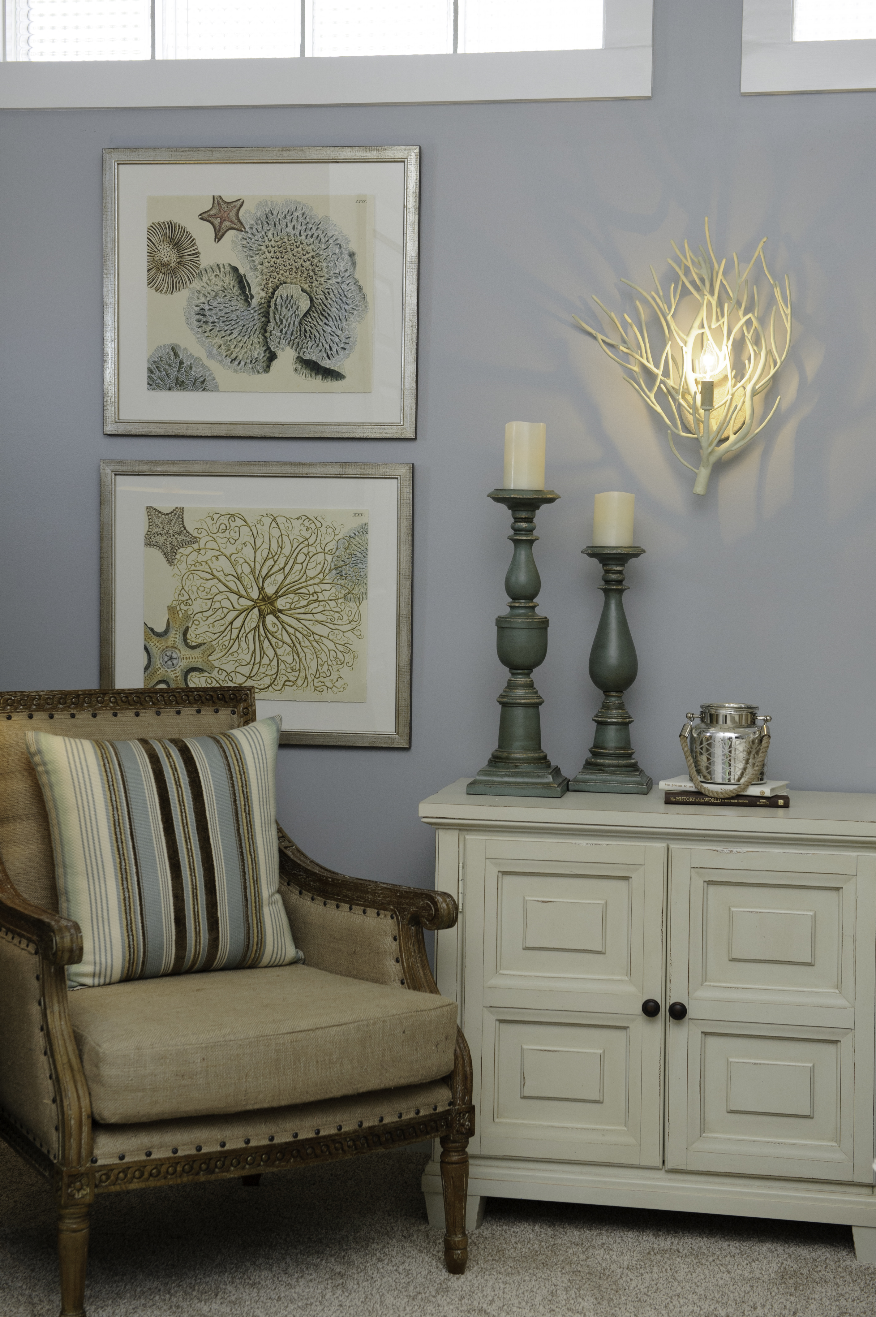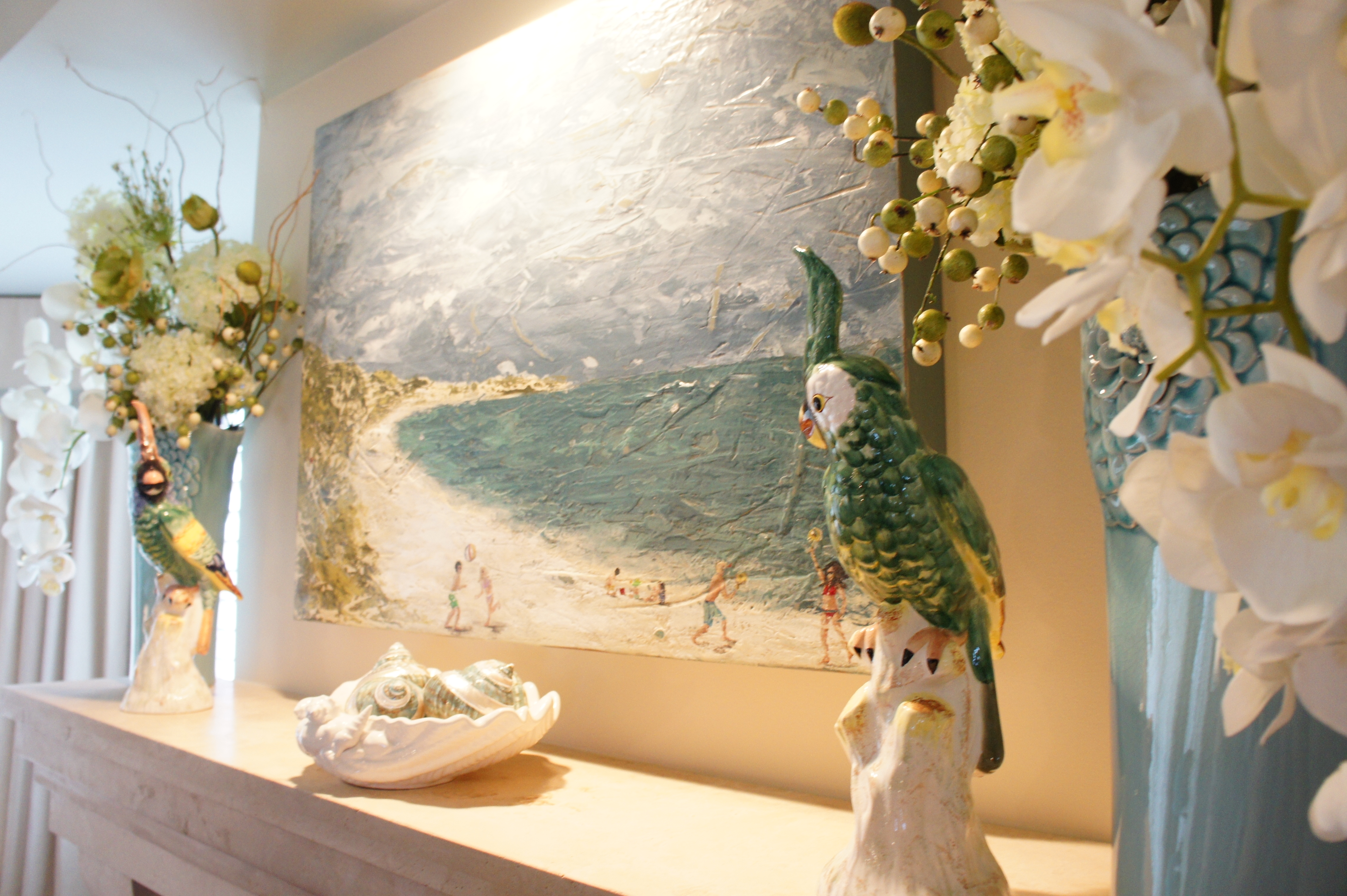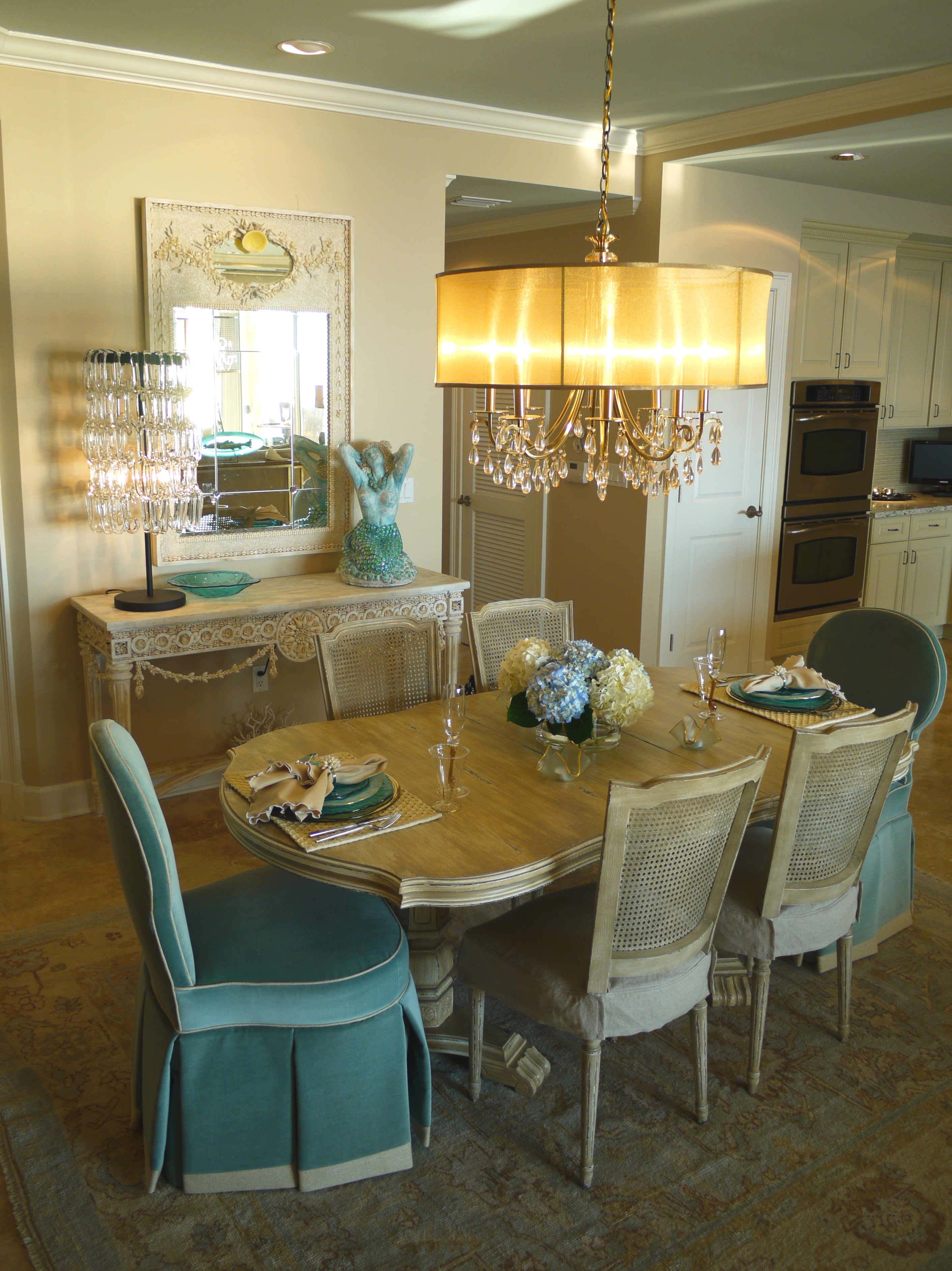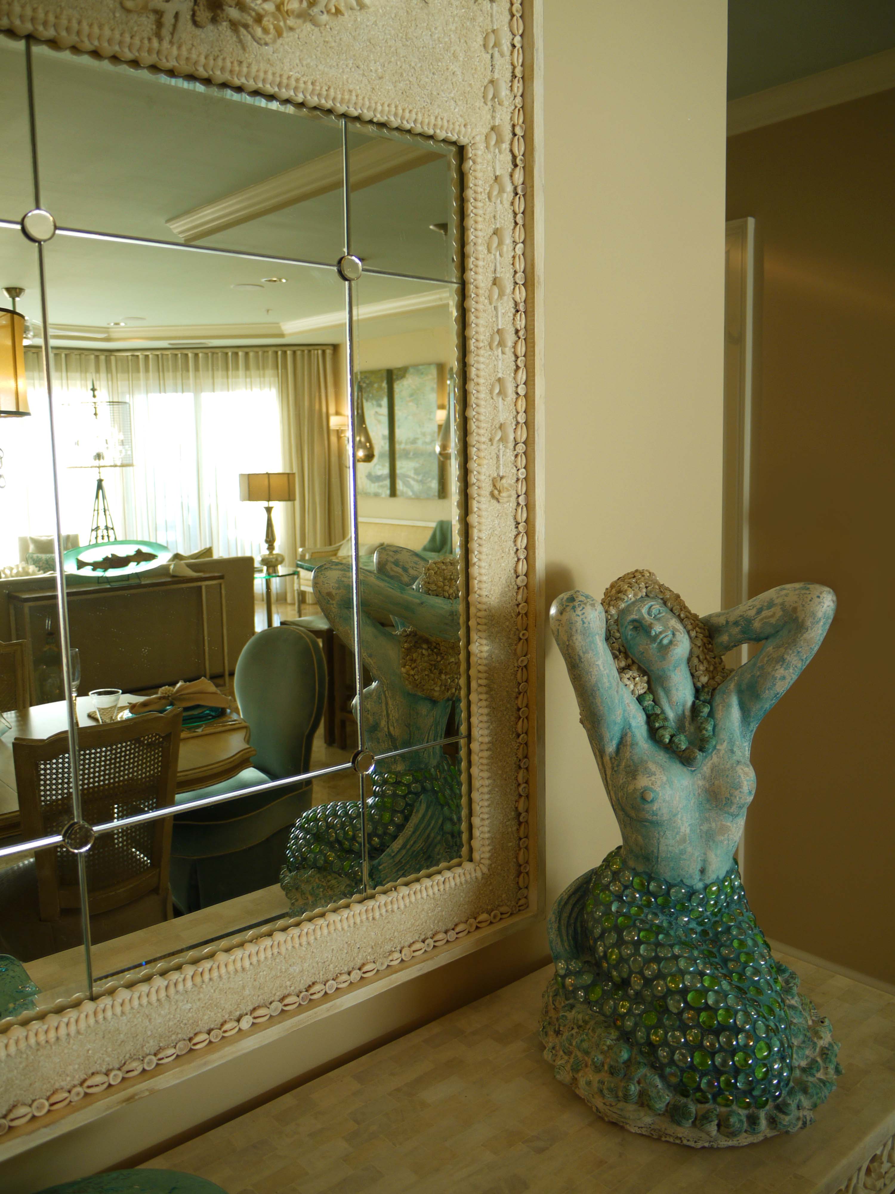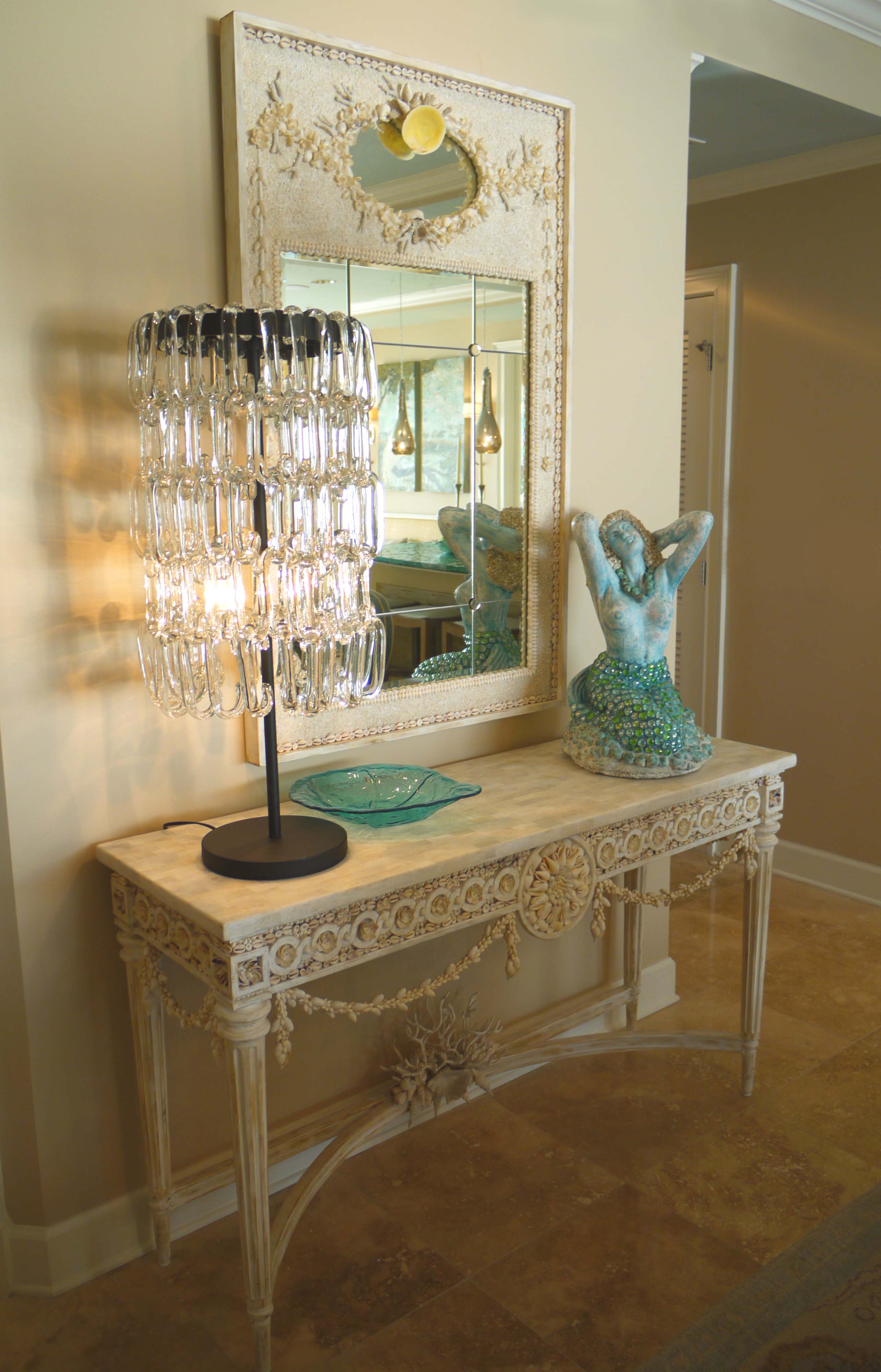 The Currey & Company dining sideboard is heavily adorned in shells and coral, and topped with white marble. Above it is the matching wood and shell trumeau mirror. These two pieces were the epitome of “crusty-chic” with its distressed finishes and bleached shells, arranged into a classic and timeless form. I accessorized with this fabulous lamp with draped glass by Global Views. Opposite is a mermaid sculpture with shell and iridescent glass accents.