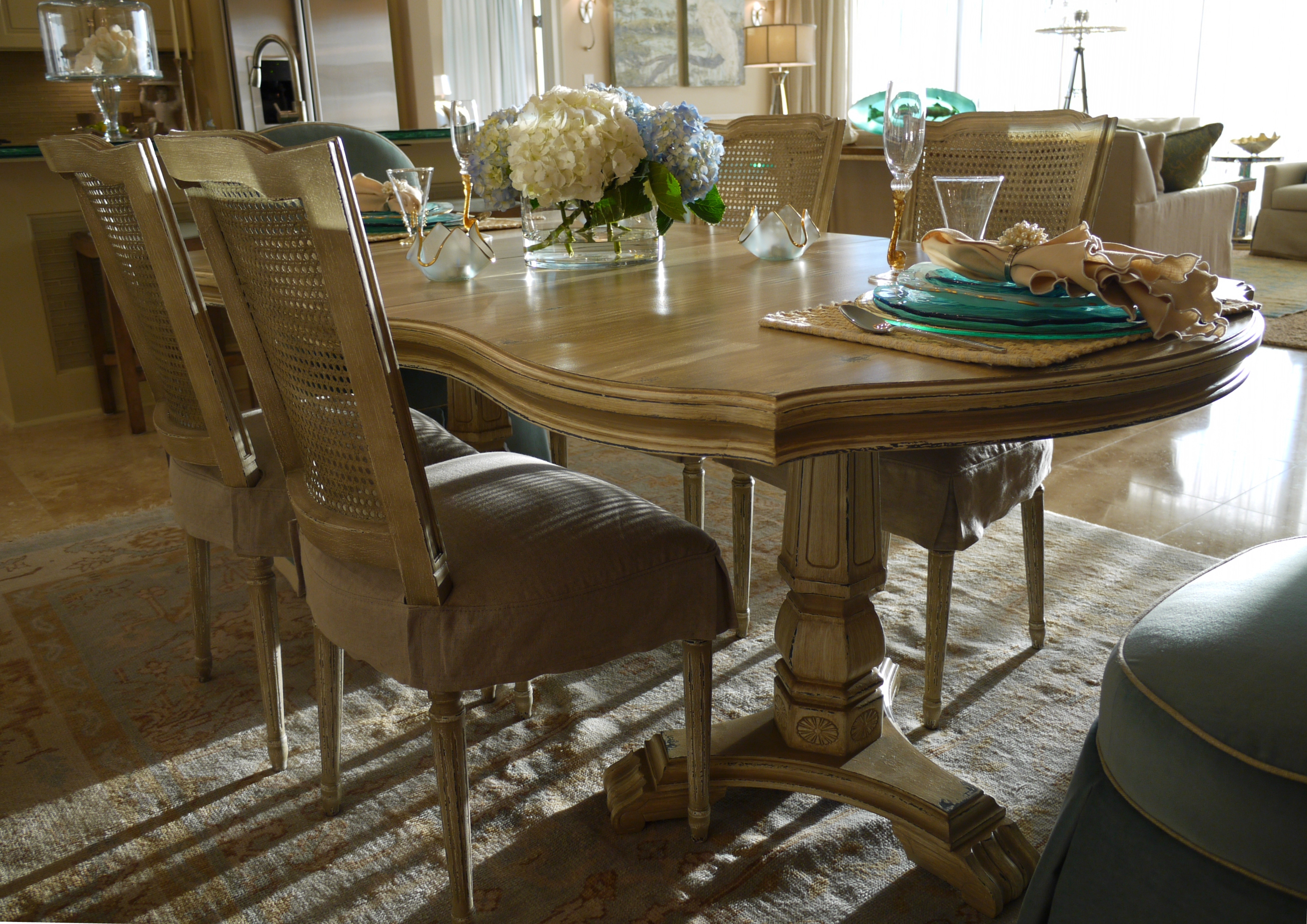 The dining table is an old, inexpensive table I found at an antique store and had faux finished by local artist, Polly Yokum, to match the dining side chairs. I loved this table because of the undulating curves of the top, and because of the details on the pedestal bases. I knew this would clean up beautifully—the lines of it were wonderful!