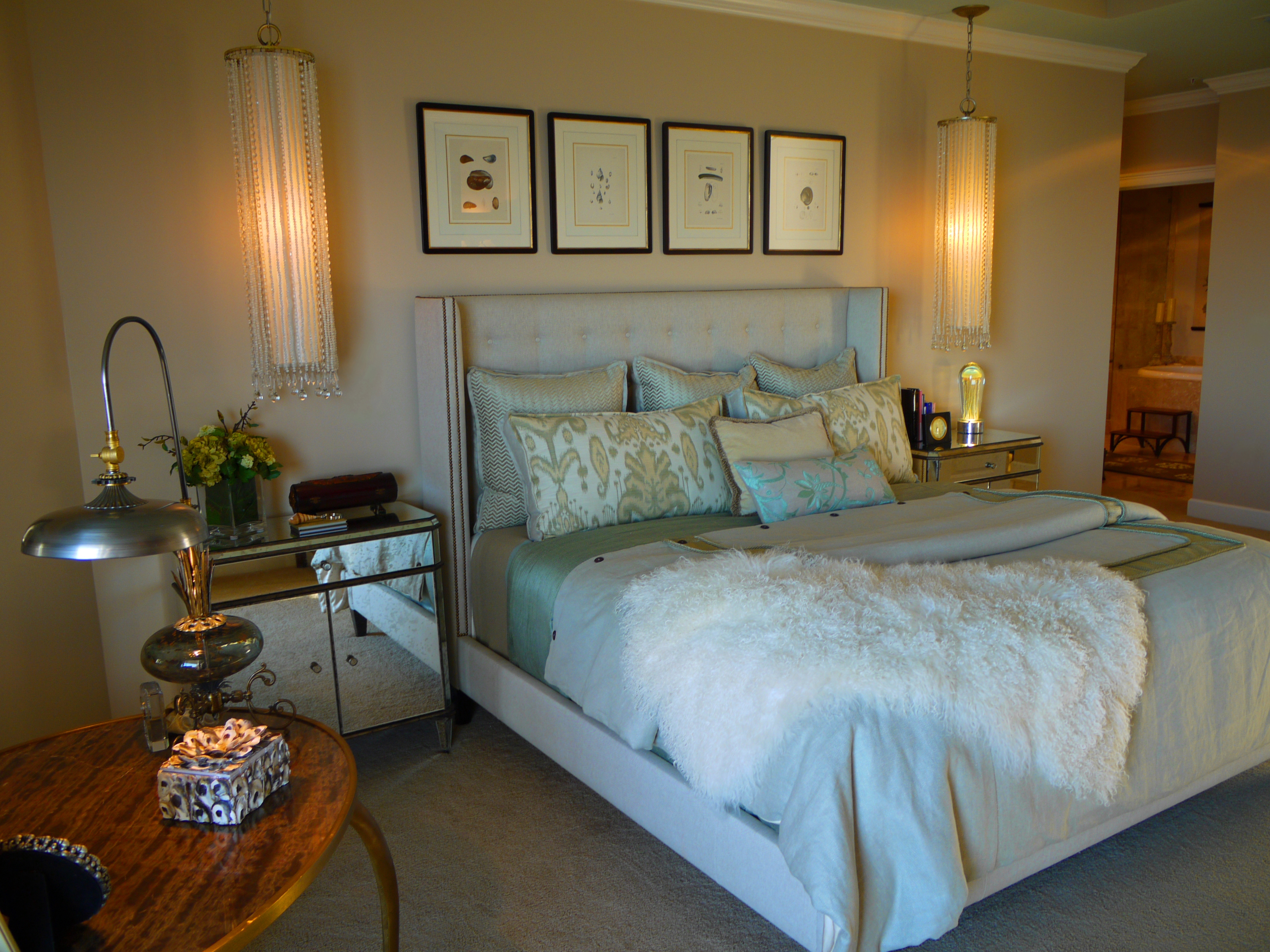 The Master Bedroom shows off an upholstered king bed by Oly, antique mirrored nightstands by Currey & Company, and some fabulous bedside pendants. This is a wonderful alternative to lamps because they look more custom, and also free up space on your nightstands.