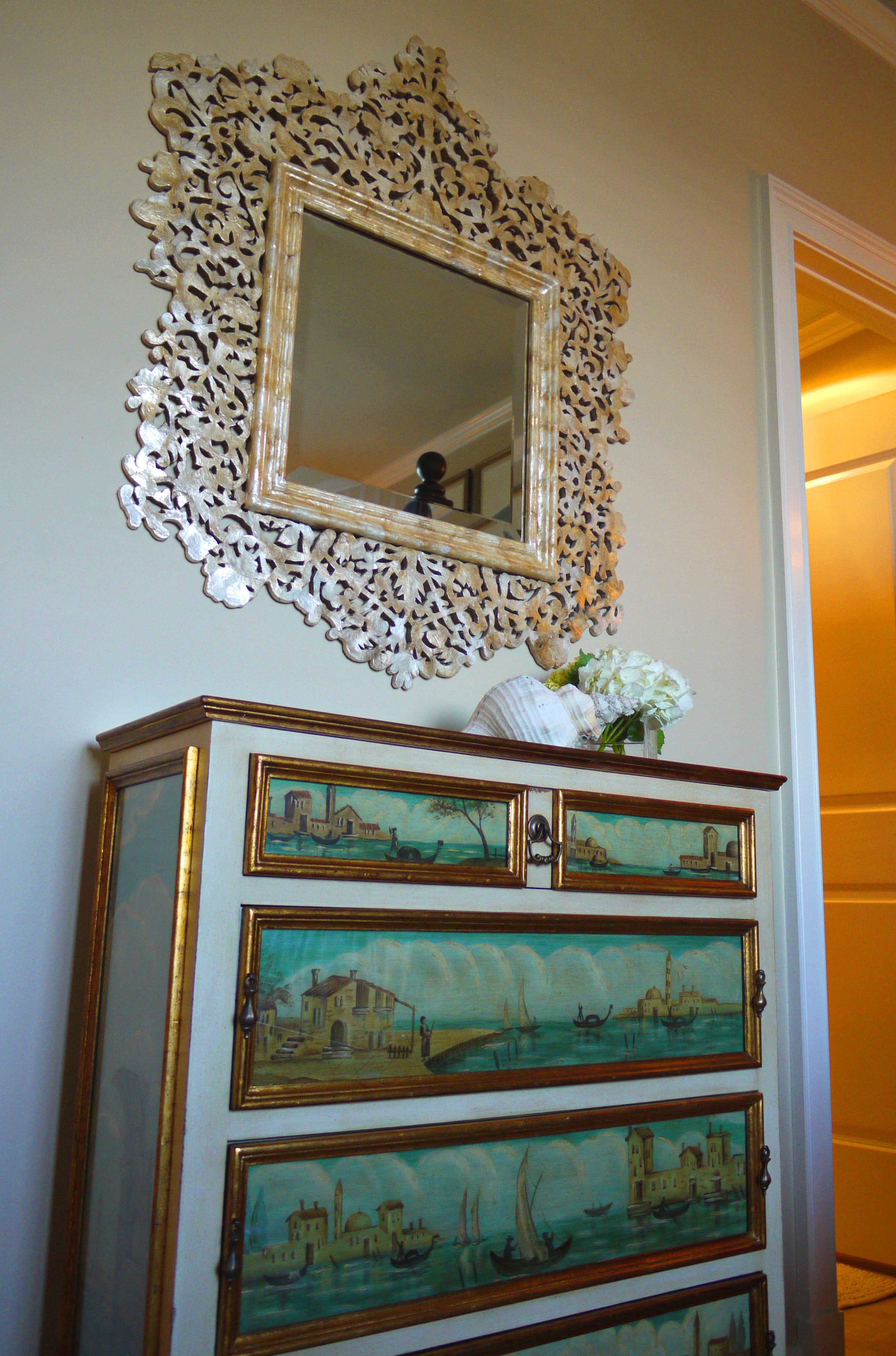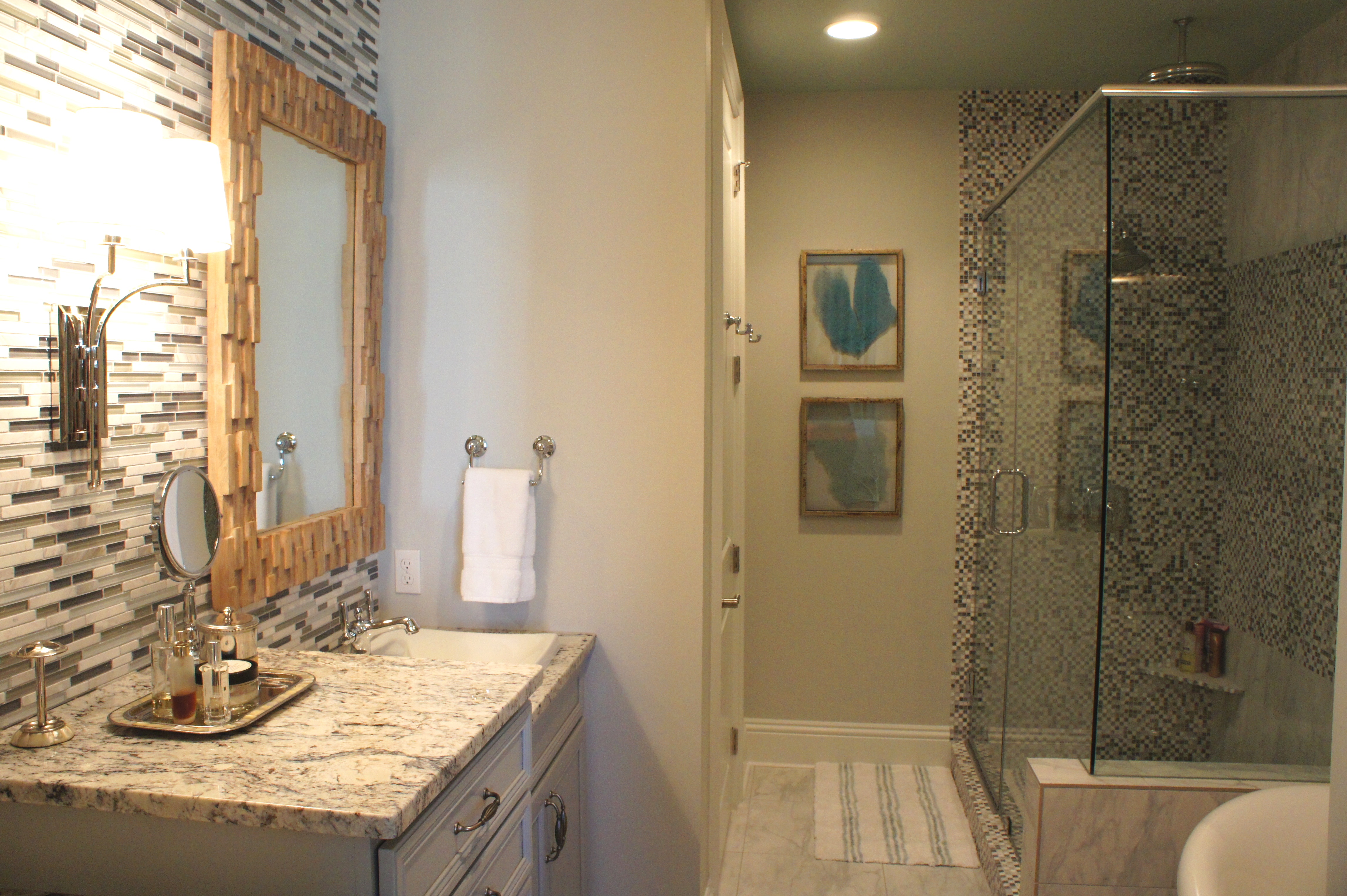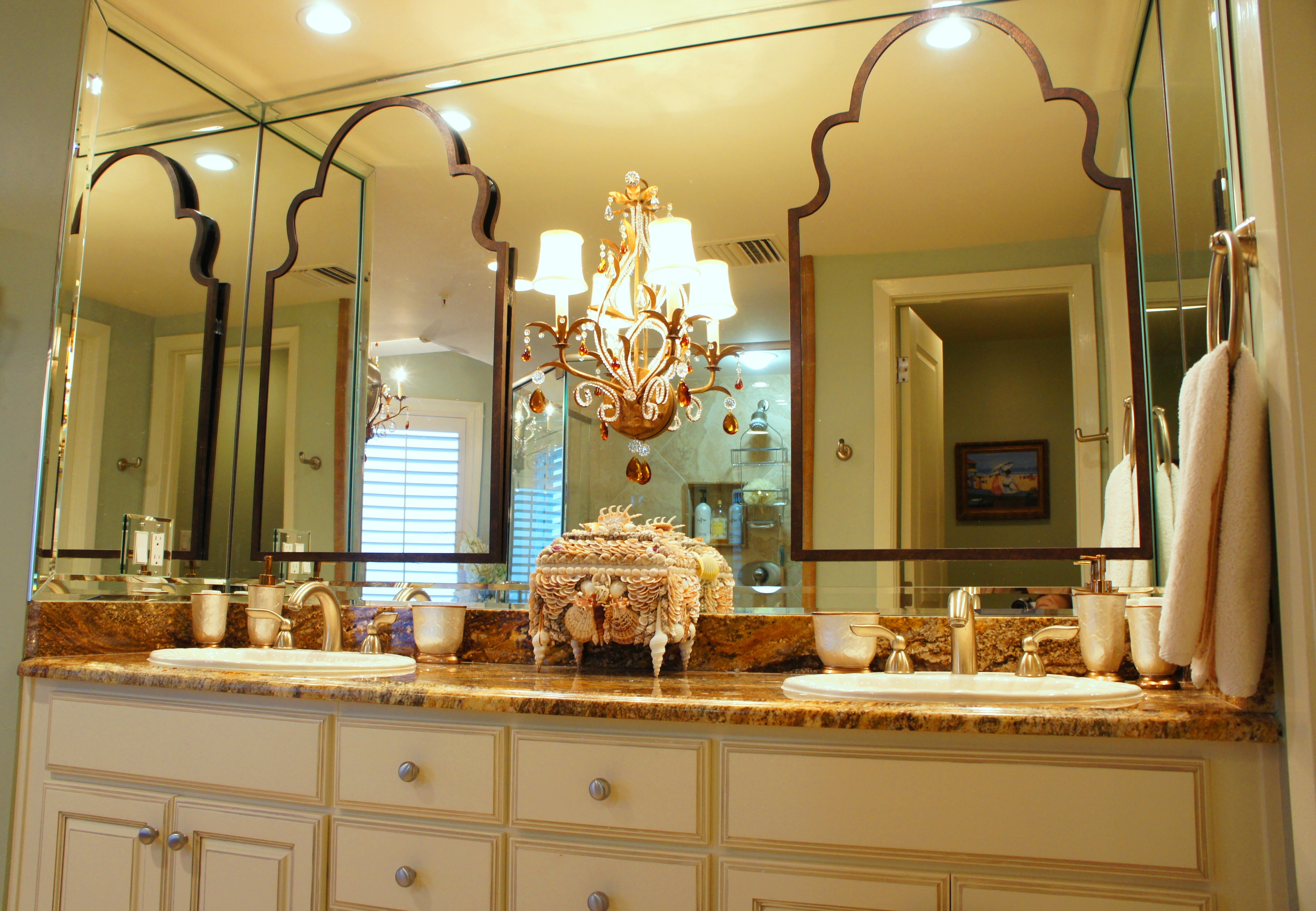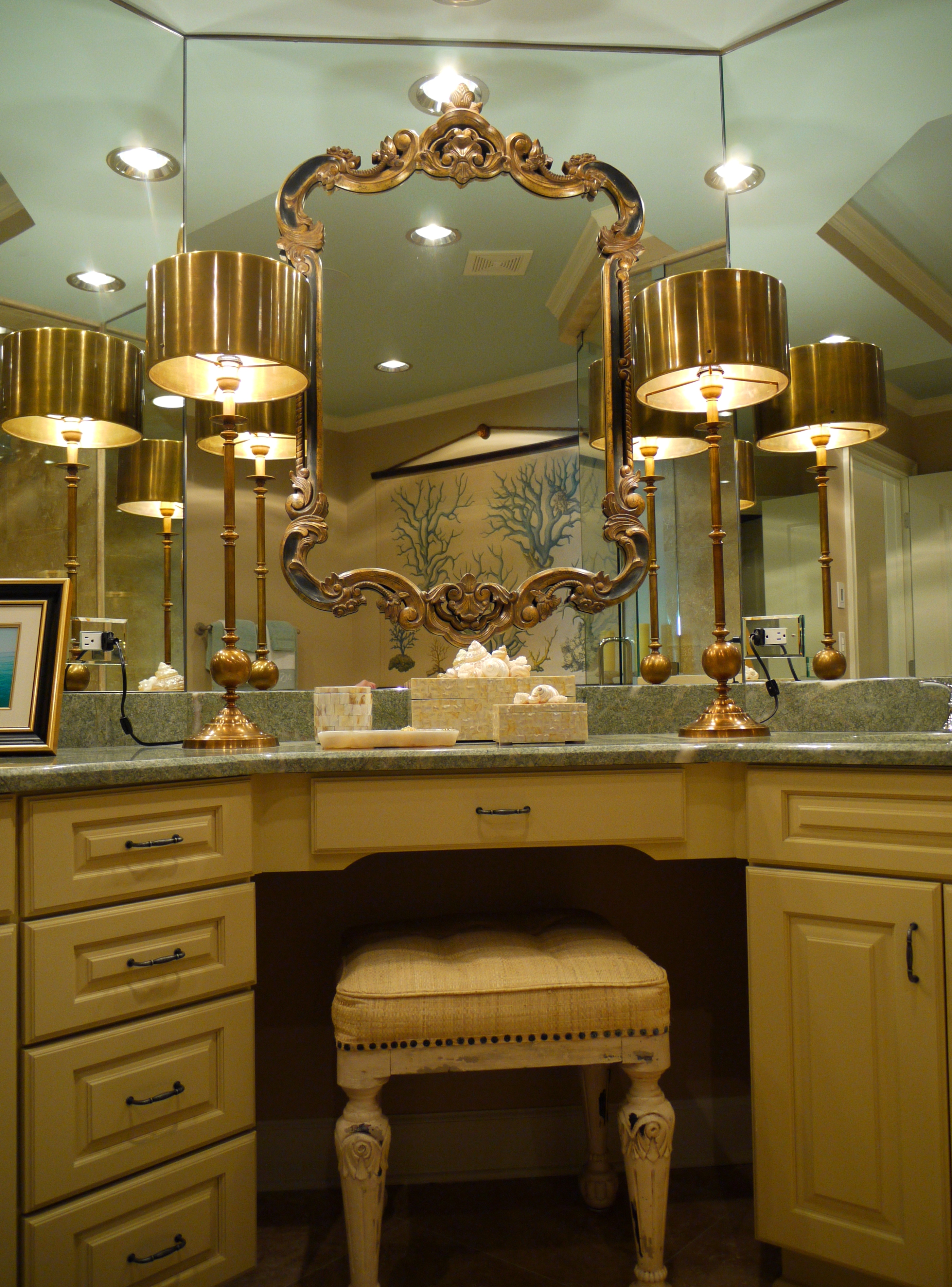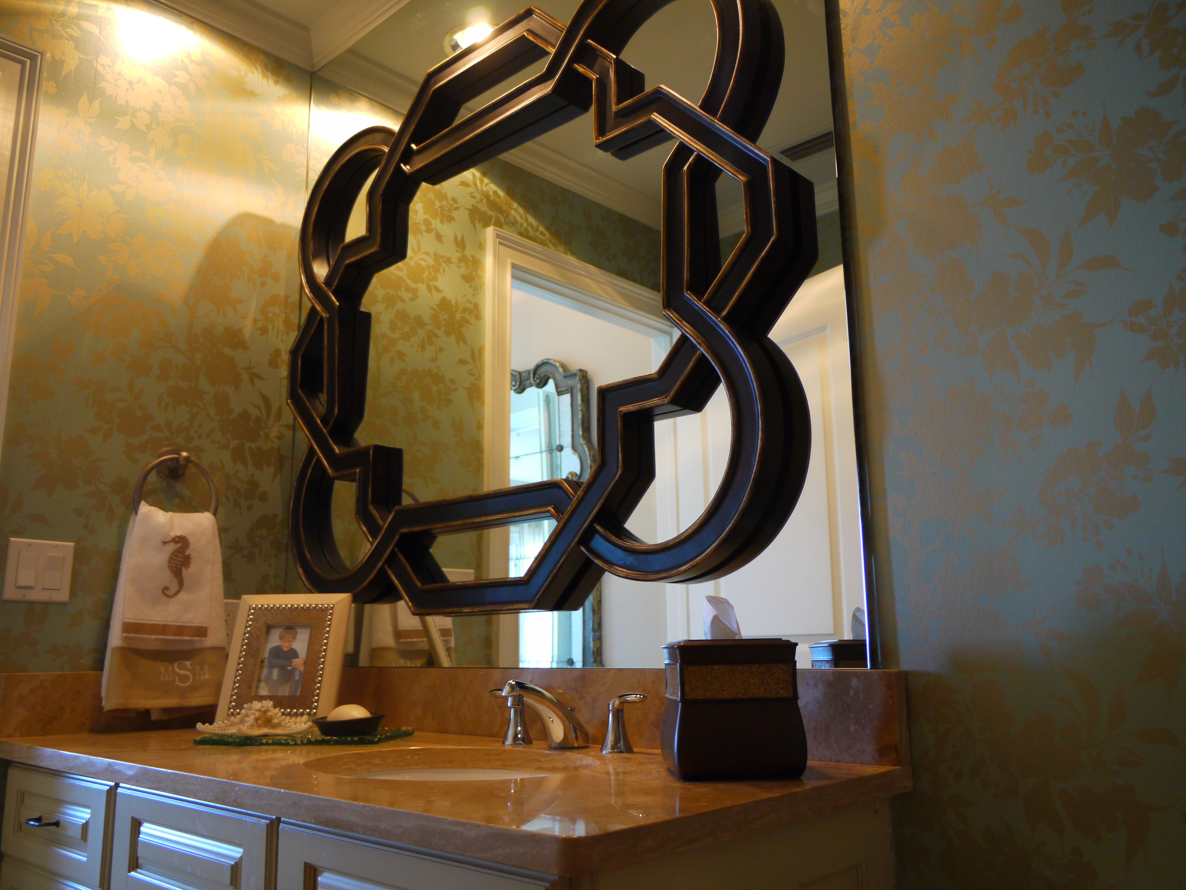 Here is the Master Bathroom. As you can see, I am a huge fan of “mirrors on mirrors”. In another example of layering, we dressed this bathroom up by adding one unique and beautiful LaBarge mirror over the vanity, mounted in front of the existing wall-to-wall mirrors. It is flanked by two Arteriors buffet lamps.