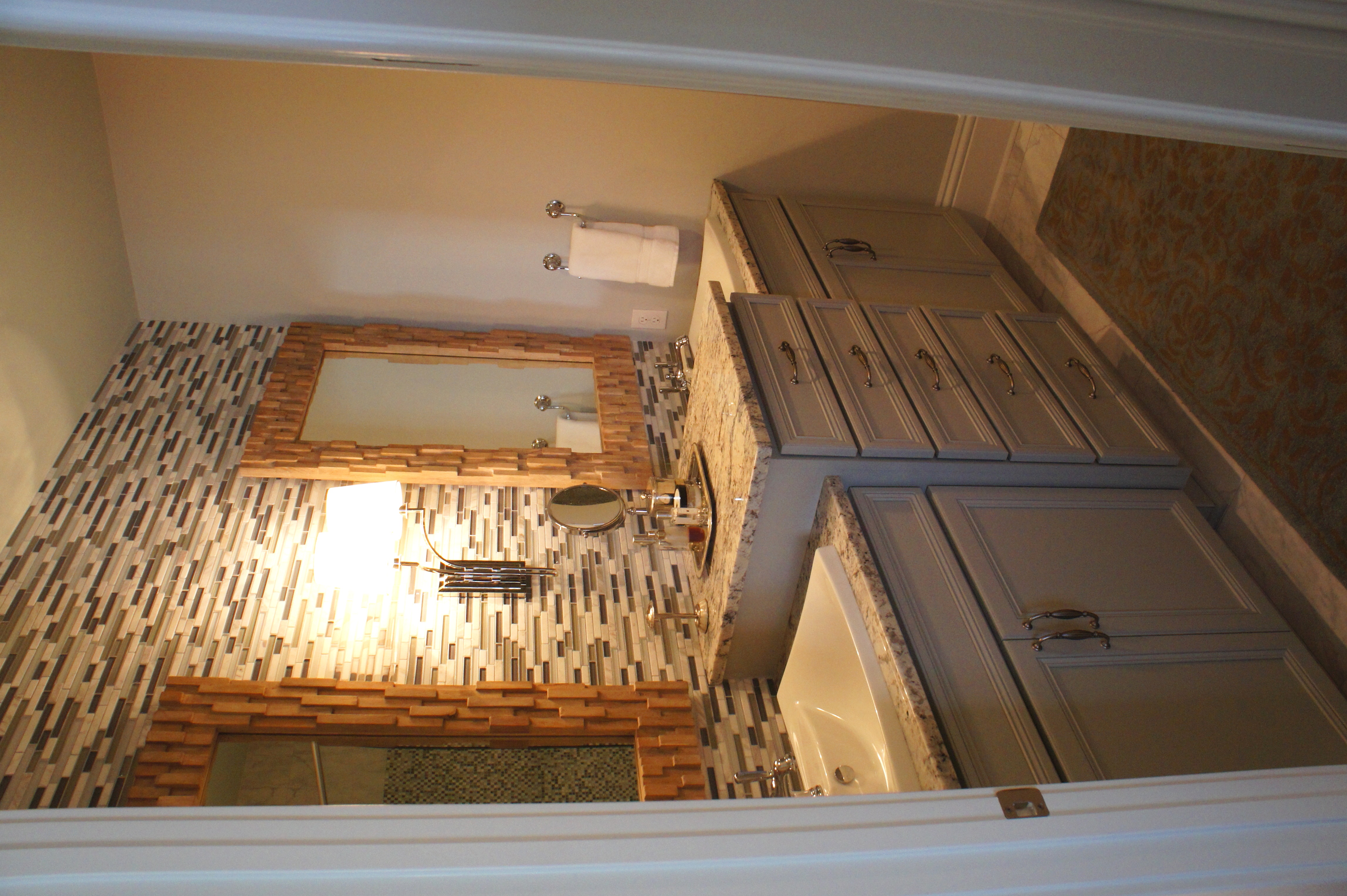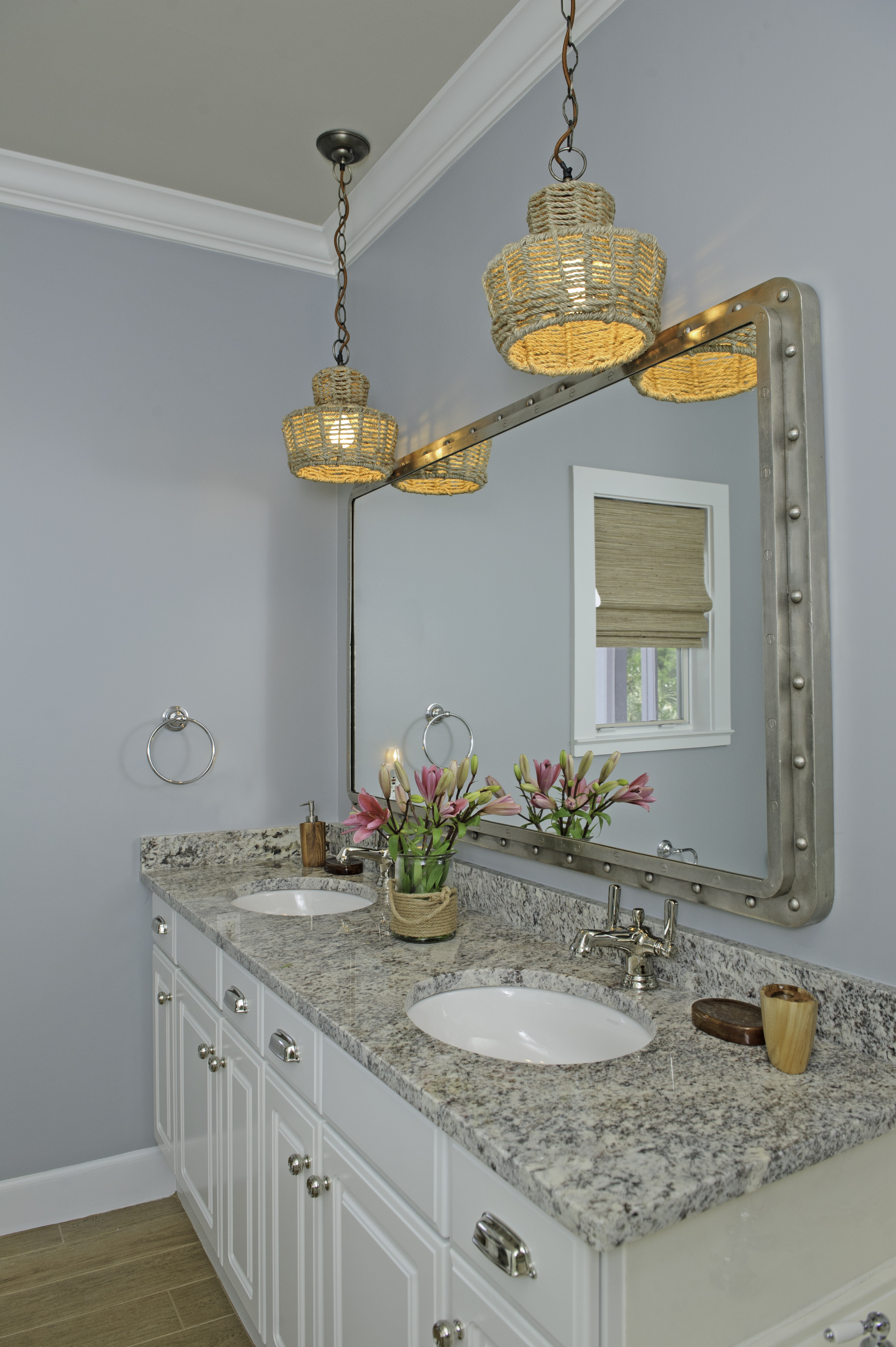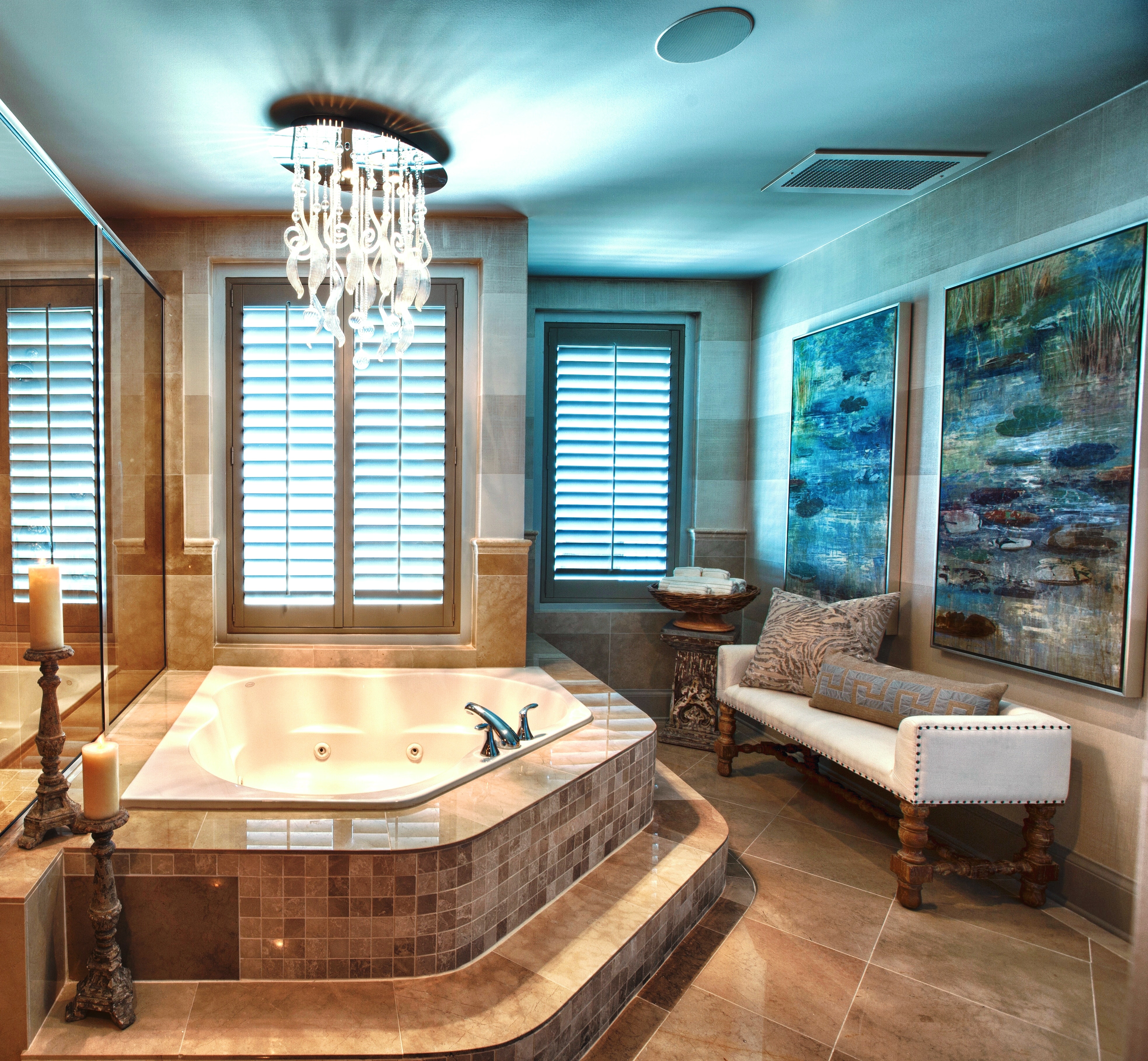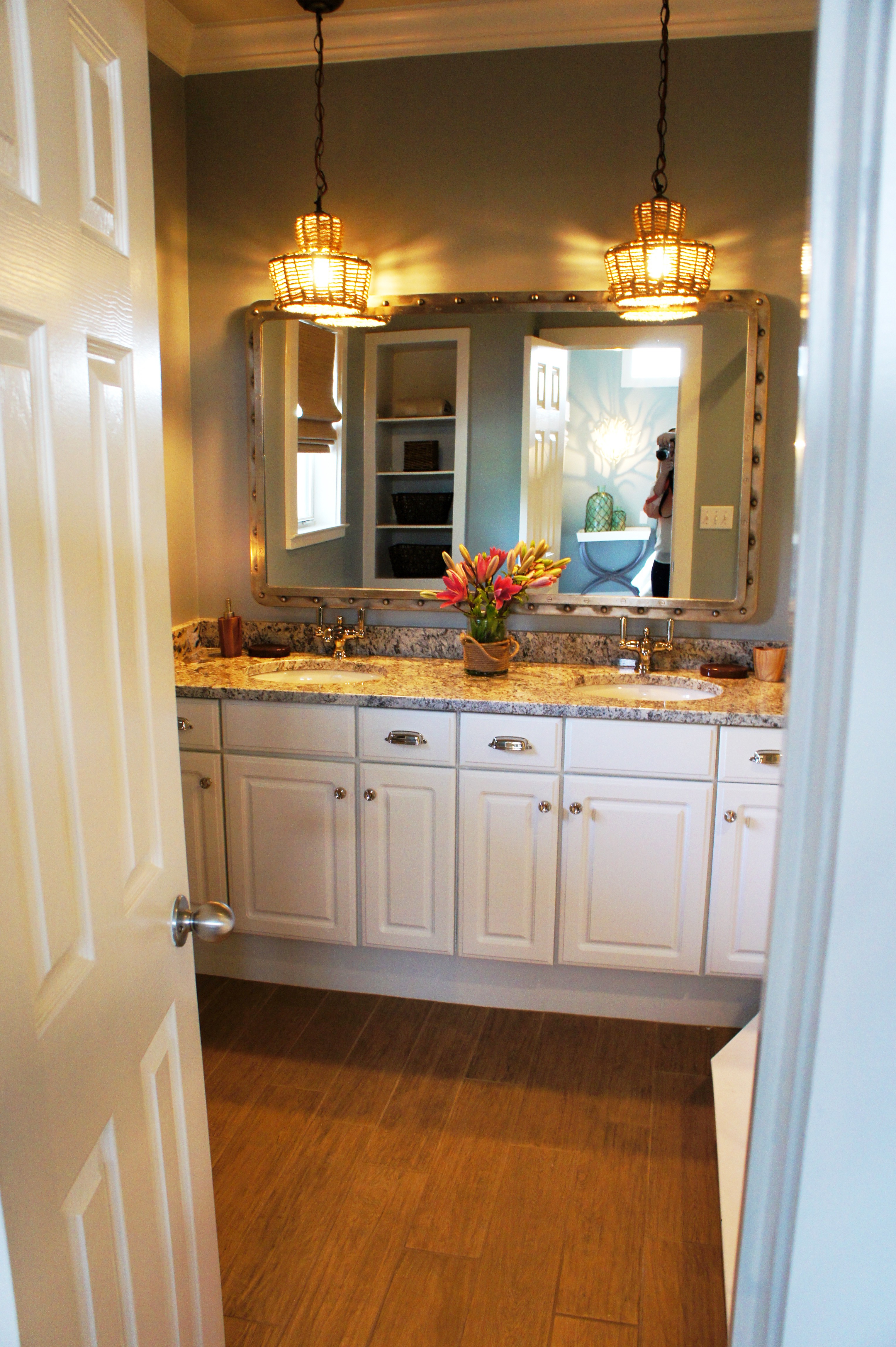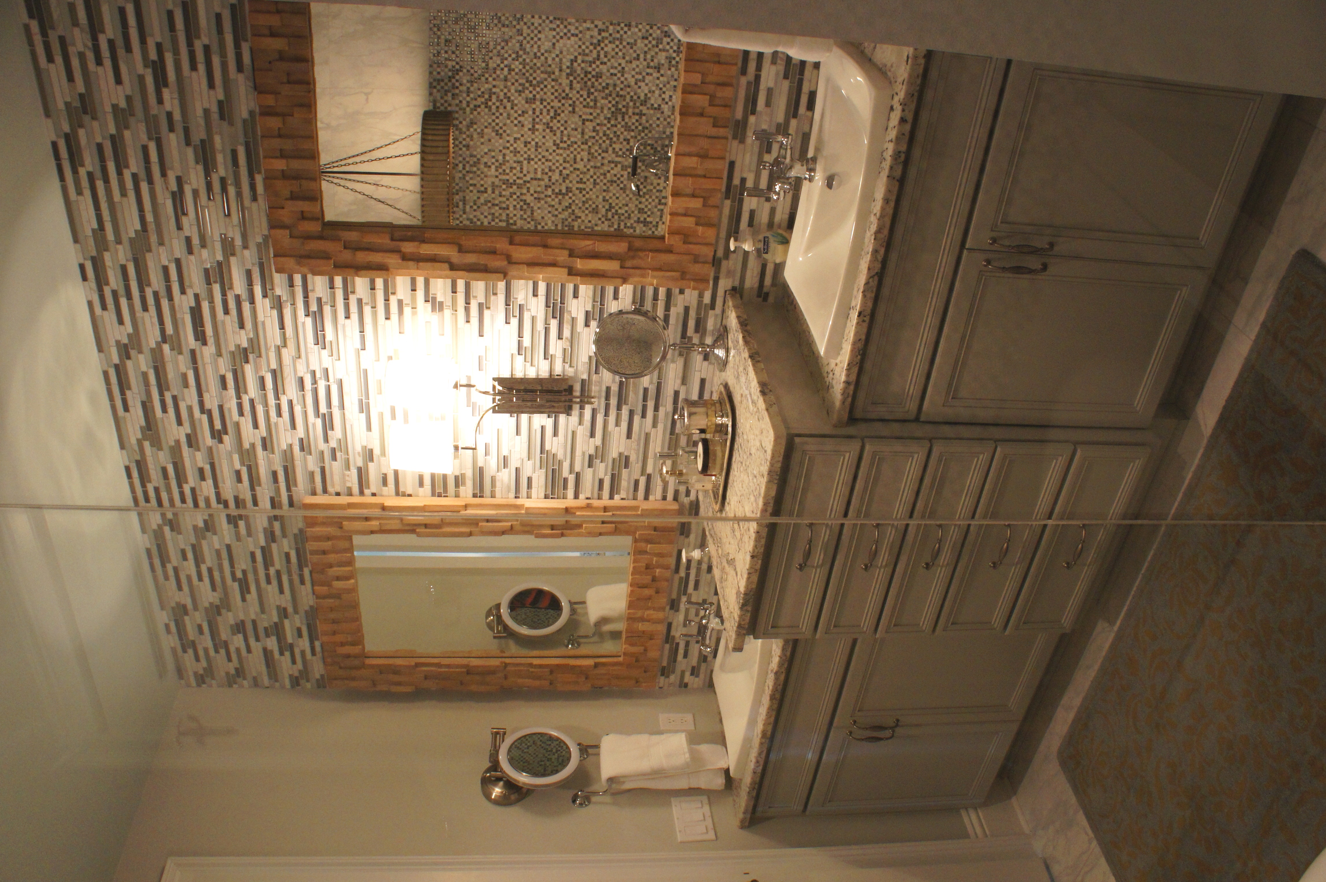 Here is the Master Bathroom. As you can see, I am a huge fan of “mirrors on mirrors”. In another example of layering, we dressed this bathroom up by adding one unique and beautiful LaBarge mirror over the vanity, mounted in front of the existing wall-to-wall mirrors. It is flanked by two Arteriors buffet lamps.