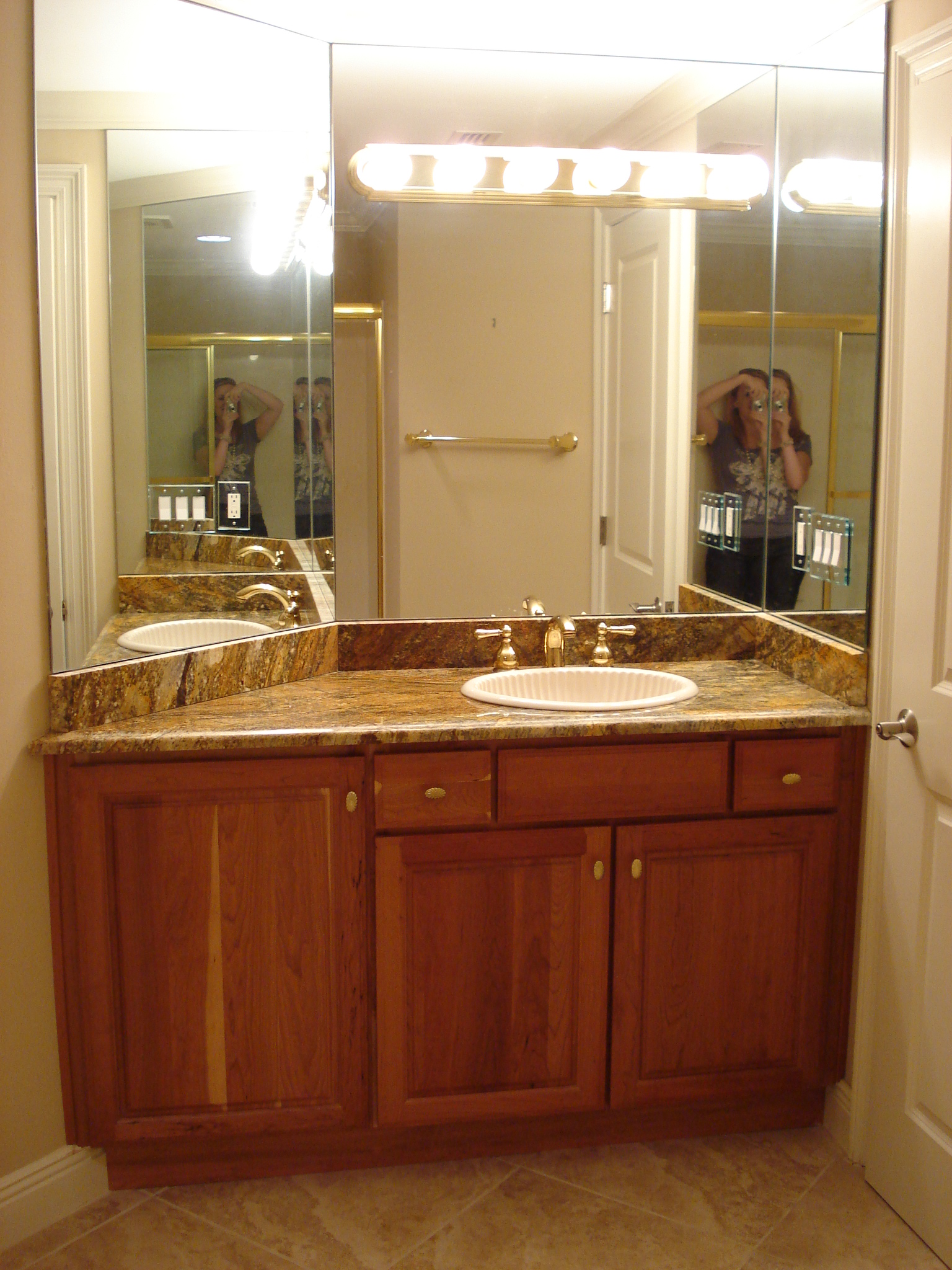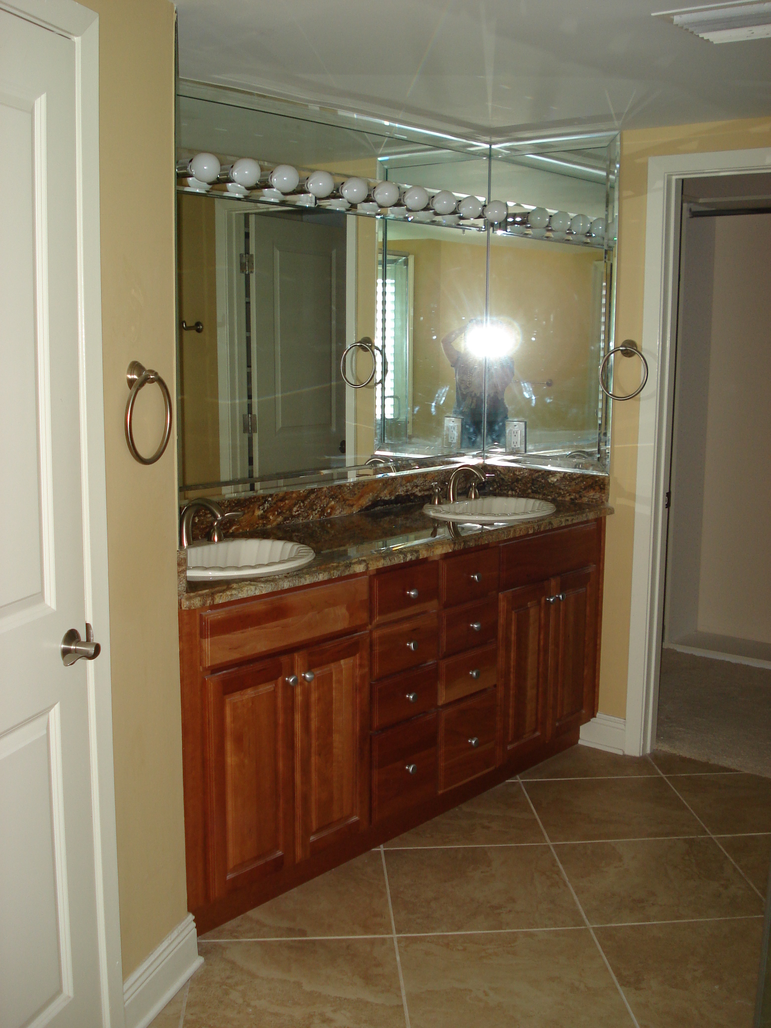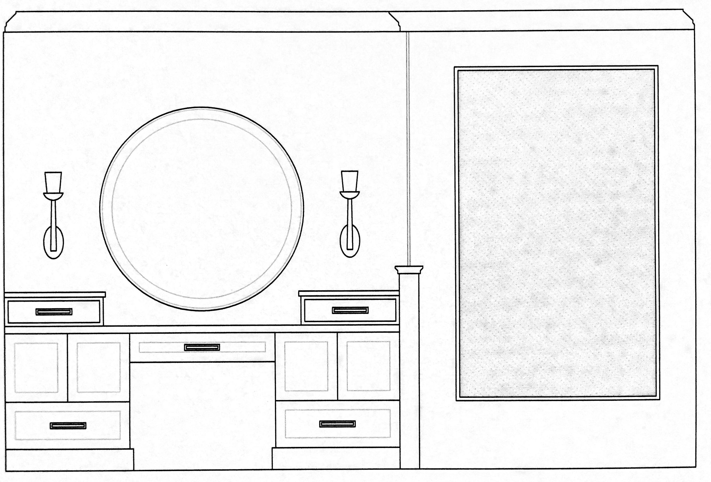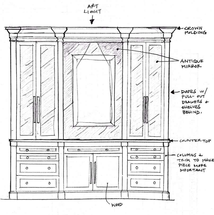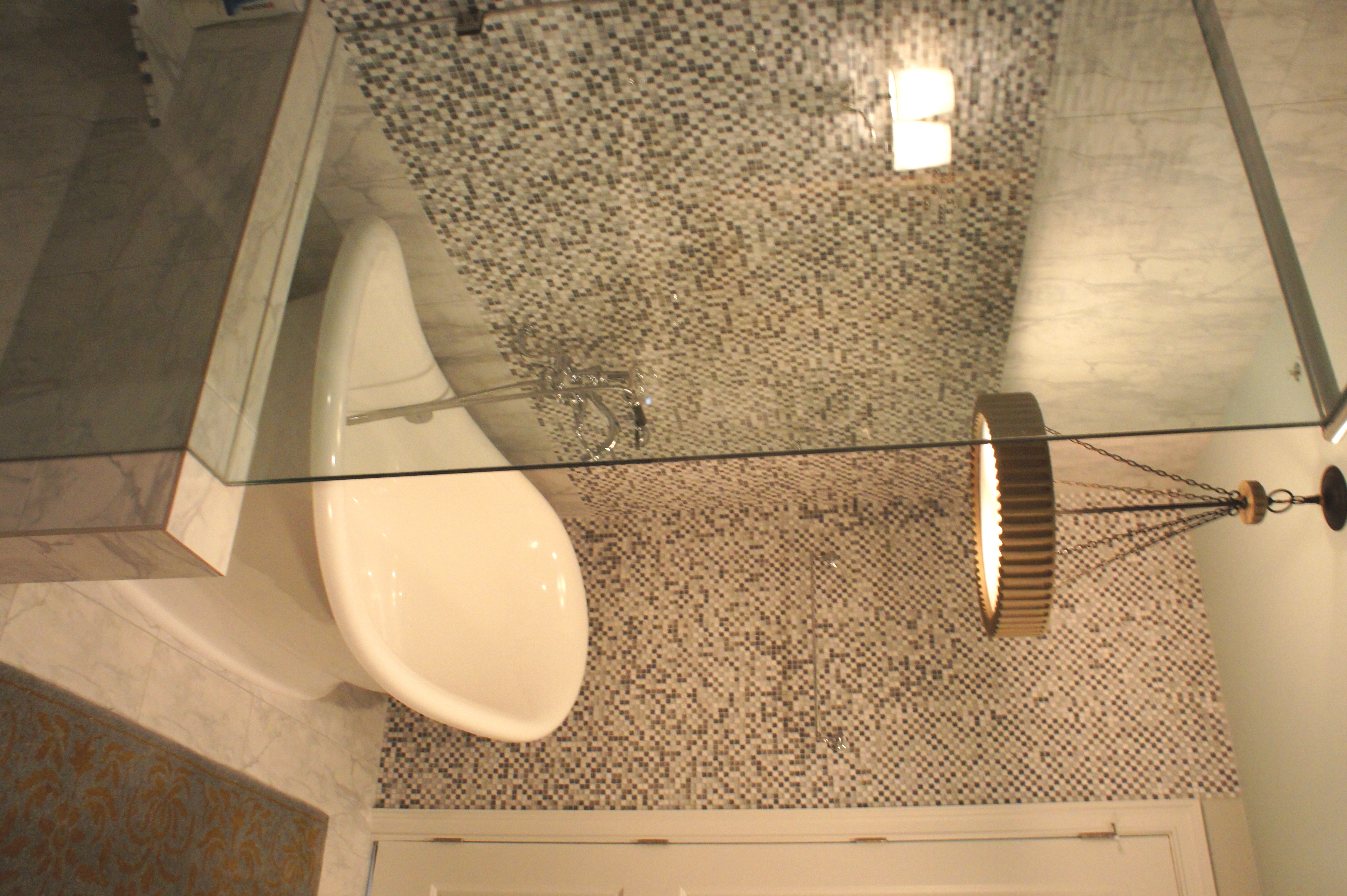 Here is the Master Bathroom. As you can see, I am a huge fan of “mirrors on mirrors”. In another example of layering, we dressed this bathroom up by adding one unique and beautiful LaBarge mirror over the vanity, mounted in front of the existing wall-to-wall mirrors. It is flanked by two Arteriors buffet lamps.