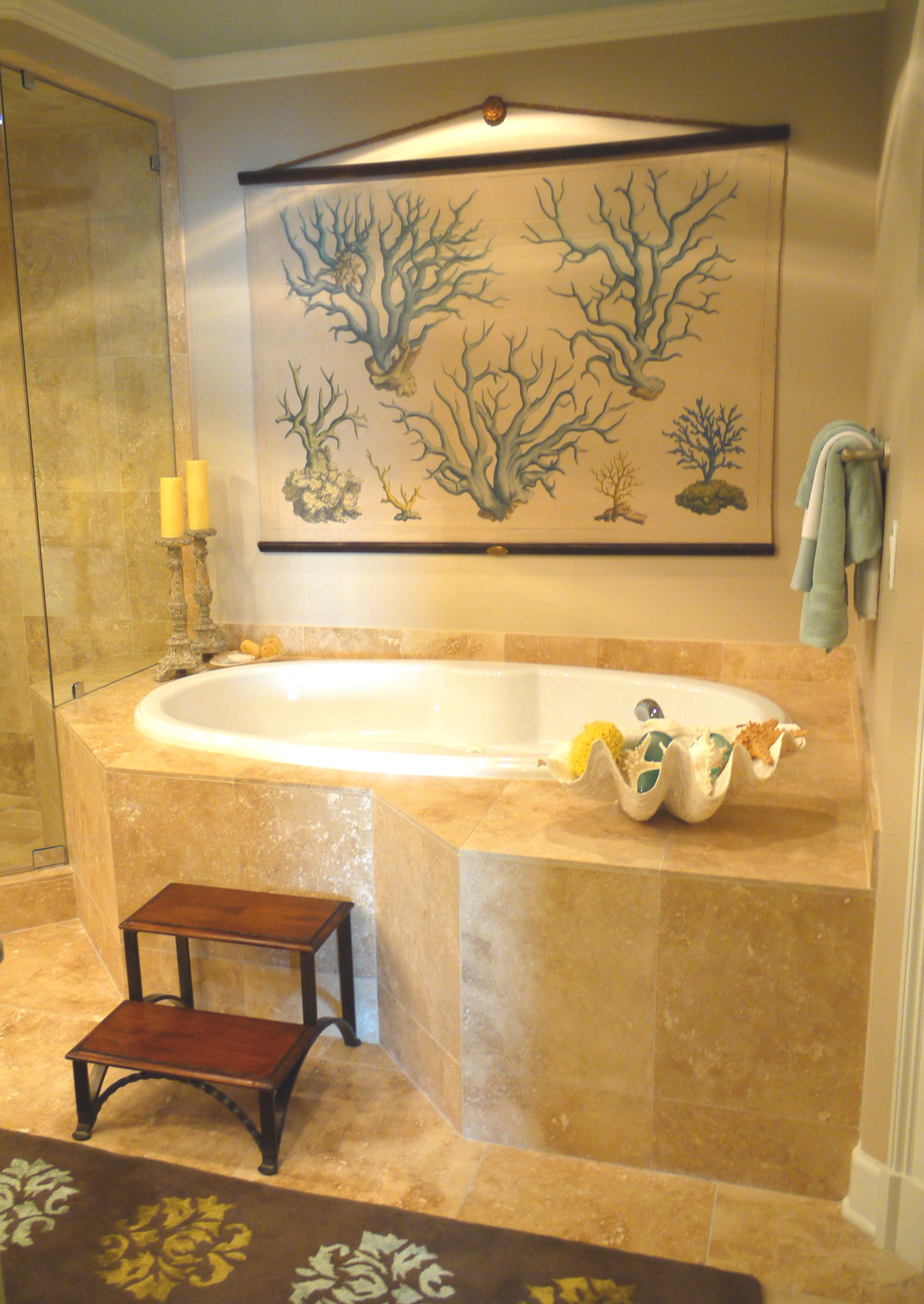 Over the tub is this large Design Legacy coral tapestry. The Drexel Heritage bed step works well in helping the client climb in and out of the tub.