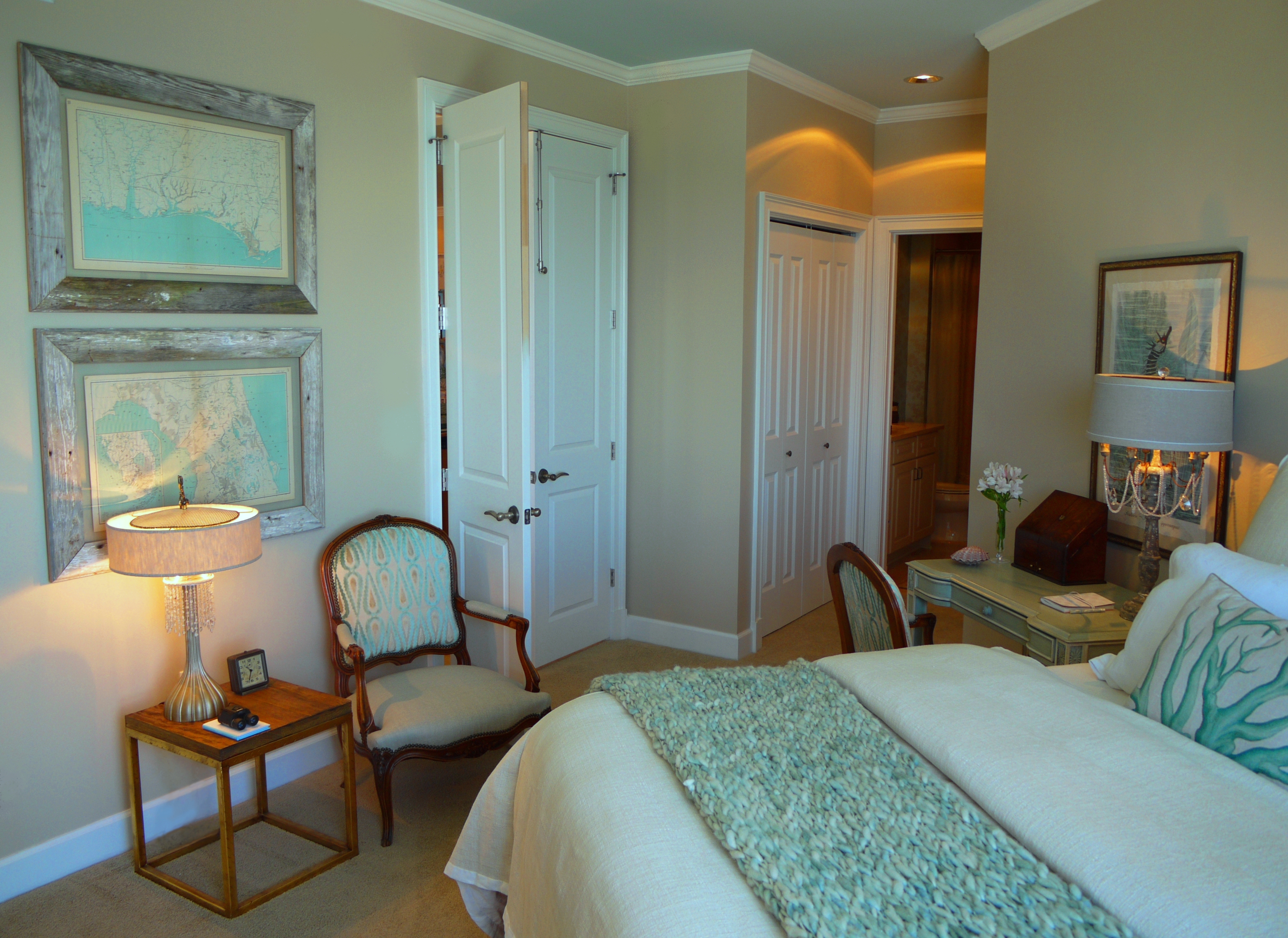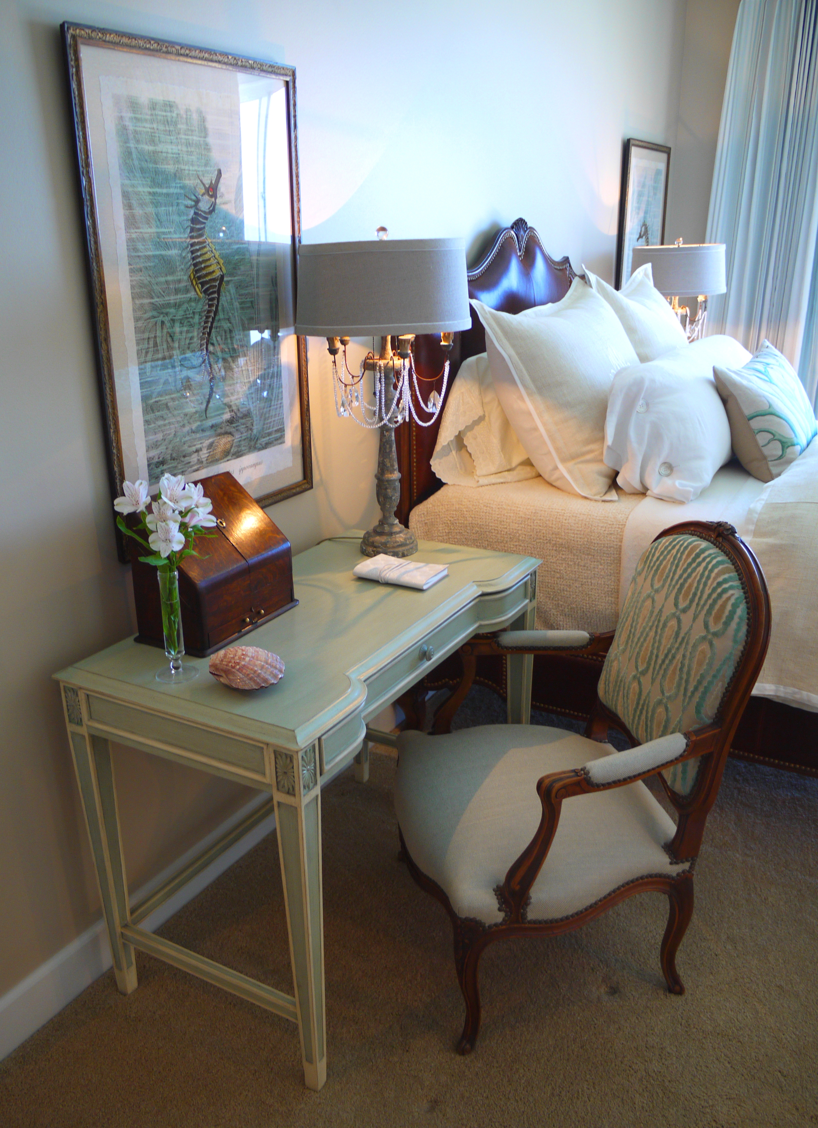 I love using writing desks as nightstands. This one is by Drexel Heritage, and is finished in the perfect green and cream paint colors. Flanking the bed are framed seahorse prints by Vintage Print Gallery. The fauteuils in this room are ones my clients brought from home. I gave them relevance and style by recovering them in this fabulous green Romo linen and geometric velvet print by Kravet.