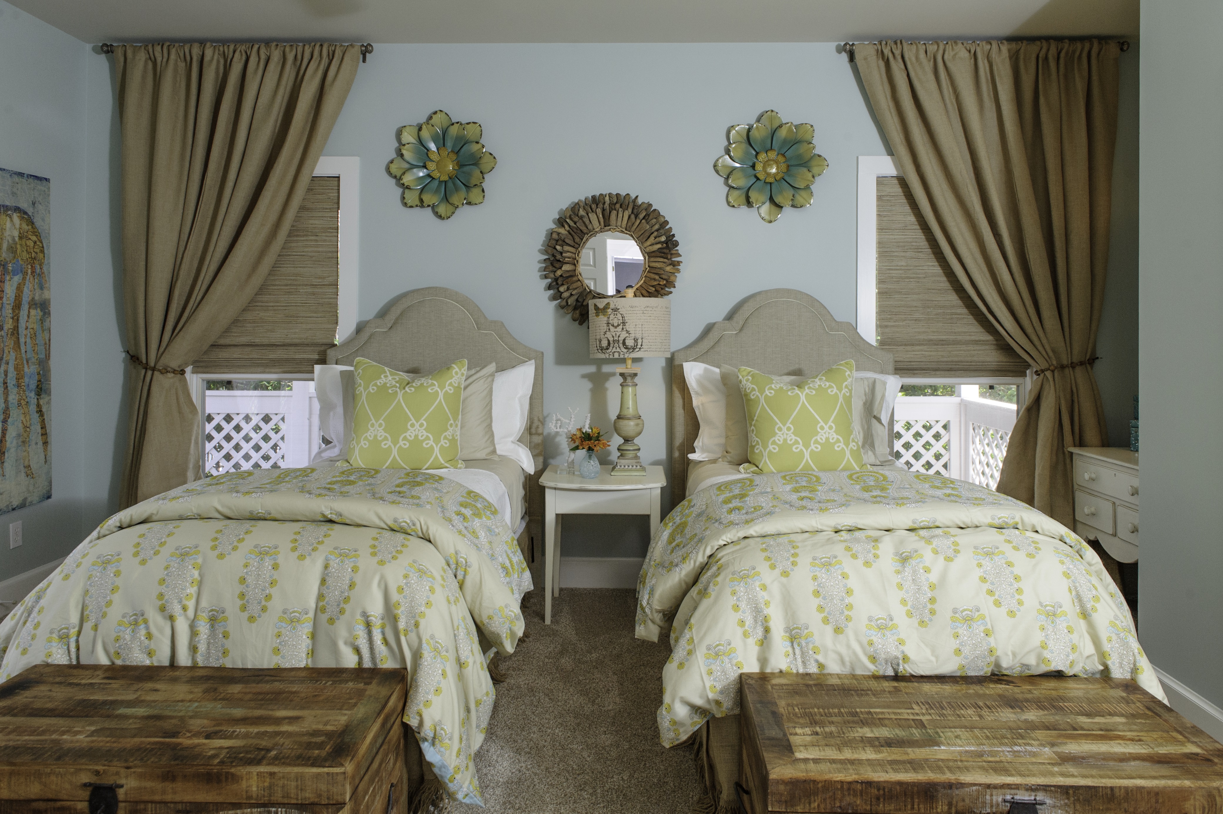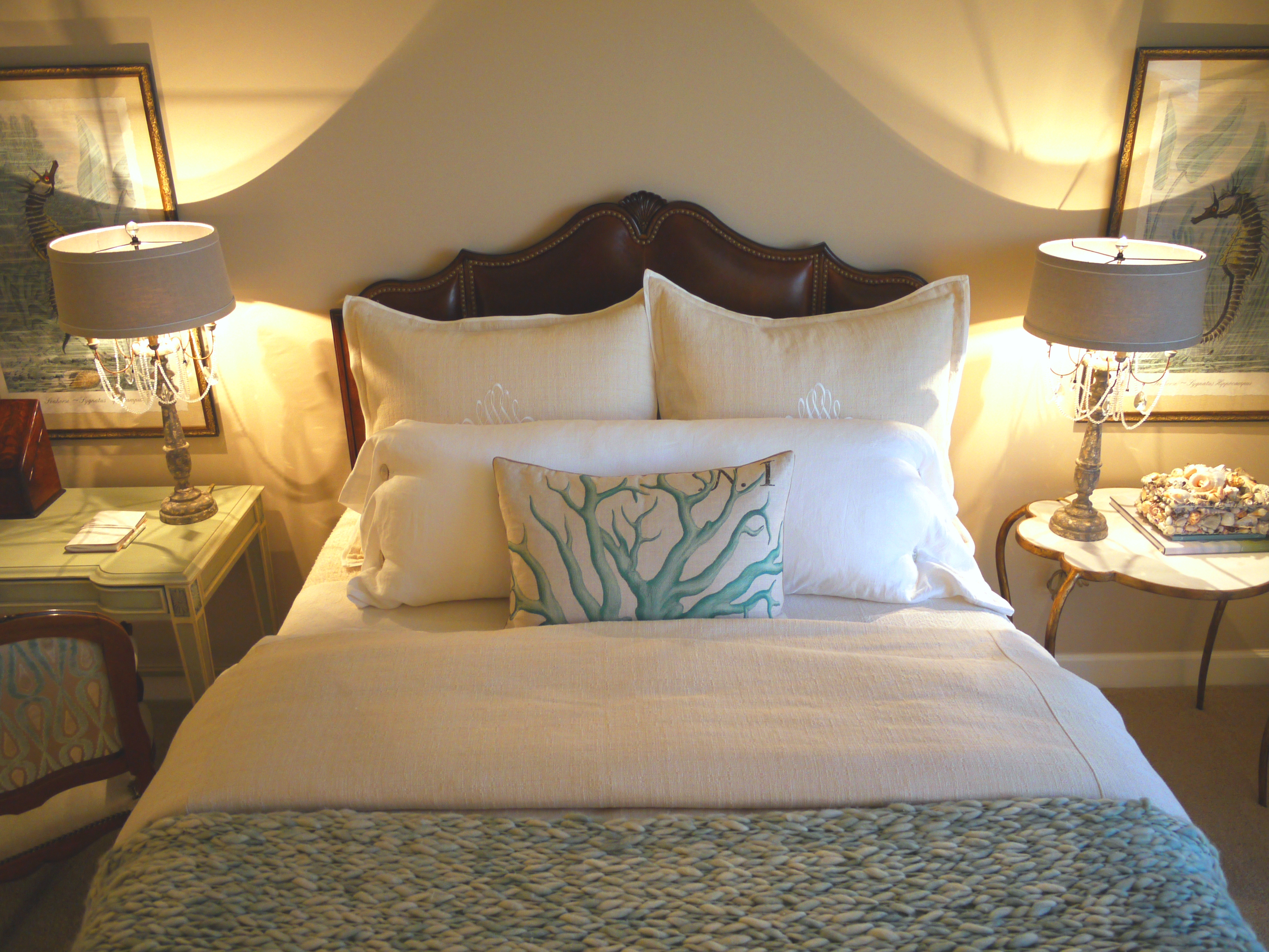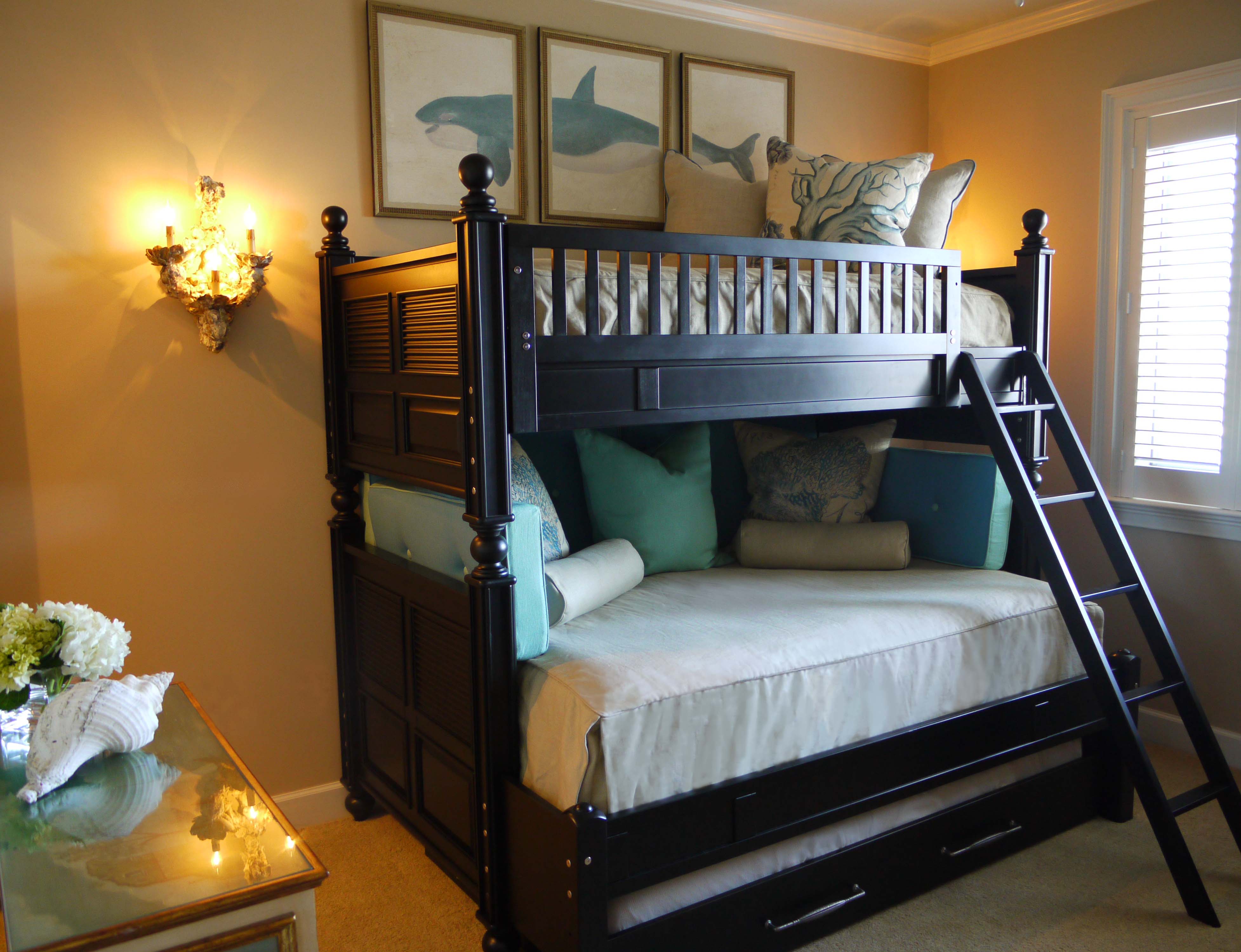 The third and final bedroom was made into a bunk room. The client wanted this room to be fun, but also sophisticated. The whale triptych, coral pillows and custom boxed pillows add a whimsical touch. The tailored linen capsets, oyster shell sconces, painted venetian chest and capiz shell mirror provide the balance of sophistication.