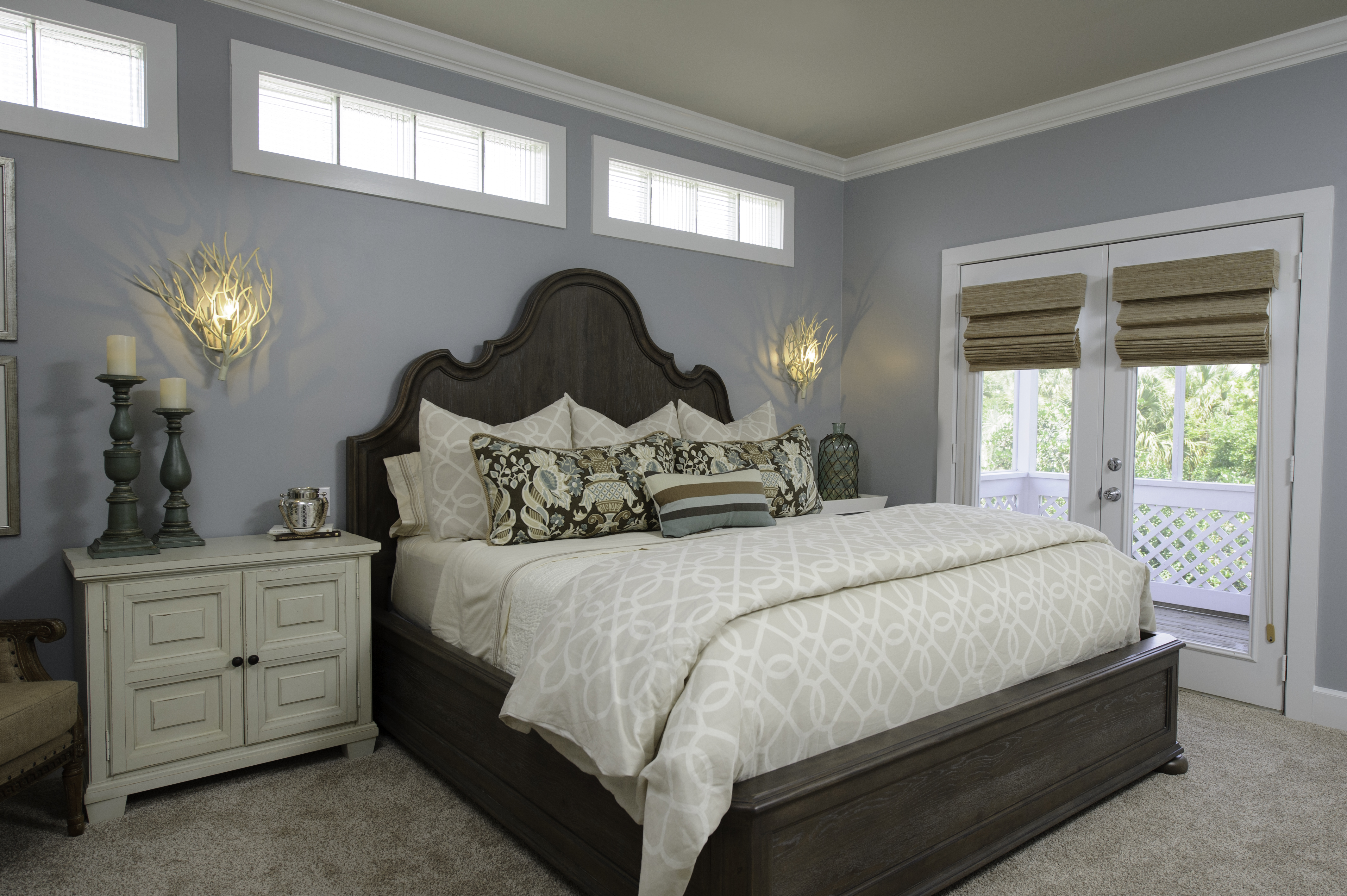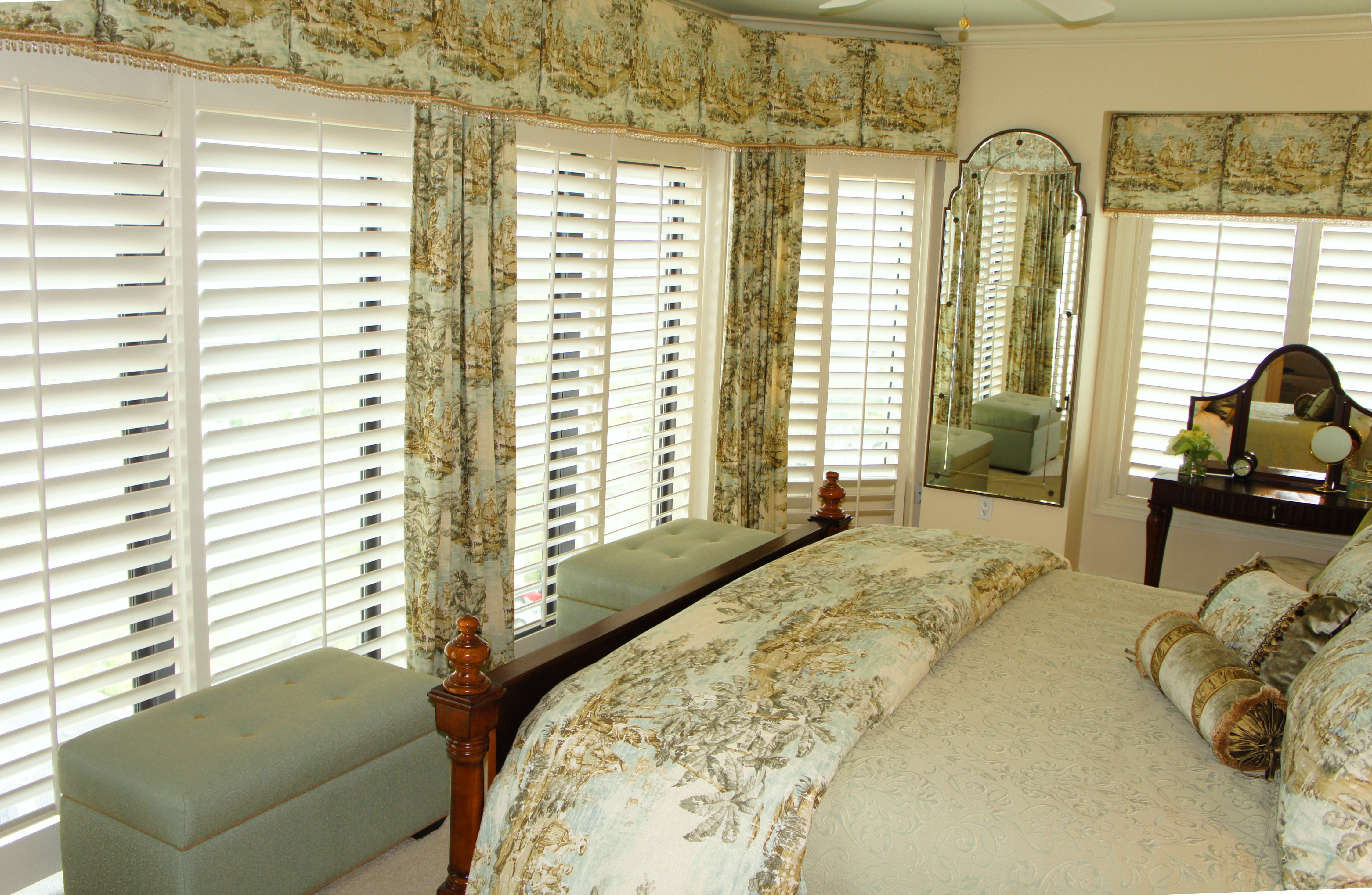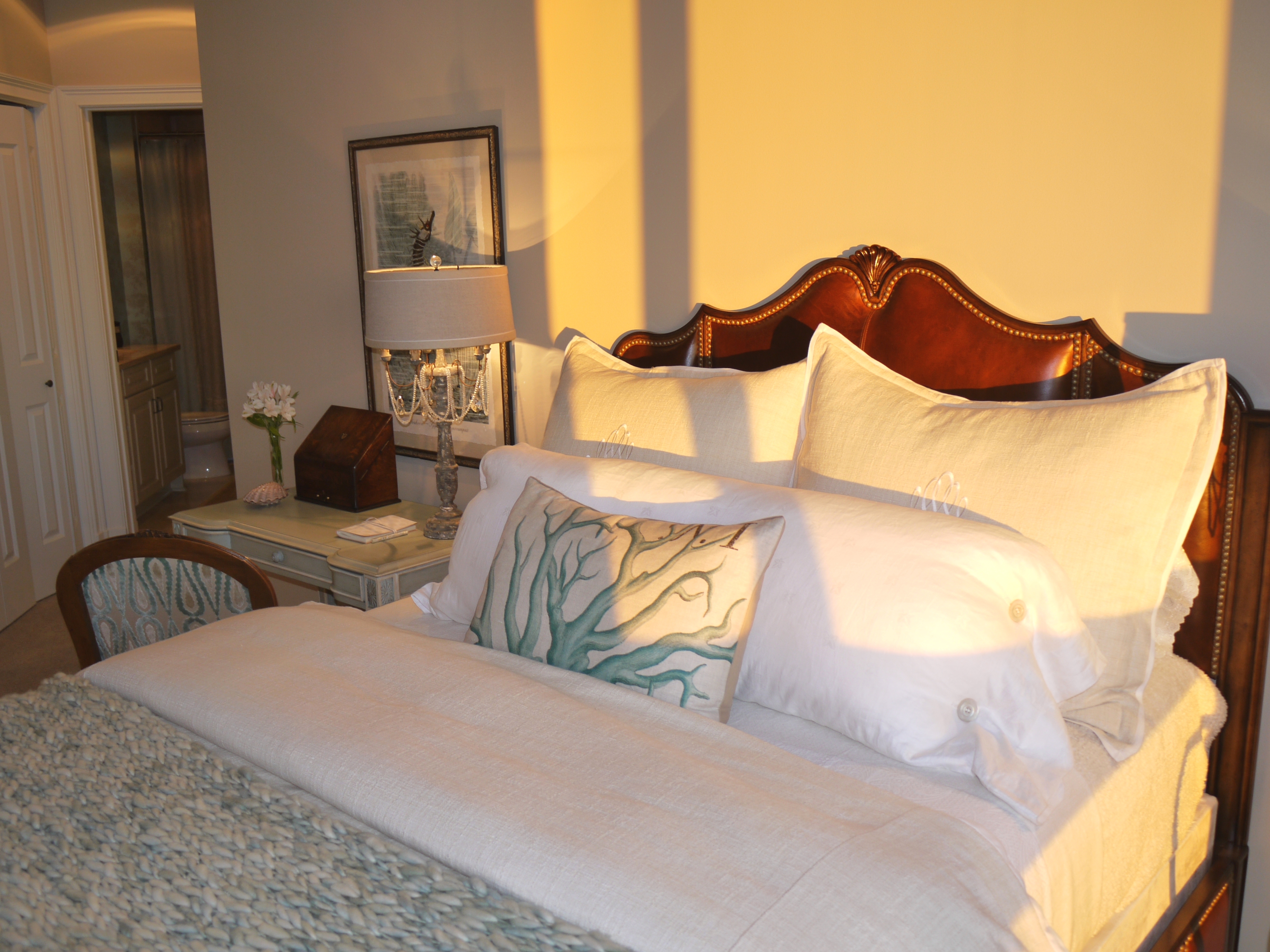 Chalk painted nightstands help to lighten and balance the dark, carved wood king bed. Crisp cream drapes brighten the dark shutters, and light, crisp, fluffy bedding screams “get in!”. The large mirror helps to reflect light back into the room, but is also a jewelry cabinet! A girl’s dream!