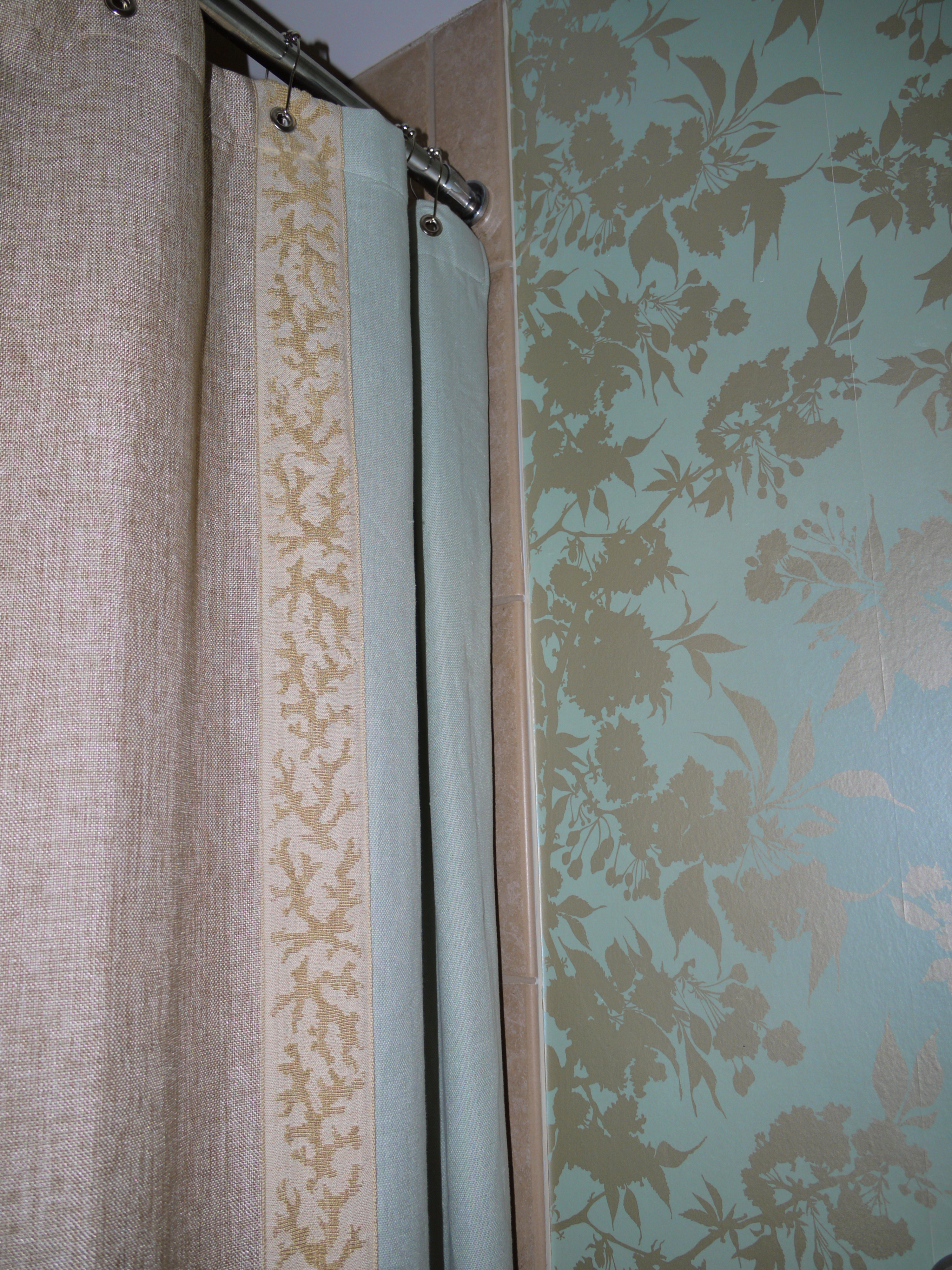 I designed this shower curtain to be simple, so as not to take away from the wallcovering. The applied coral band picks up on the gold hues of the wallpaper, and adds just the right coastal touch.