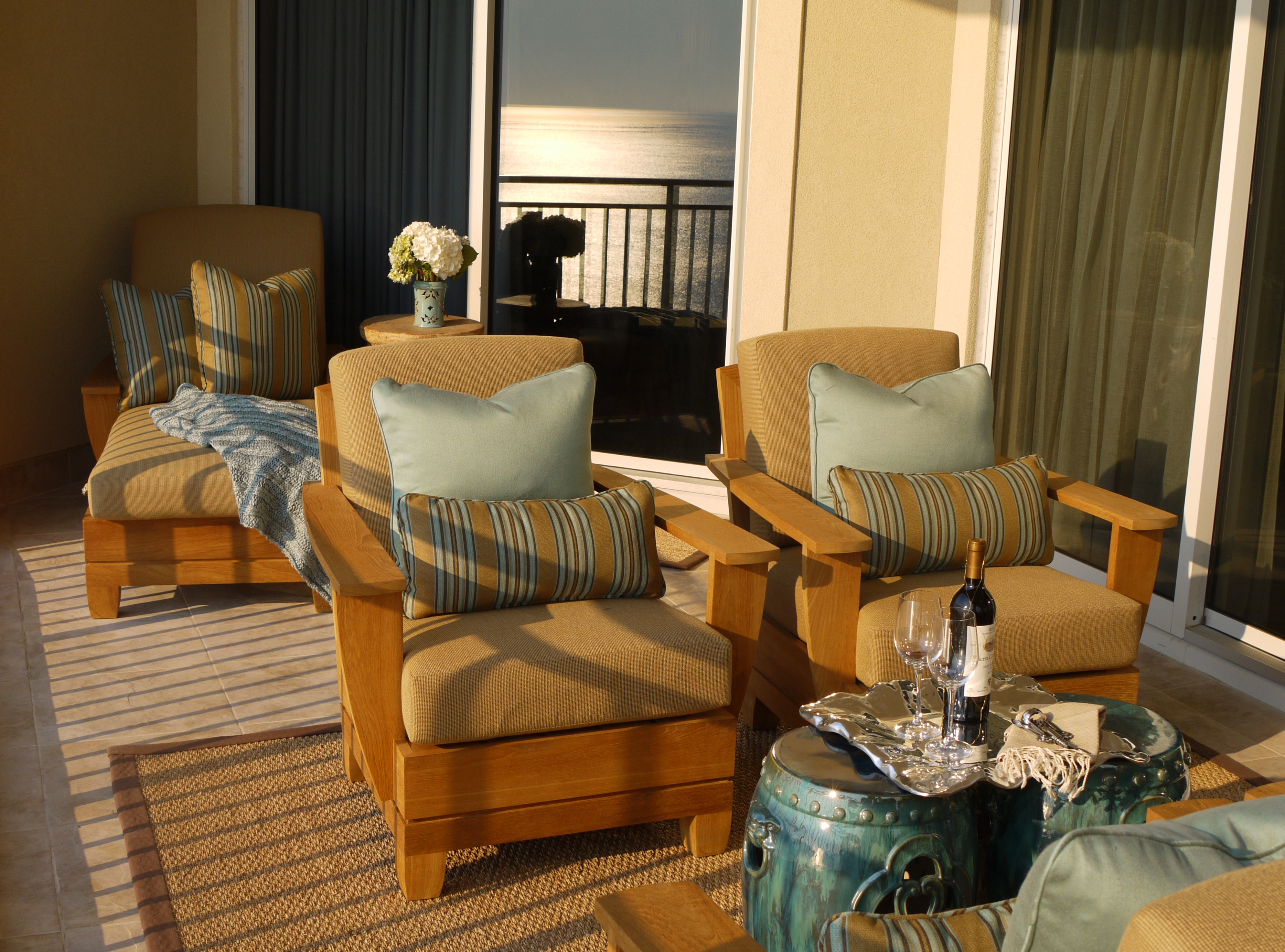 Warm teak club chairs and chaise lounge by Brown Jordan provide a relaxing place to sit and enjoy the sun. Color was added with Sunbrella pillows and these beautiful garden stools. The side table above, by the chaise lounge, is actually made of ceramic, but designed to look like driftwood! Garden Stools and side table are by Emissary.