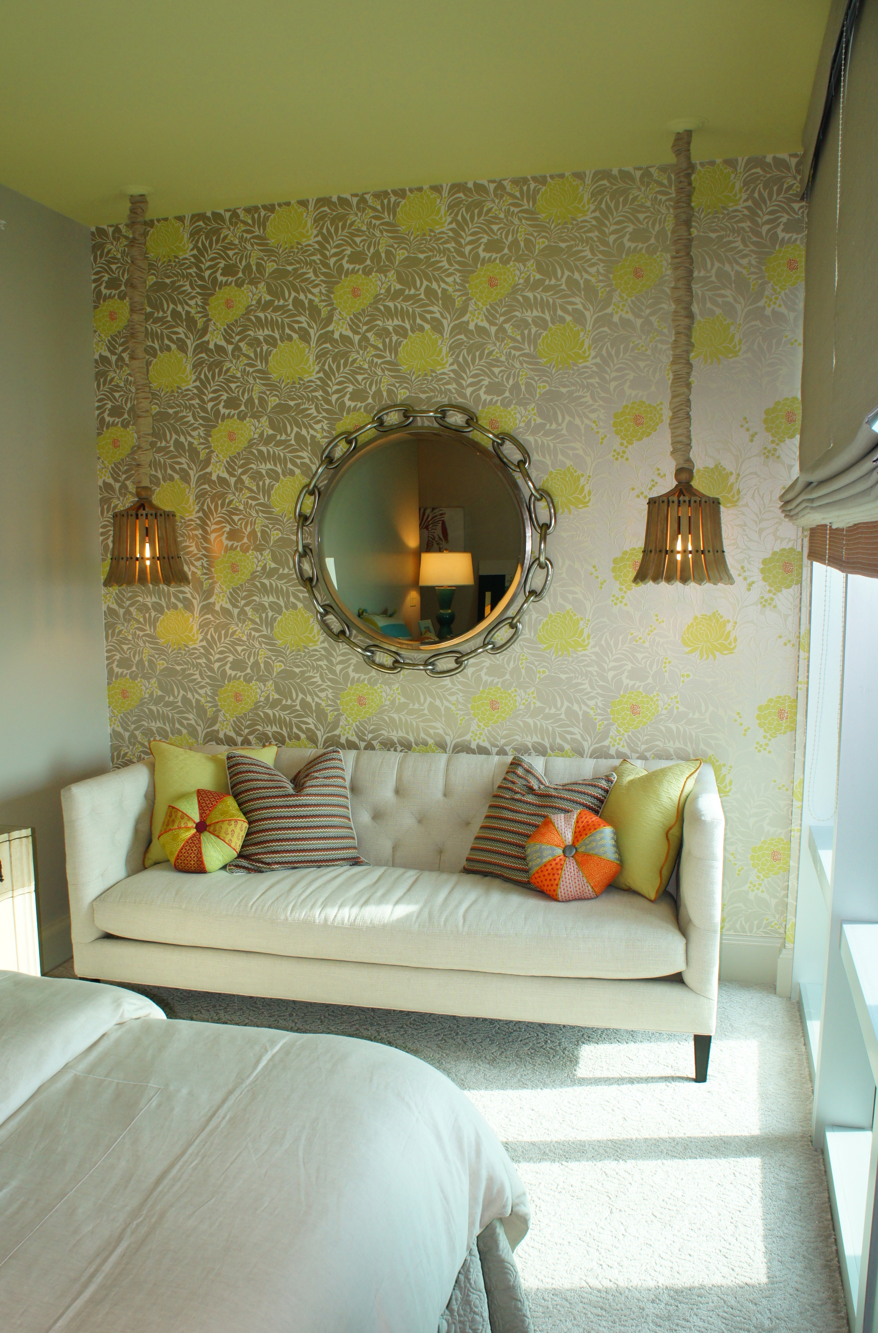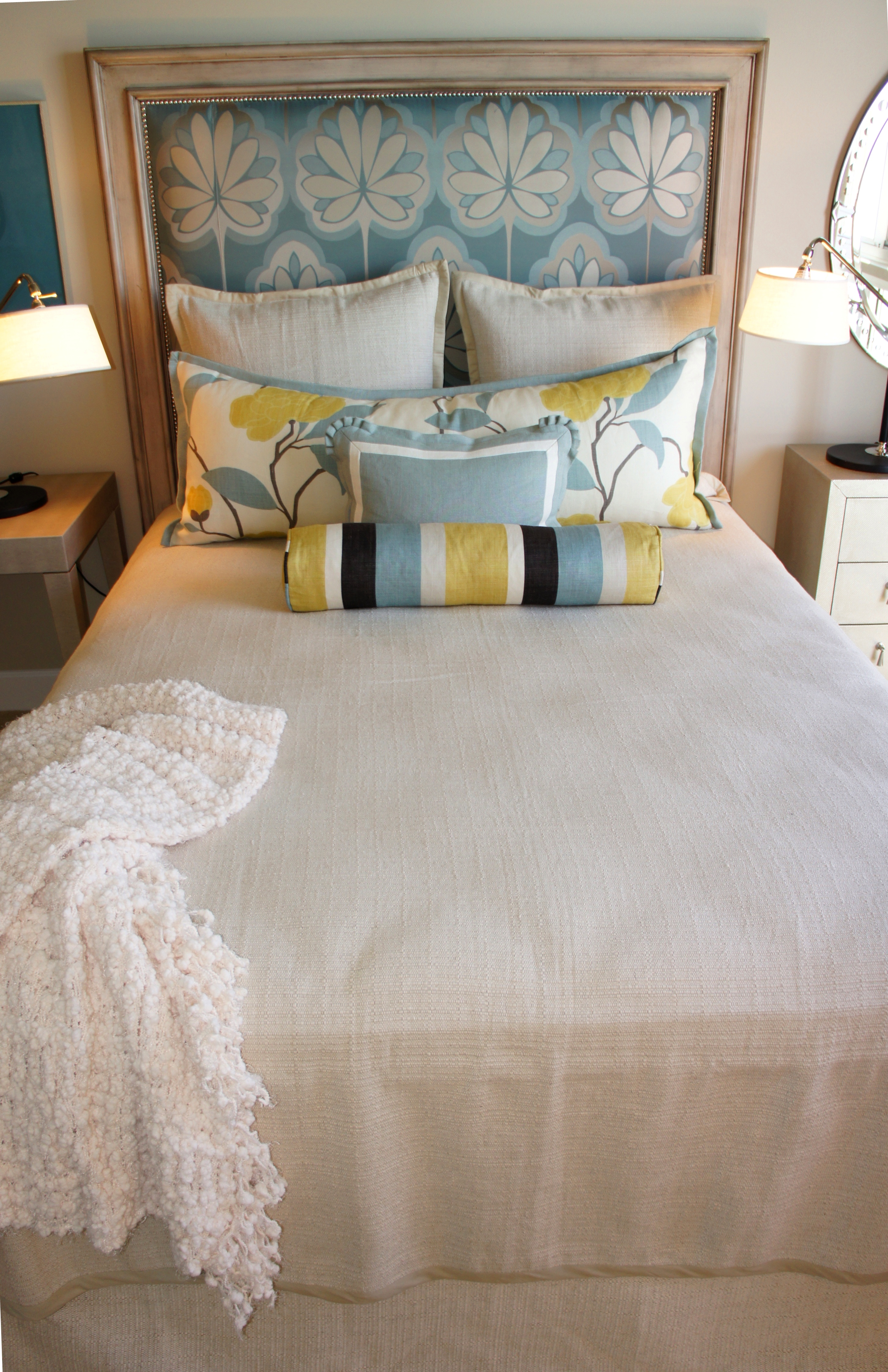 This Master Bedroom turned out to be my favorite room of the whole design. Because condominium walls tend to be large, empty, wide expanses of windowless walls, I needed a way to break up the planes, and dress it in the correct proportions. I started by having some small vertical moldings installed on each side of the bed, and then ran some yellow grasscloth inside those molding pieces for vertical panels. These were made more important by the unique hanging droplet sconces. This gave the master bed and bed wall more importance in the room, and addressed the problem of a large, boring empty wall. It also emphasised the height of the room.