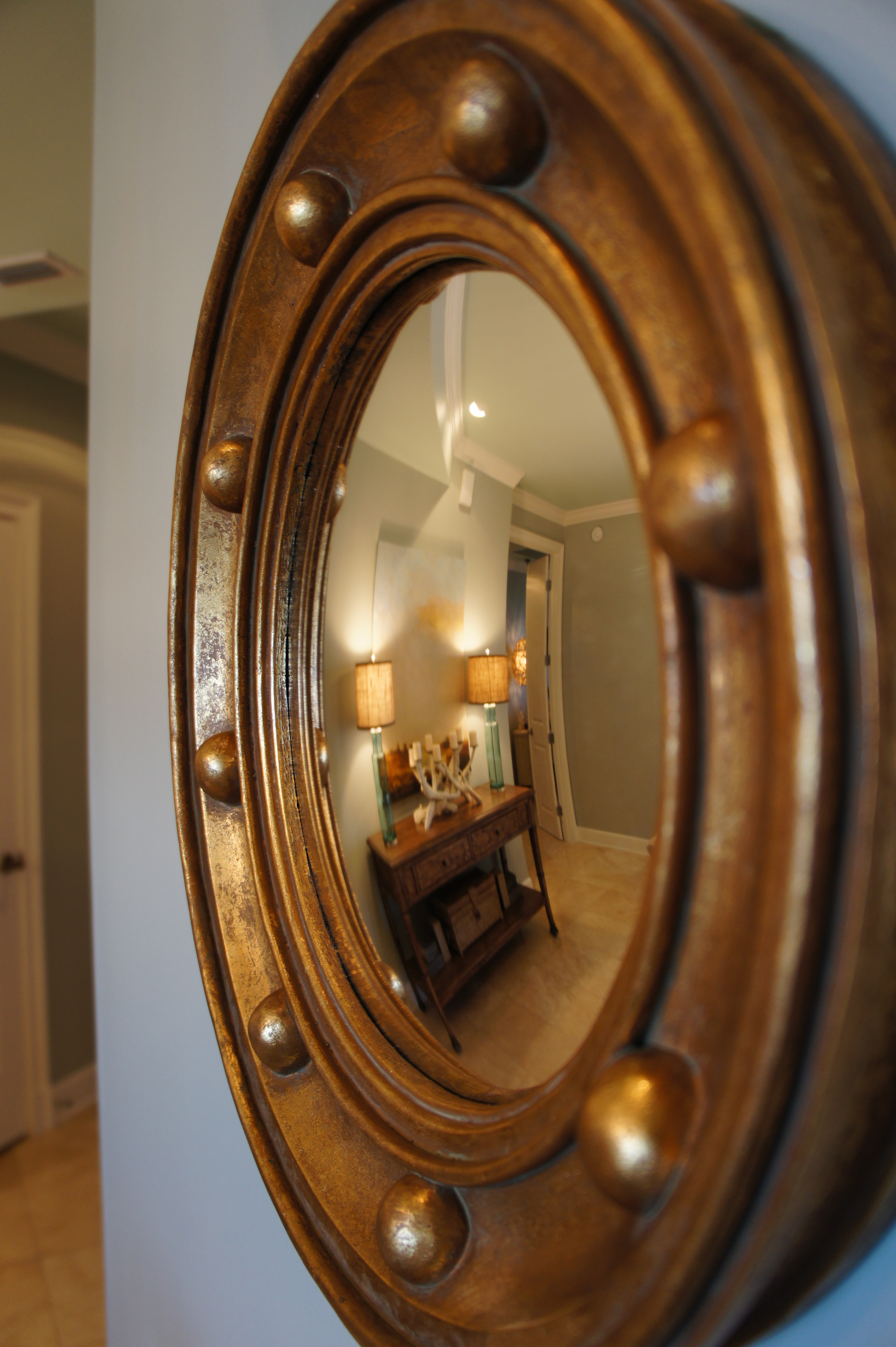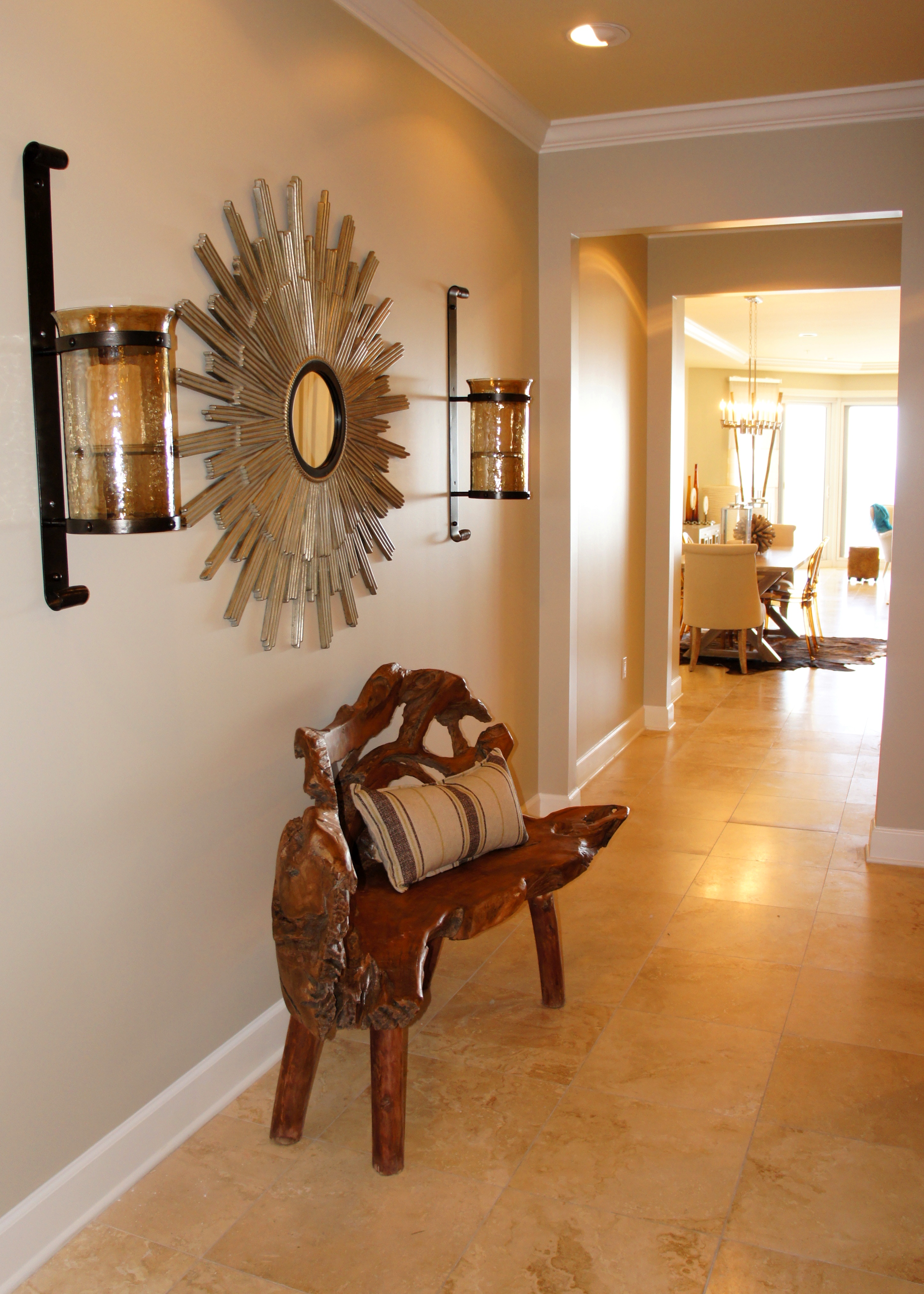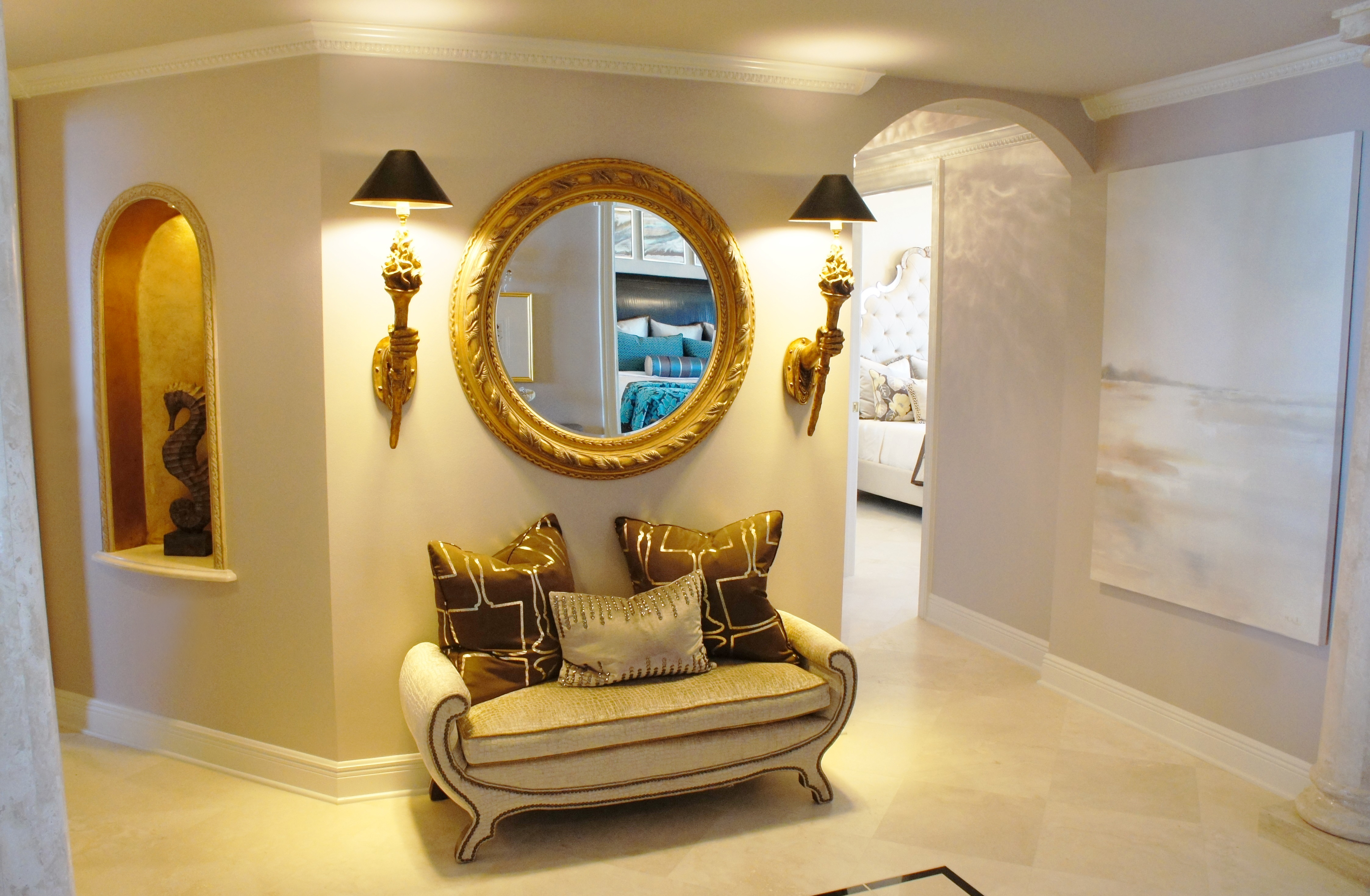 In the Entry, we combined mica wall covering, gold, marble, antique mirror and neutral art to help balance all the texture.