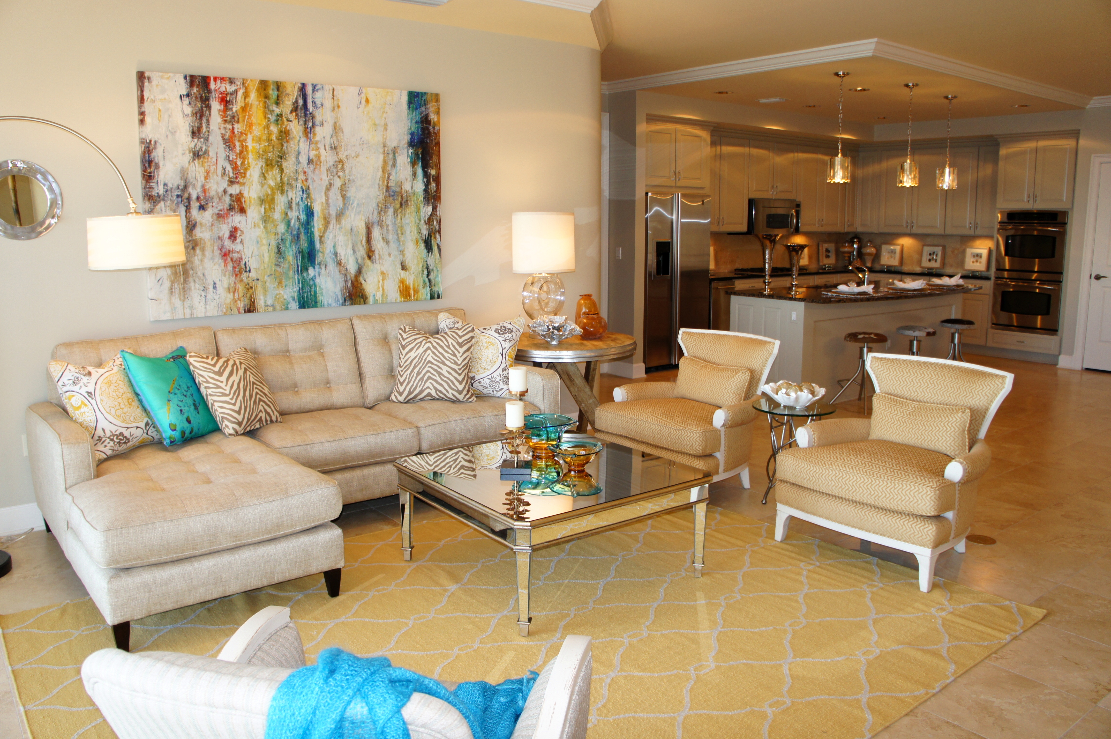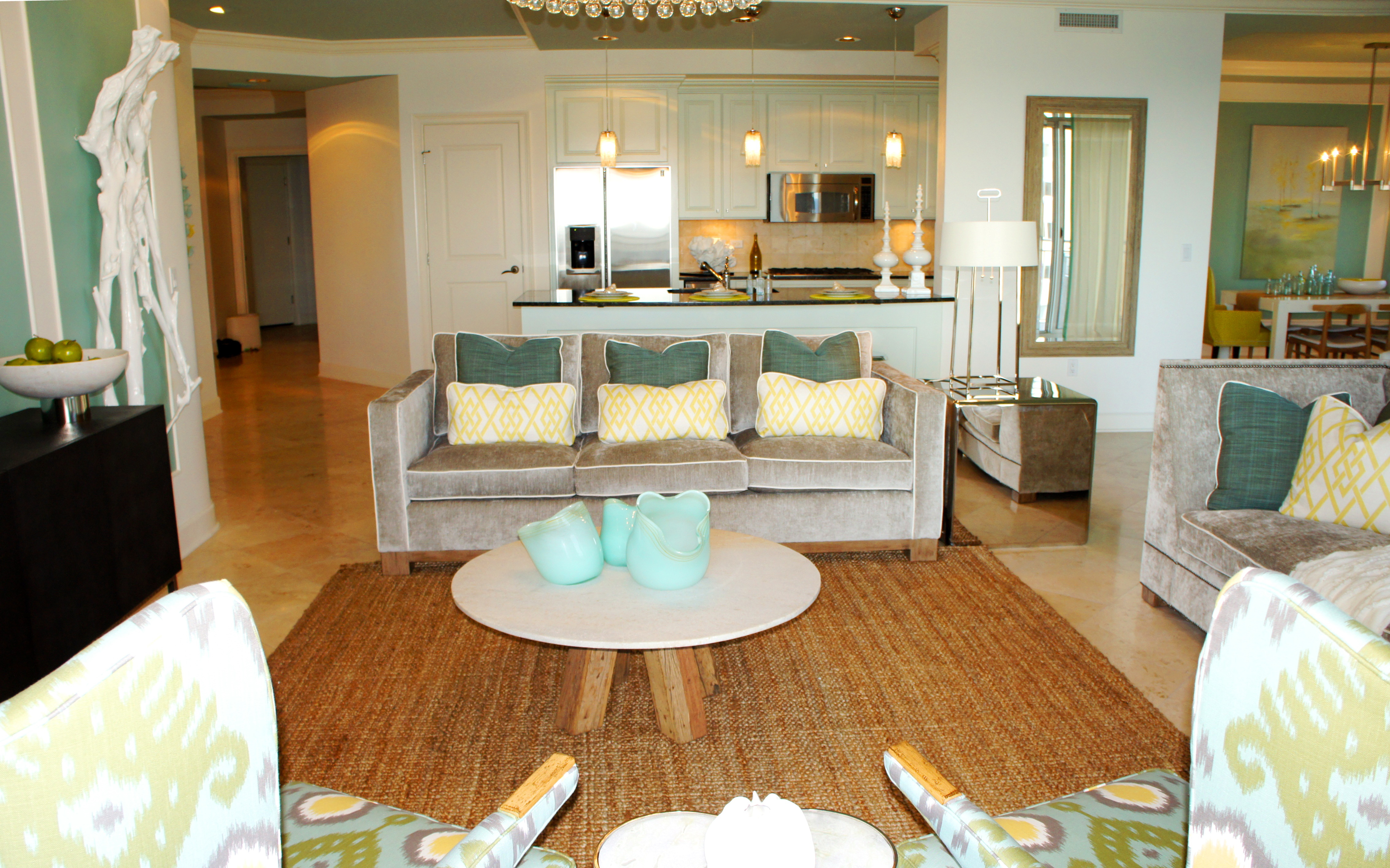 I wanted this unit to have a balance of contemporary elements and natural, rustic elements that make it relevant to the coast. The clean-lined sofa/chaise sectional here in the living area is anchored by a large, yellow, flat woven wool area rug with an off-white geometric design on it. I took pleasure in mixing mirrored surfaces and reflective chrome, with more rustic galvanized finishes, sun-bleached woods and natural linen fabrics. I love being able to mix golds and silvers together in a room, as well.