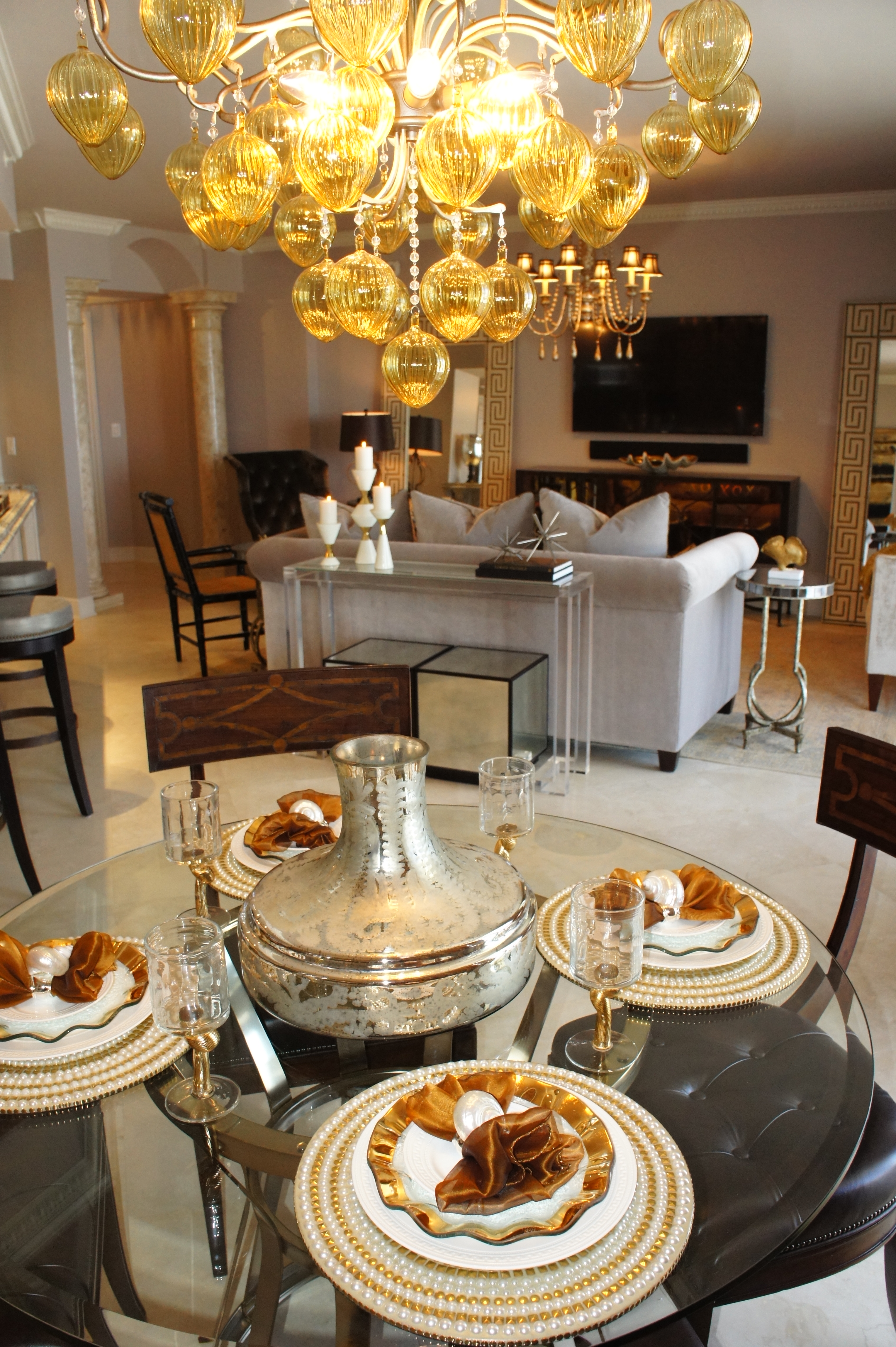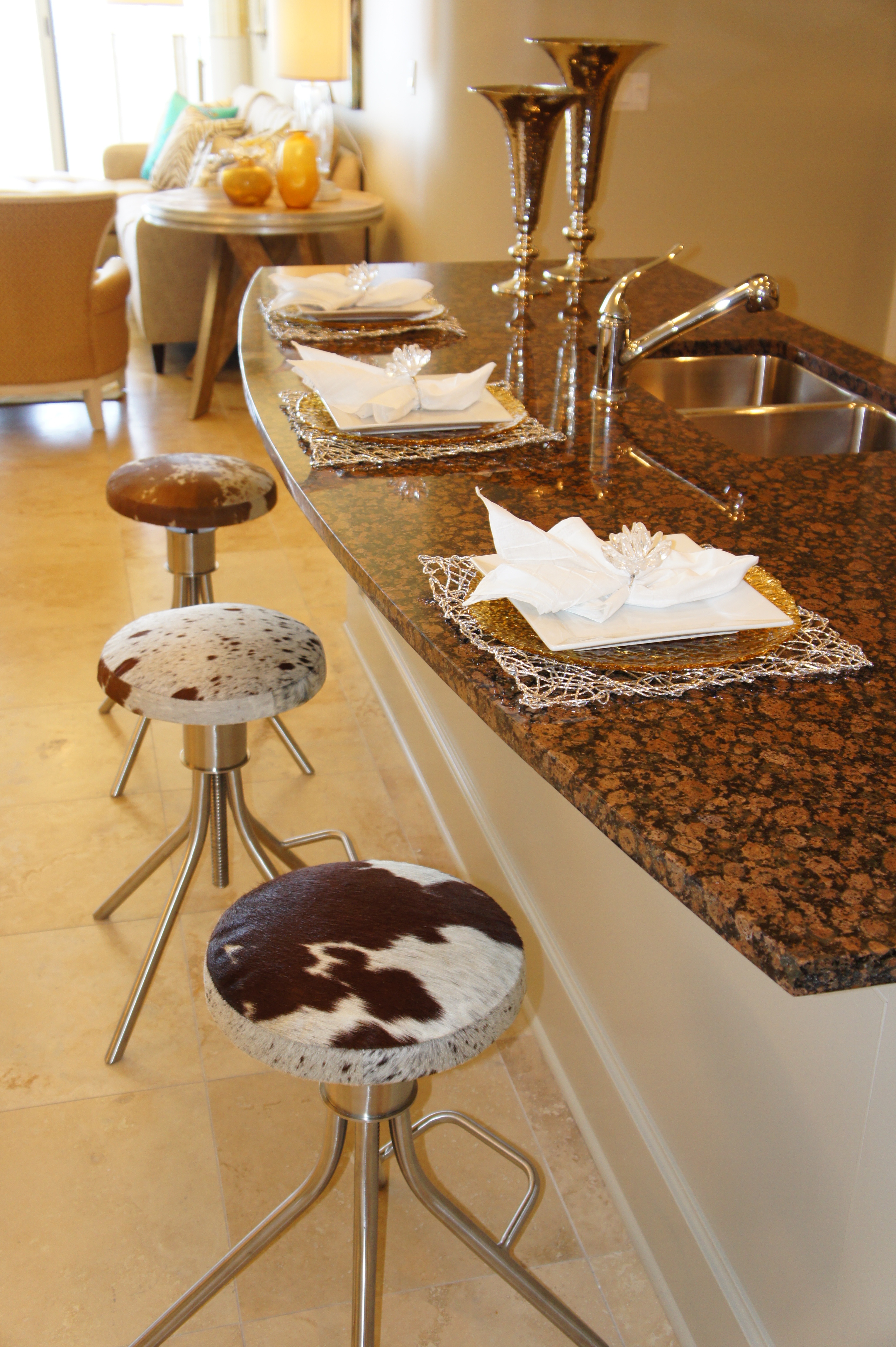 The kitchen bar is dressed up with chrome vases, just waiting for some fresh flowers, and place settings that mix gold, silver and white. The cow hyde counter stools pick up on the colors of the baltic brown granite, and provide a hip, funky touch to the room.
