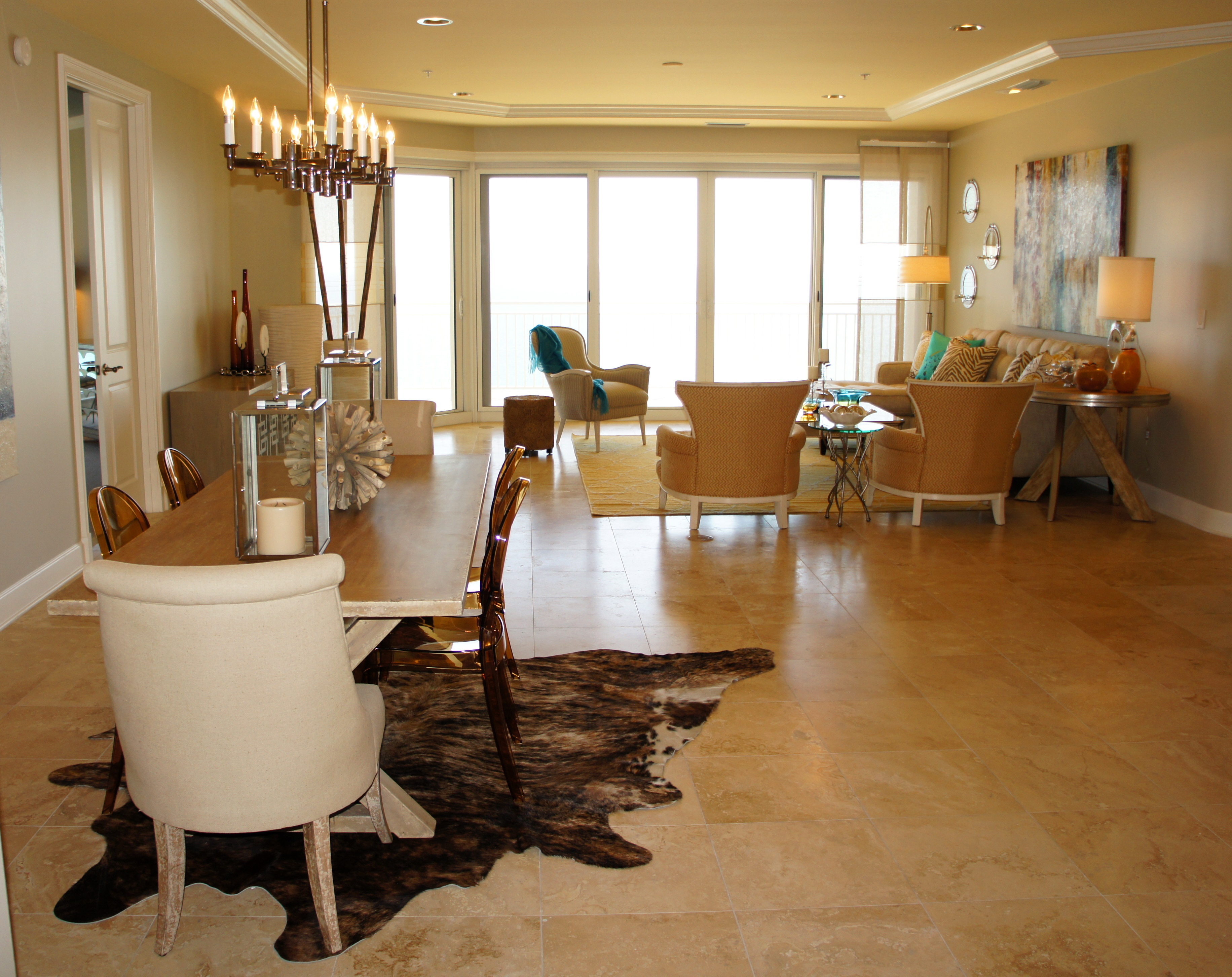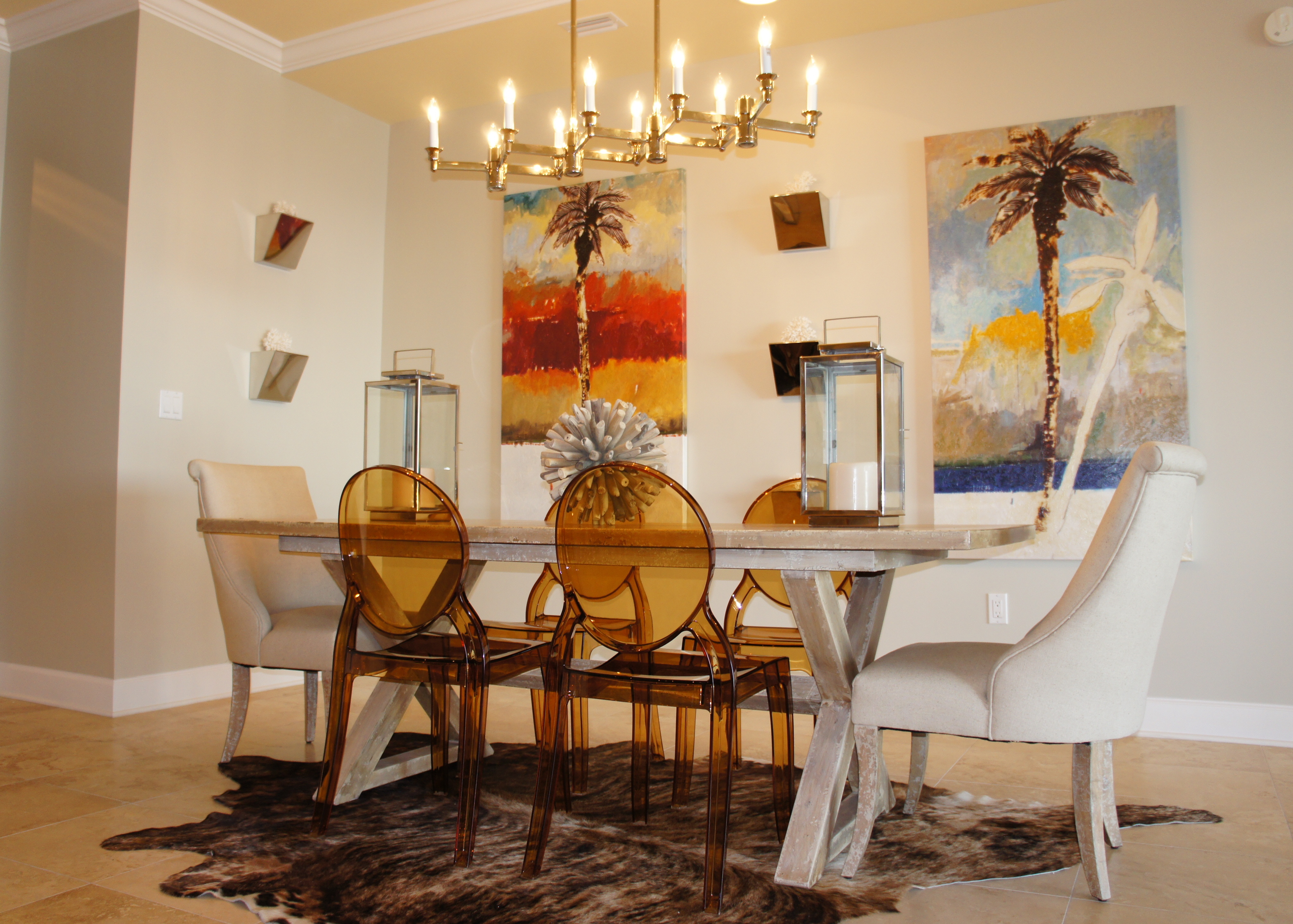 In the dining room, I mixed sun-bleached woods with linen upholstery, cow hyde, and some fabulous amber ghost chairs. The large canvas artwork was perfect in color and style, as it mixed golds and blues, had a coastal subject matter, and was painted in a contemporary fashion. I used these chrome wall brackets to display white corals, and to create a geometric rhythm.