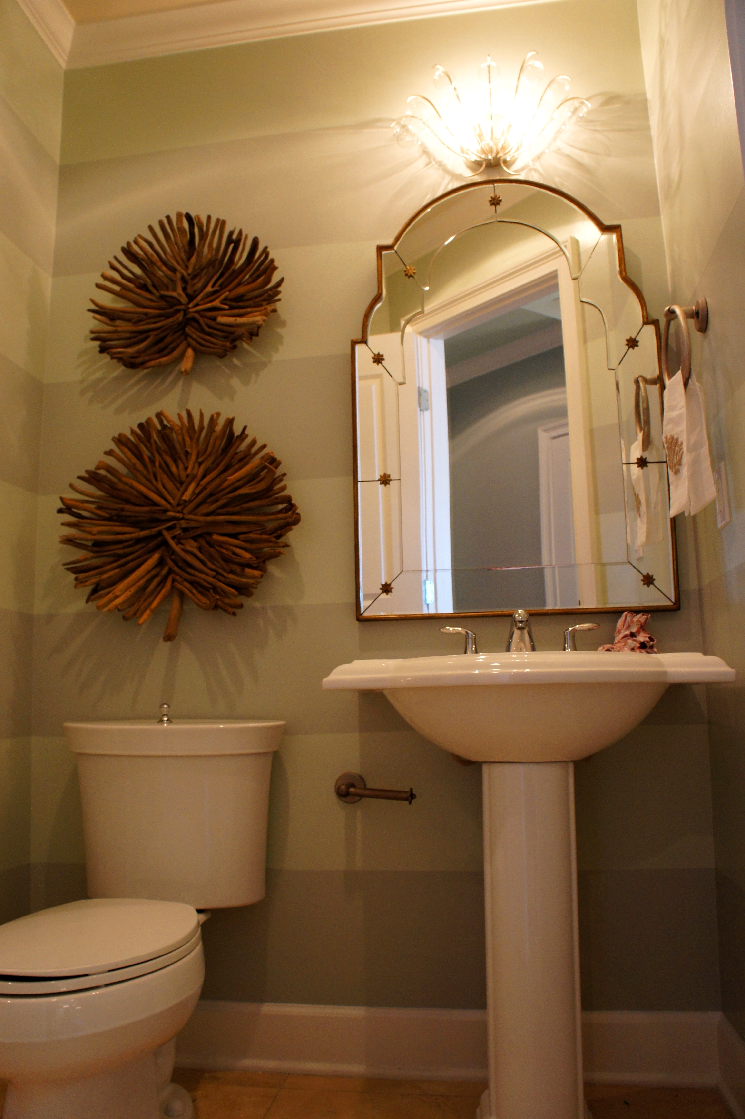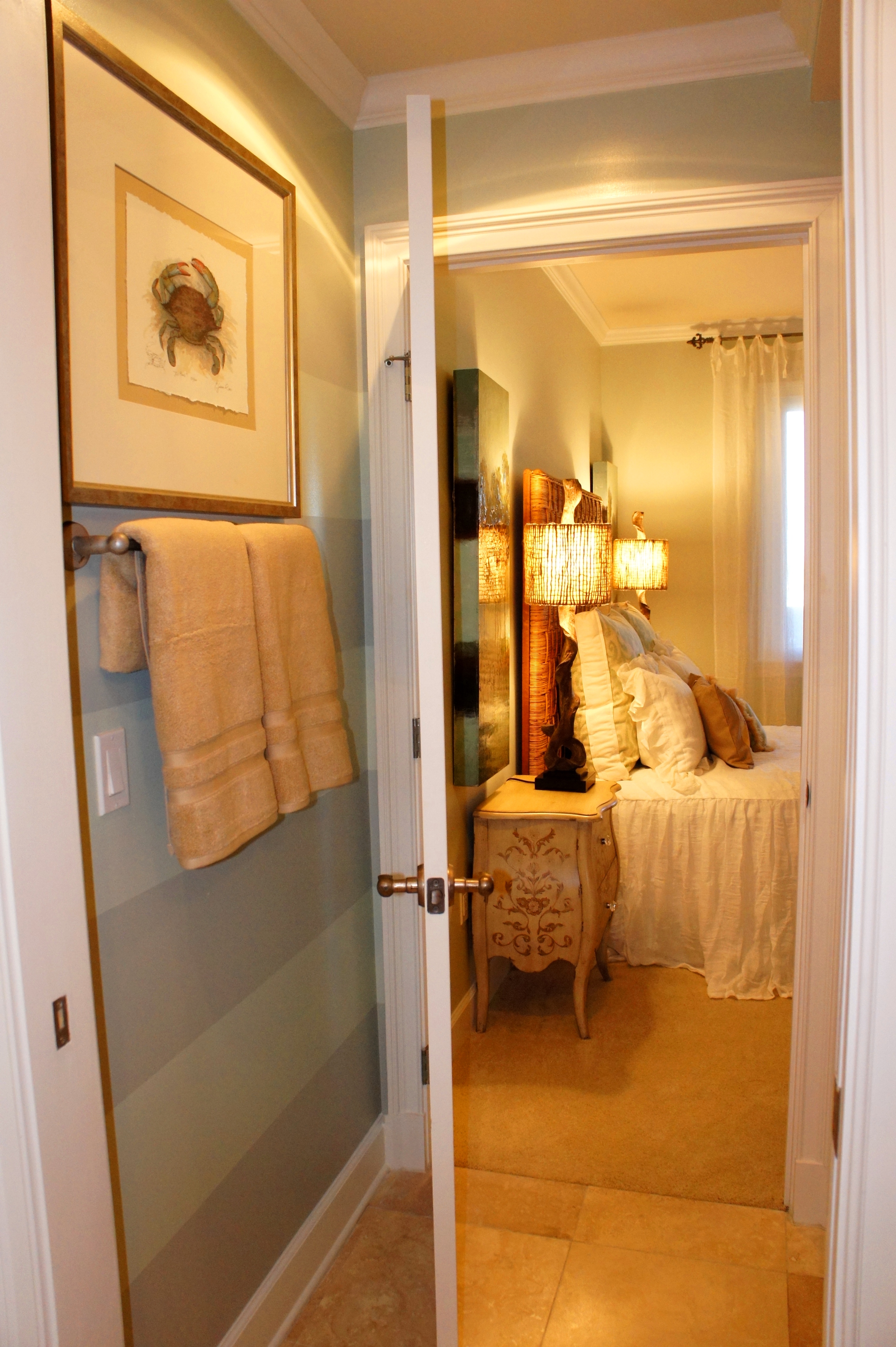 One way to dress your walls, without spending a whole lot of money on a fancy wallcovering, is to paint tone-on-tone stripes. This jazzes up plain walls, but is subtle enough to not compete with interesting wall art. When I was giving this unit to furnish, the walls were blank, and this room had not mirror or light. I dressed it with this arched mirror from Uttermost, and a glass droplet sconce from Currey and Company.