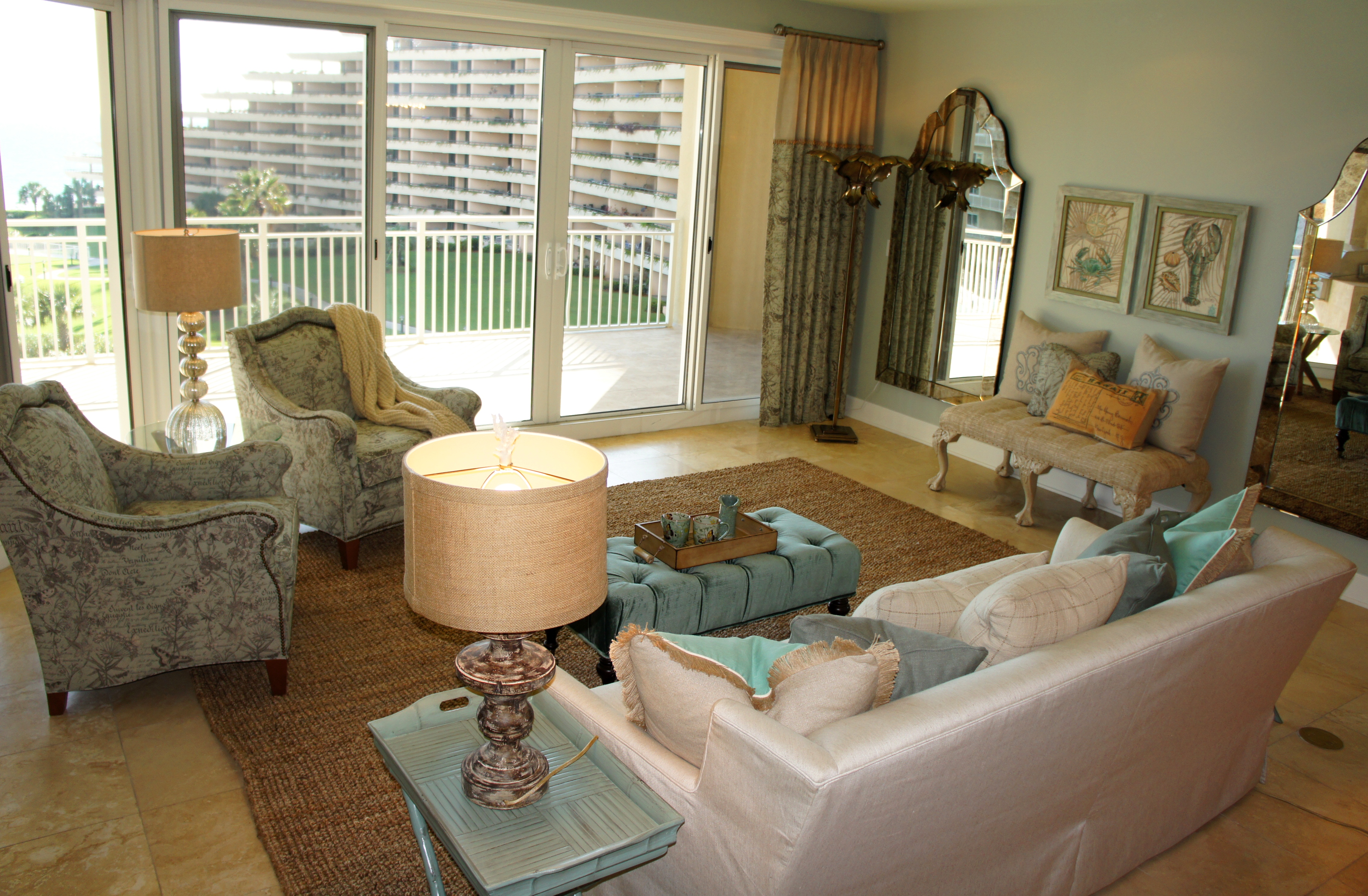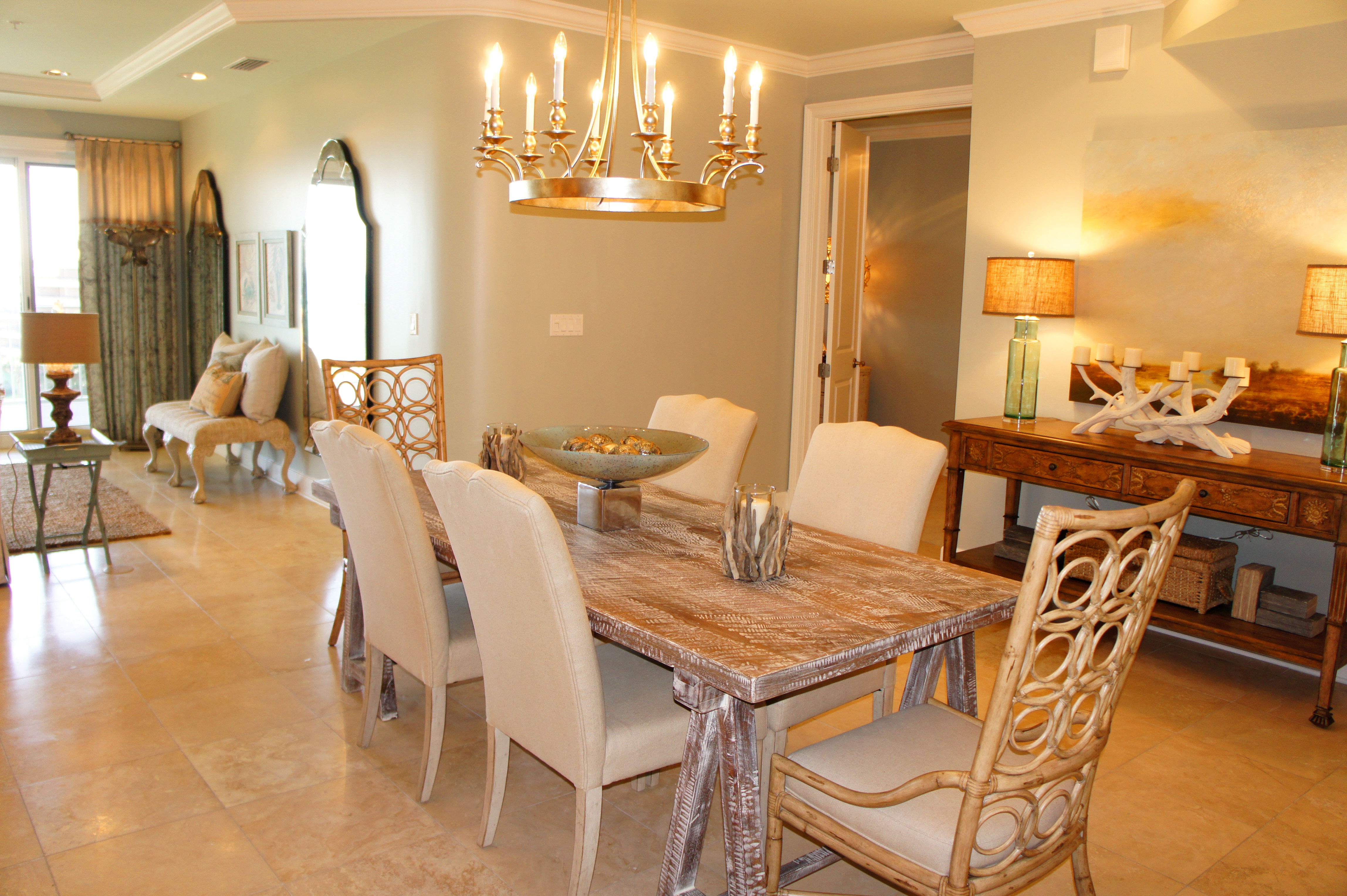 This is another fun condominium project from Grand Dunes! I had so much fun working with this client, who is a local realtor, and who has such fine taste! We loved pushing the envelope, by combining so many opposing finishes, such as gold and silver, warm and cool, colors and neutrals, sparkle and texture, modern and traditional, rich decadence and bohemian charm. The most striking theme throughout, however, would be the use of TEXTURE! Combining textures is such a wonderful way to create warmth and welcome.