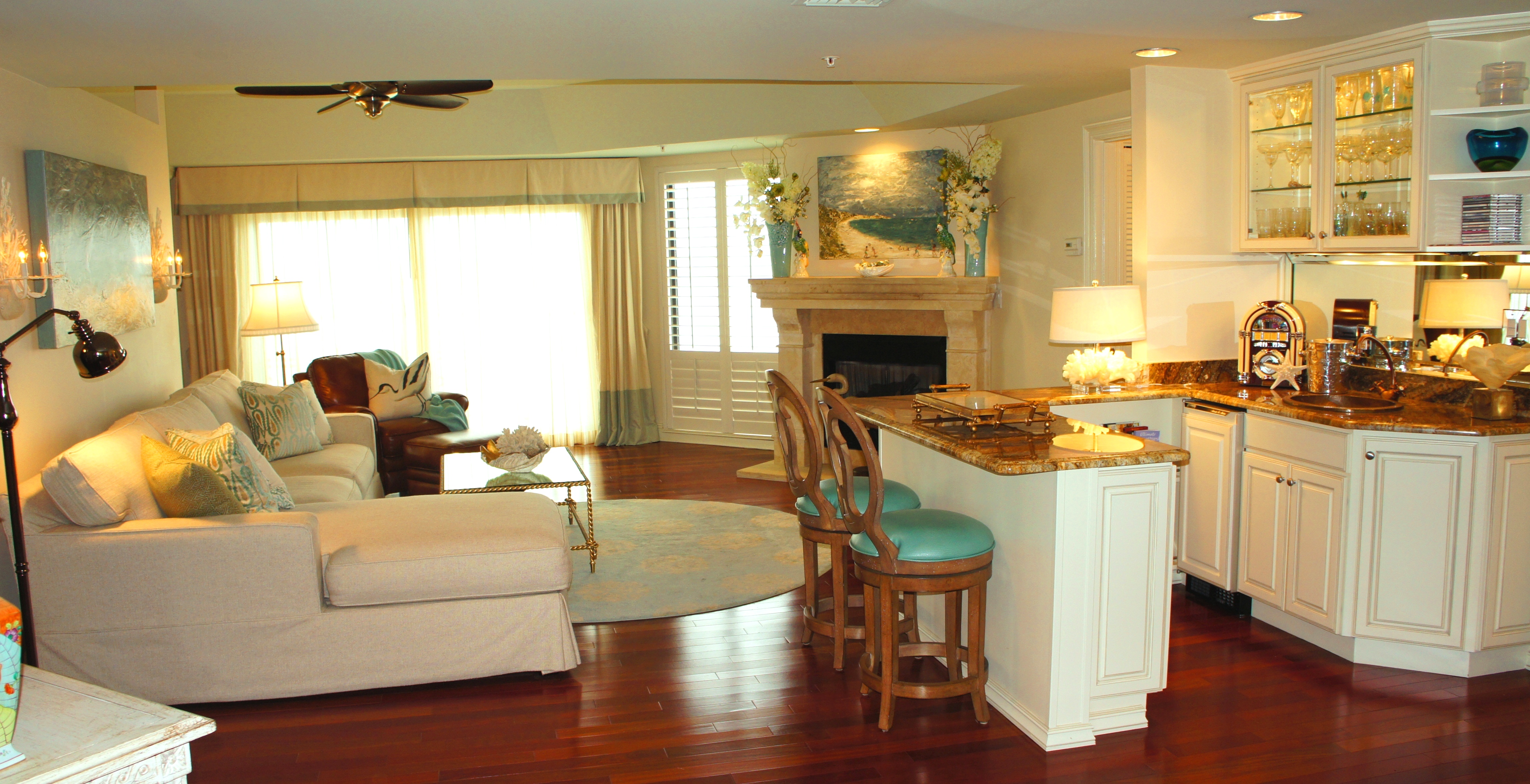 Before I began adding color and life to this place, it underwent a major facelift. The previous owner ran an antique shop, and had the place filled to the brim with antiques; walls were knocked down, and every surface was lightened and brightened. My clients wanted to maximize the view, the light, and the space!