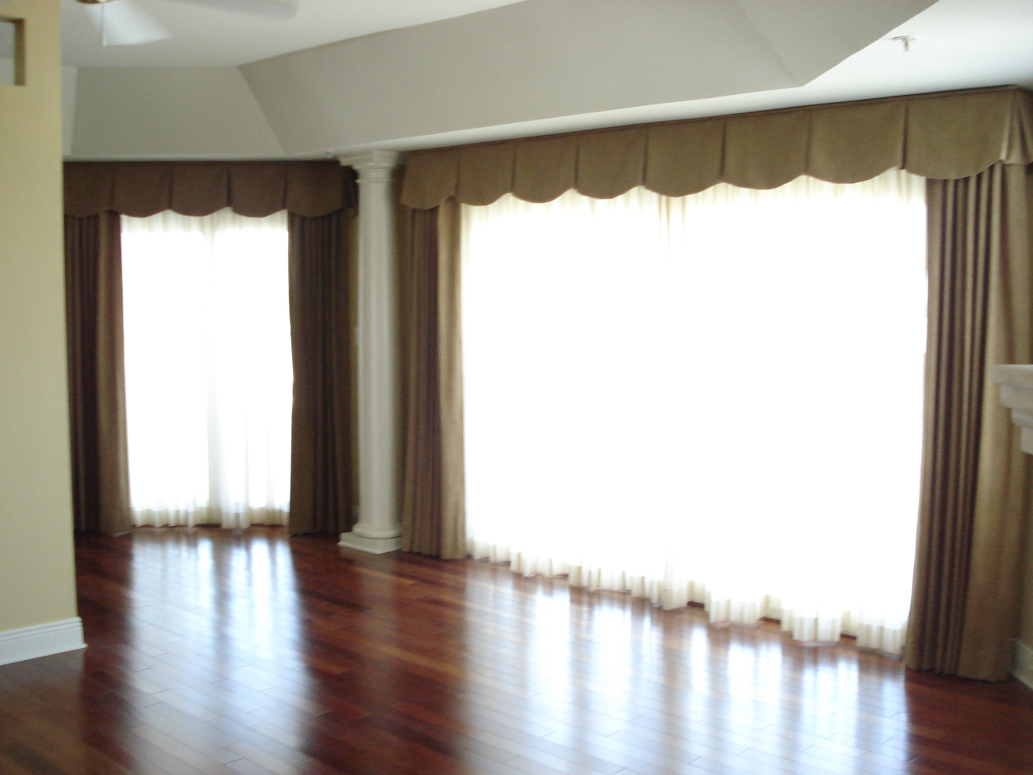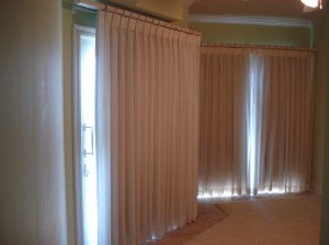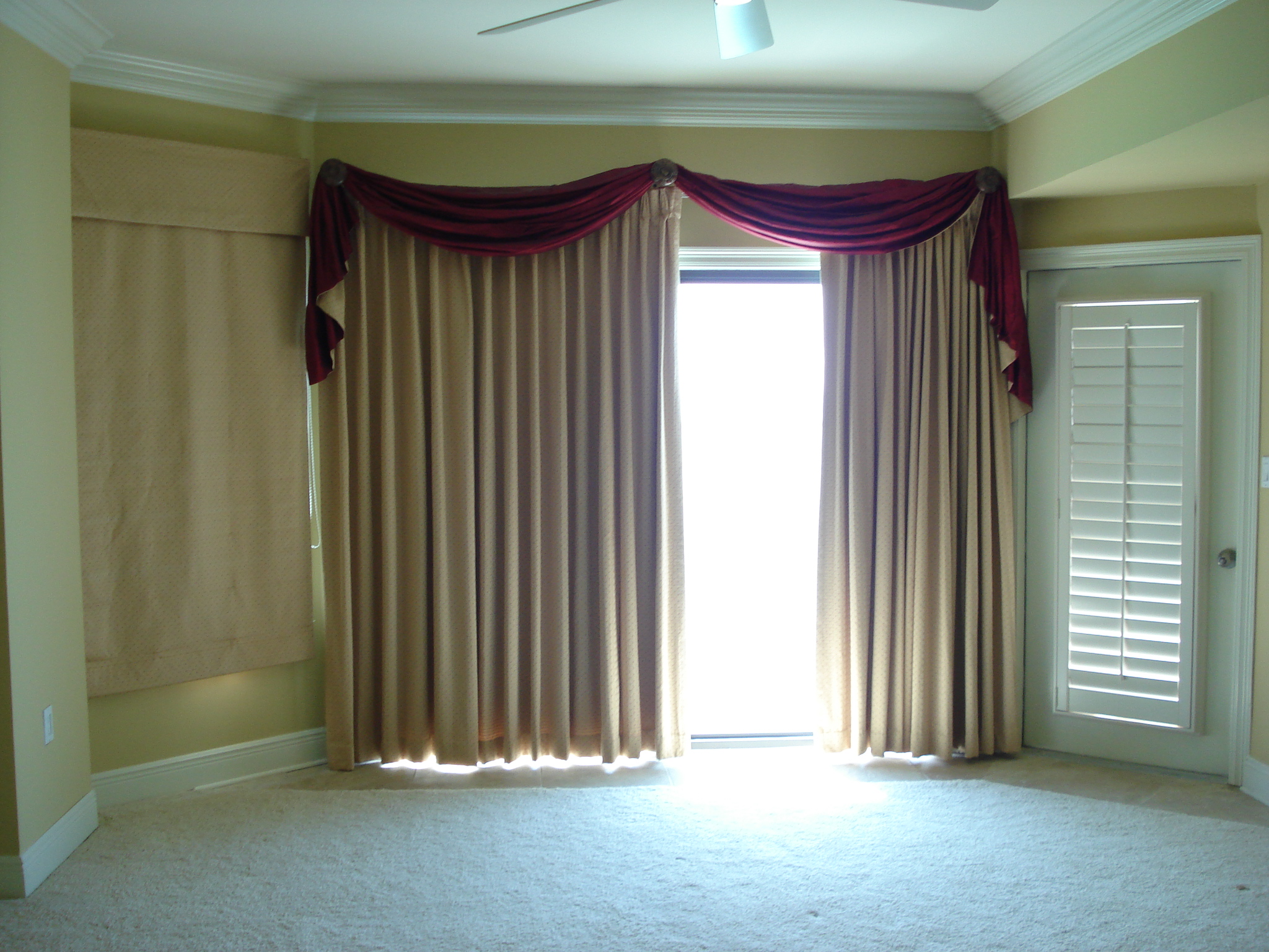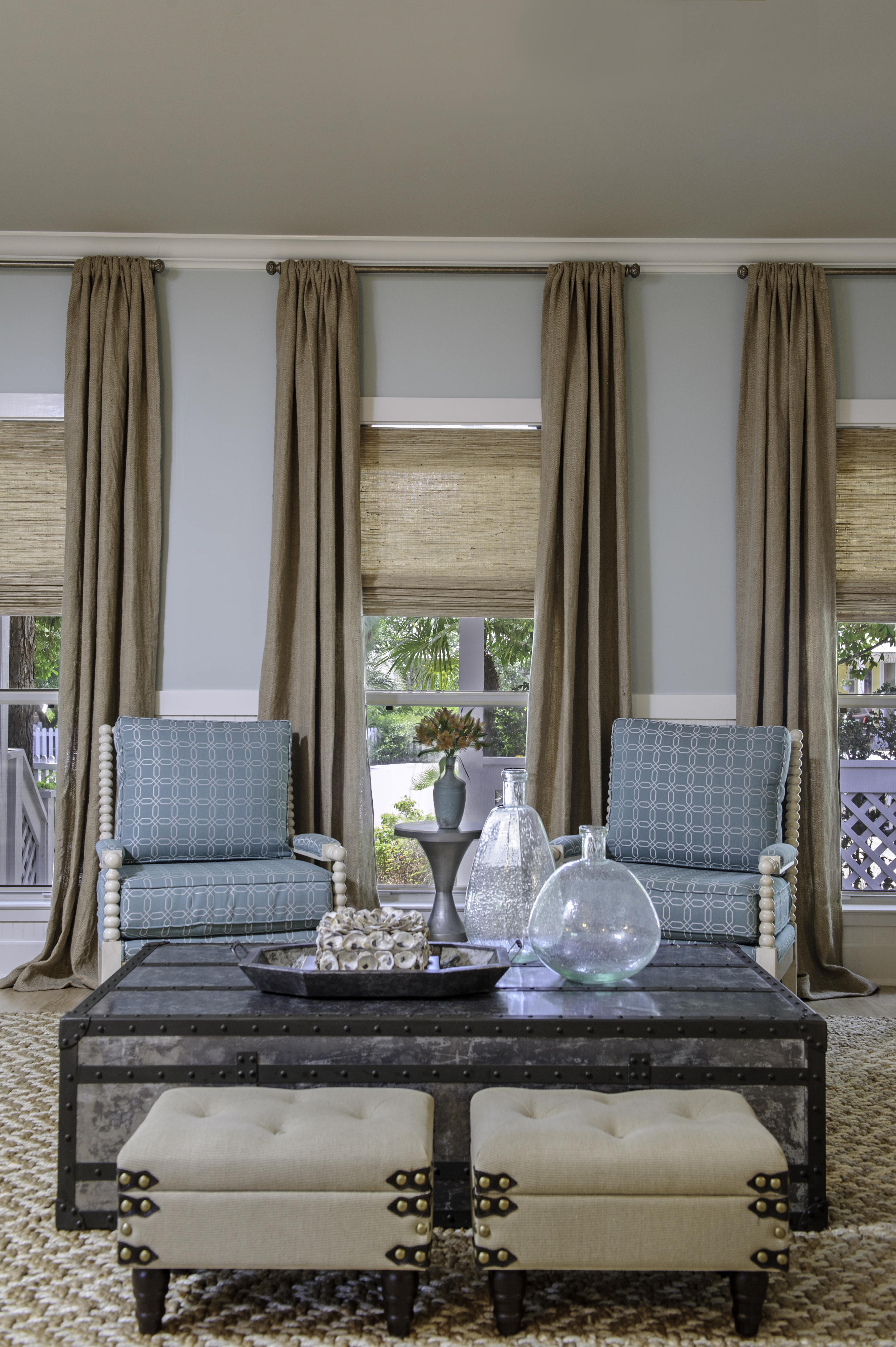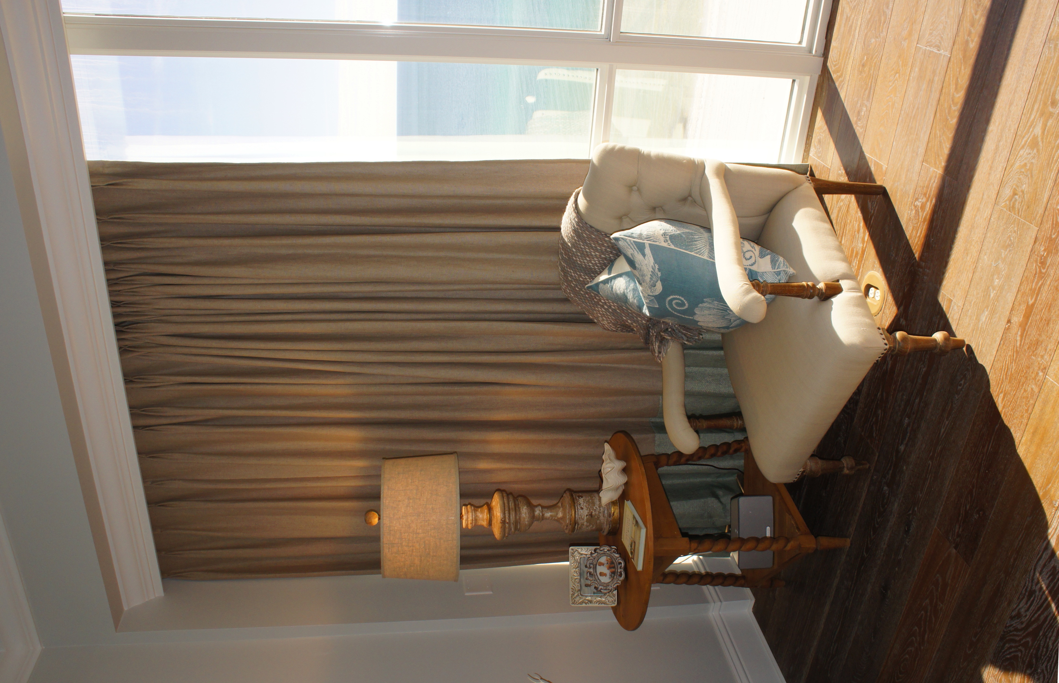 I chose a solid cream linen for the drapes, and banded it in blue for a slight pop of color.