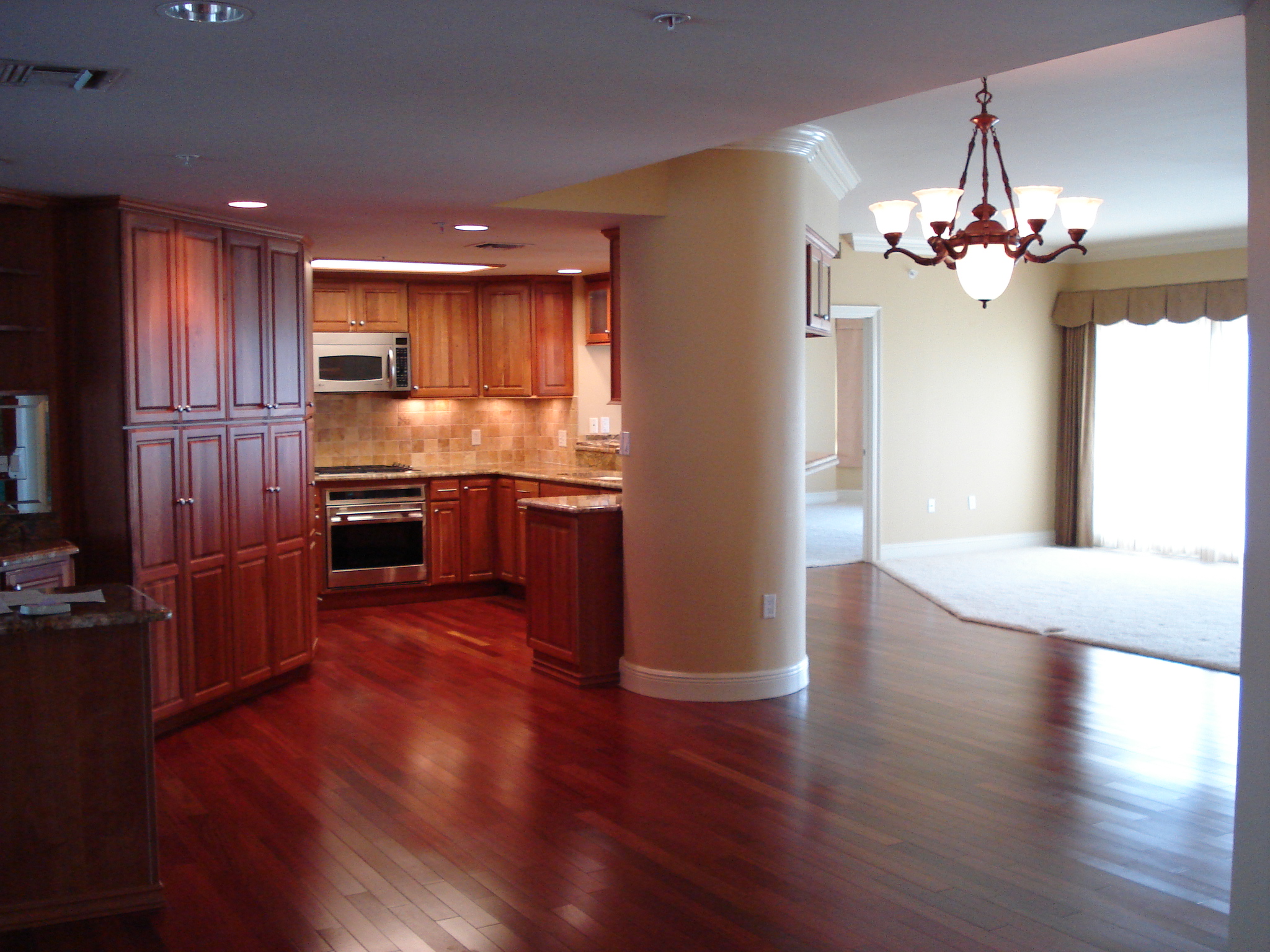 Confronting a large, open and empty space can seem daunting at first, but I see it only as a room full of possibilities. One way to define specific areas in a large open space is to use one piece of furniture in each area that is weighty, contrasting, and acts as an “anchor”. In this case, the living room is anchored by the entertainment unit, and the Dining Room by the black and gold Drexel Heritage china/curio cabinet. Rugs and light fixtures are also easy ways to define a space.