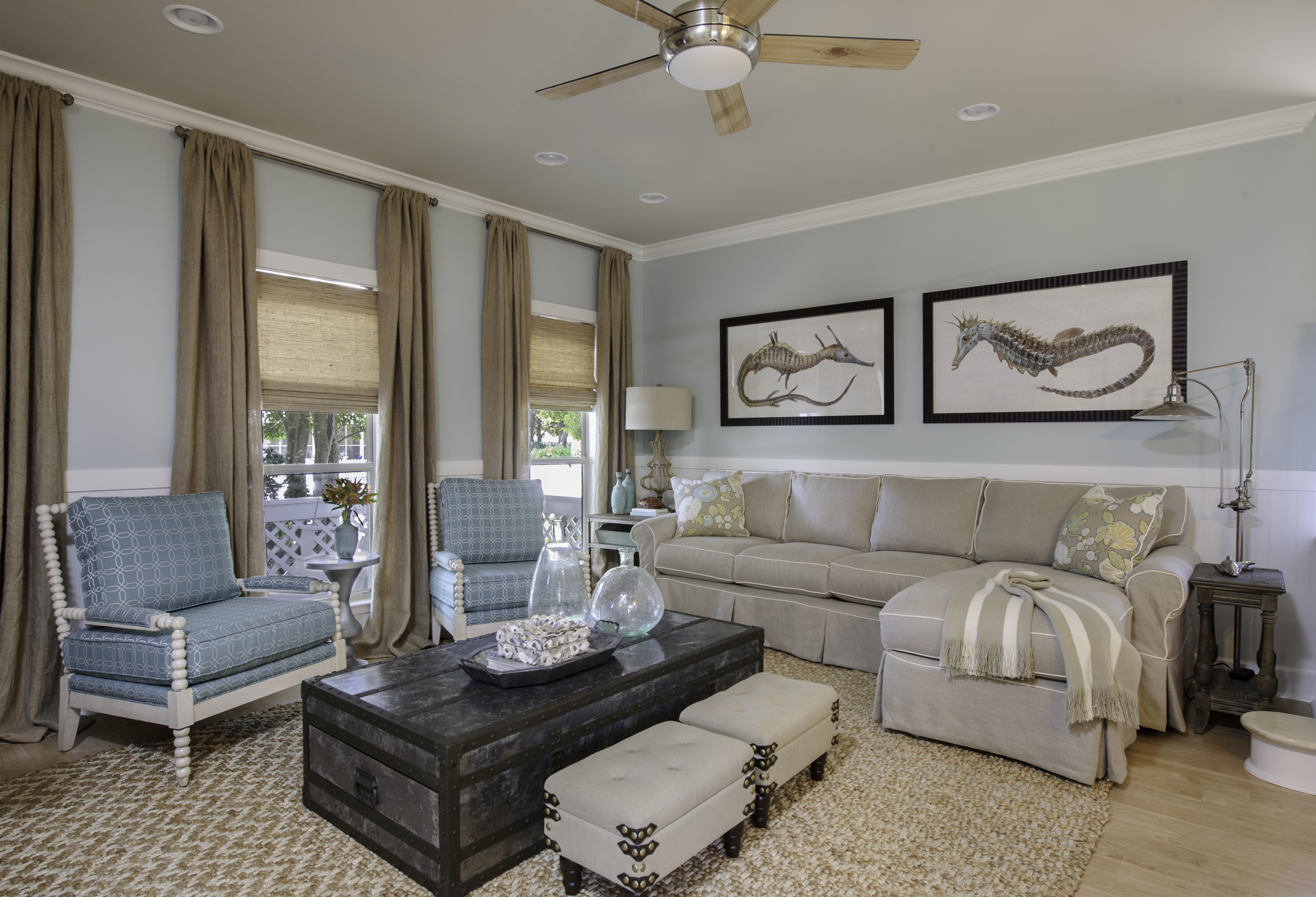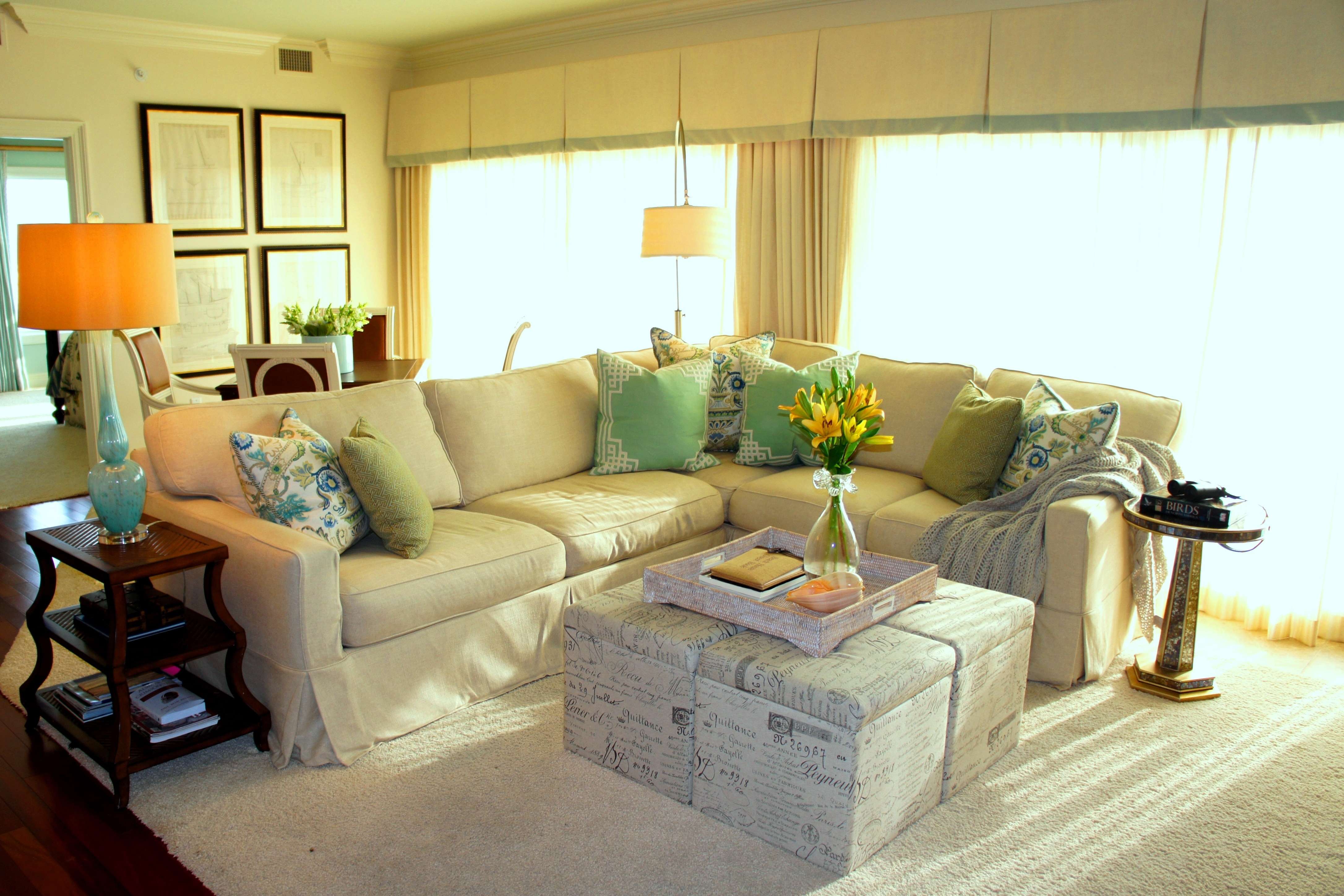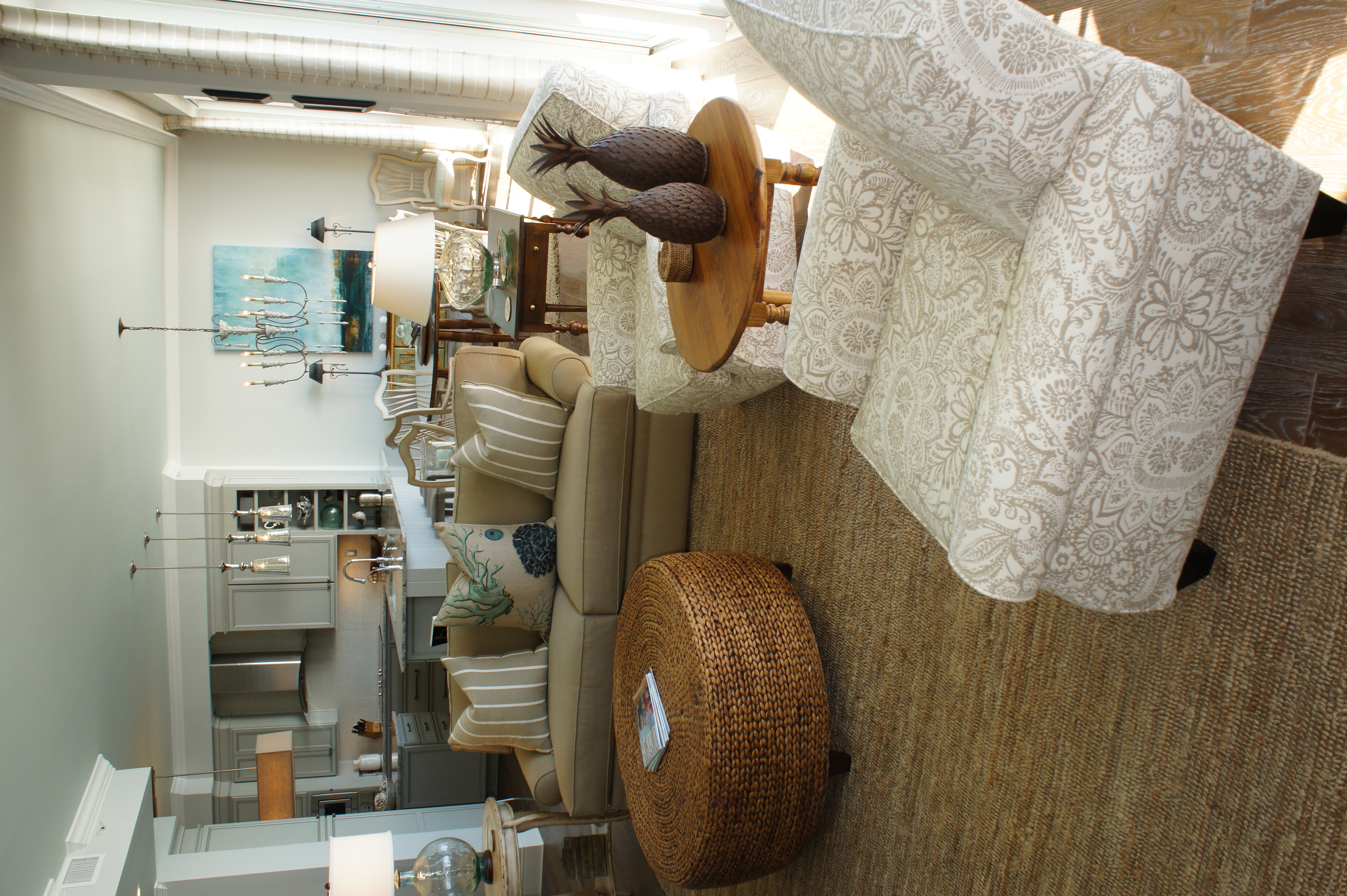 This is the Living Room. The natural linen fabrics of the sofa and swivel chairs were made more sophisticated by the clean lines, bench seat cushion and waterfall skirts. The large jute area rug was topped with a hand-woven wool and silk area rug that pulled in some color. This is a great way to anchor a large space and achieve richness without breaking the bank. After all, layering is not just for fashion!