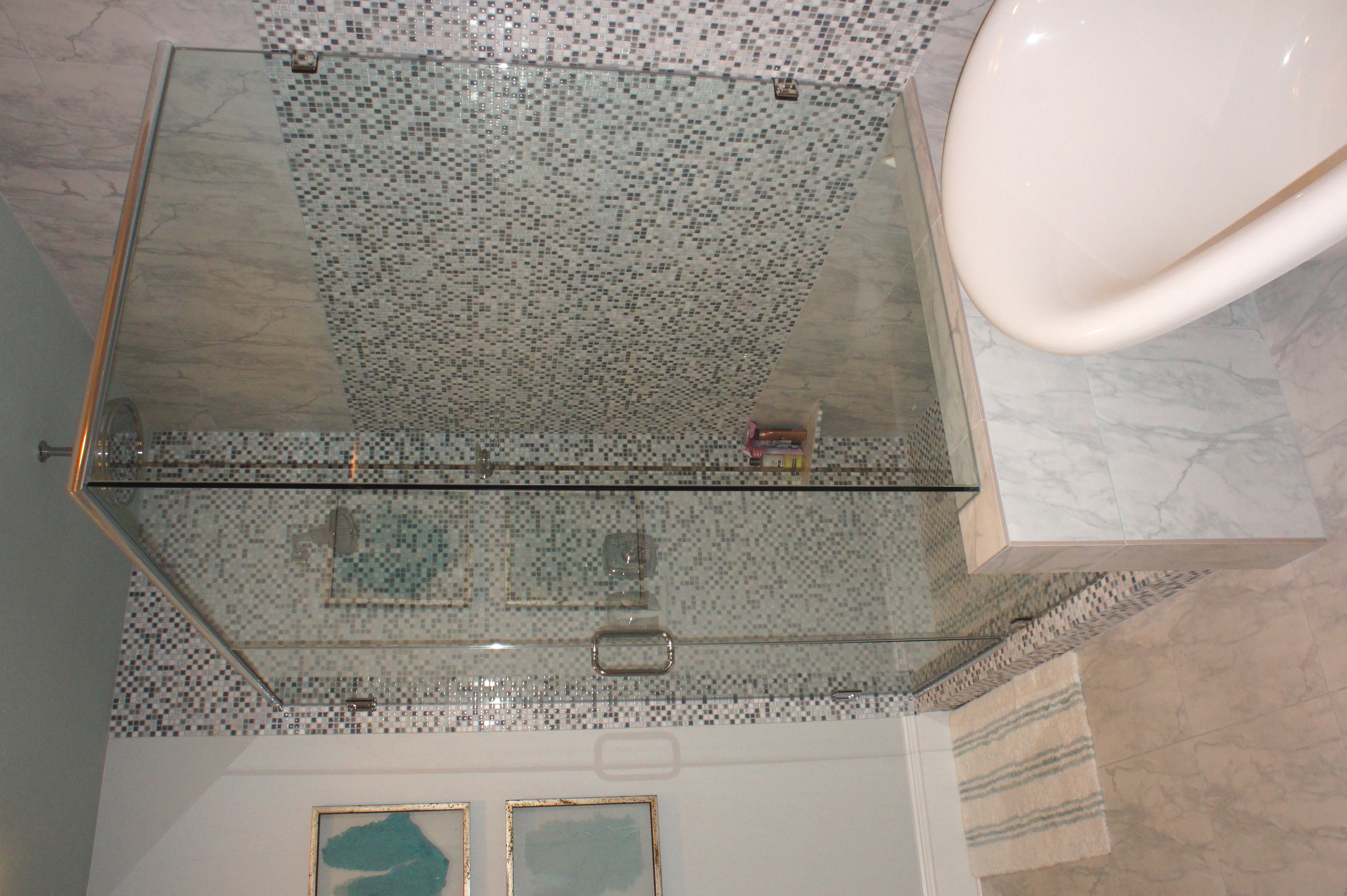 In this picture, you can see the trim I used for the ends of the long body pillow. Also visible, is the custom shower curtain, sewn with large blocks of blue, cream and silver. The towels have embroidered sliver greek key borders.