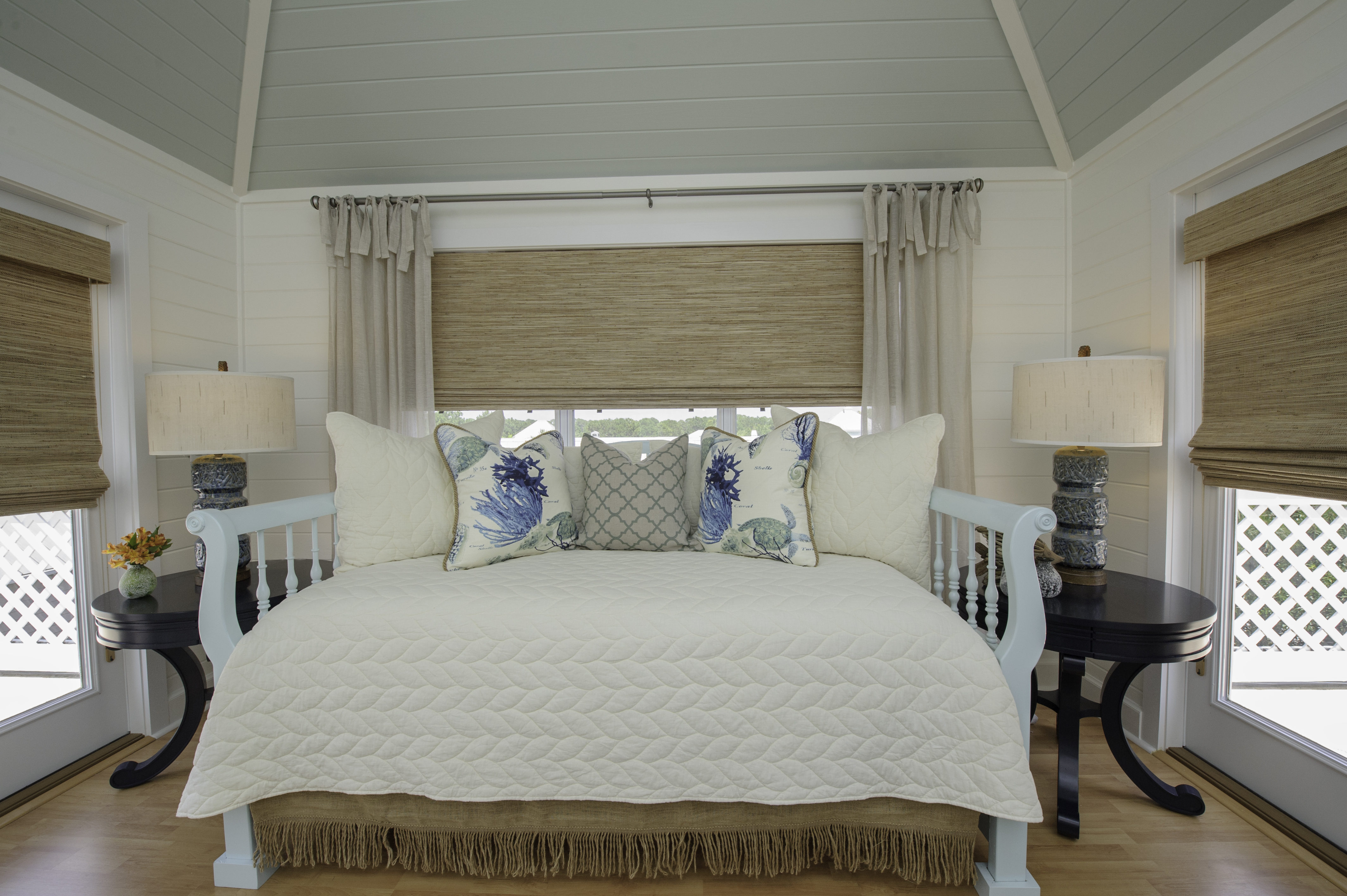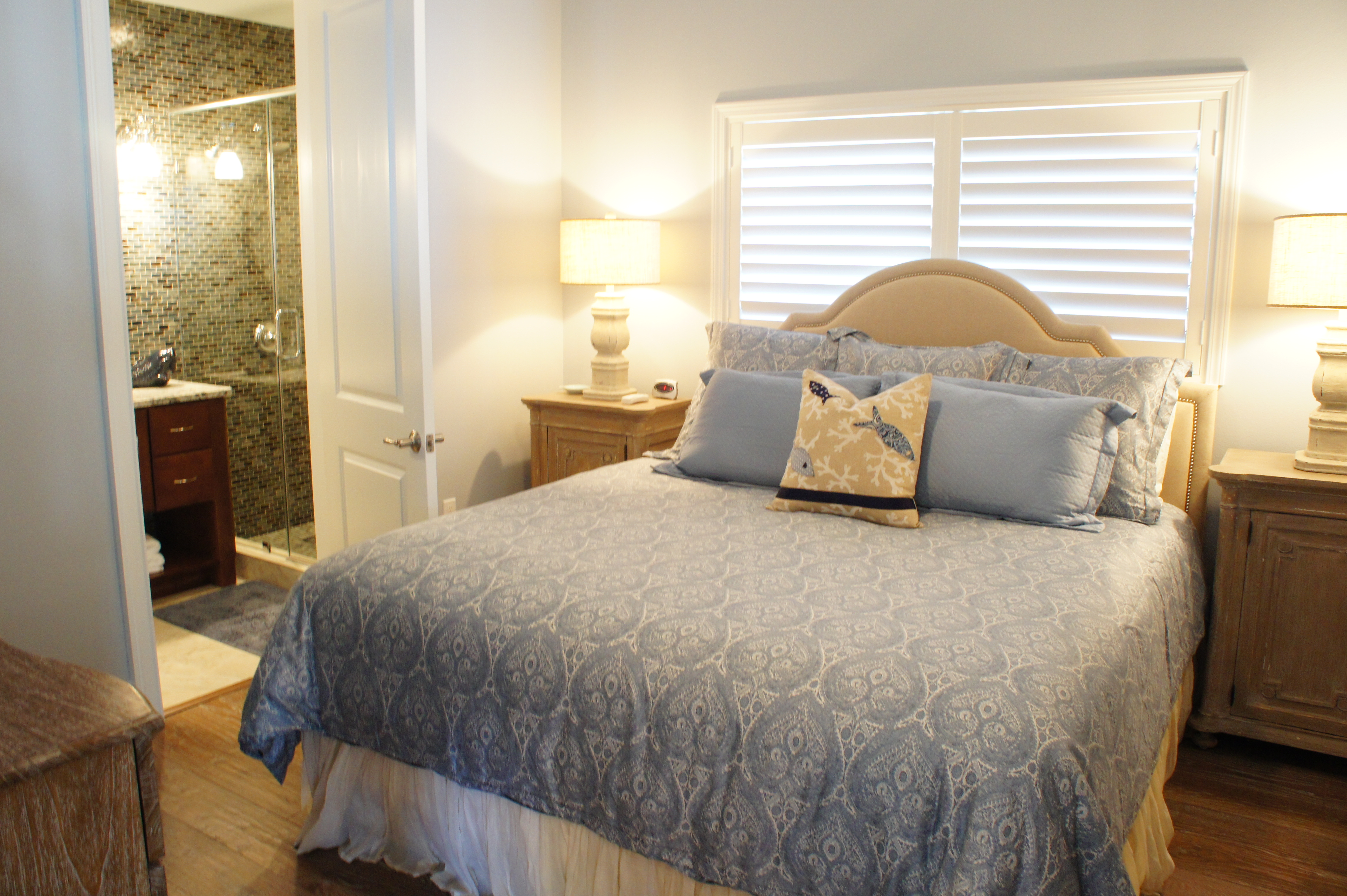 This is the guest bedroom in my “Coastal Chic” unit. I love the juxtaposition of the soft, plush & refined damask fabric, with the textured headboard and pleated jute bedskirt.